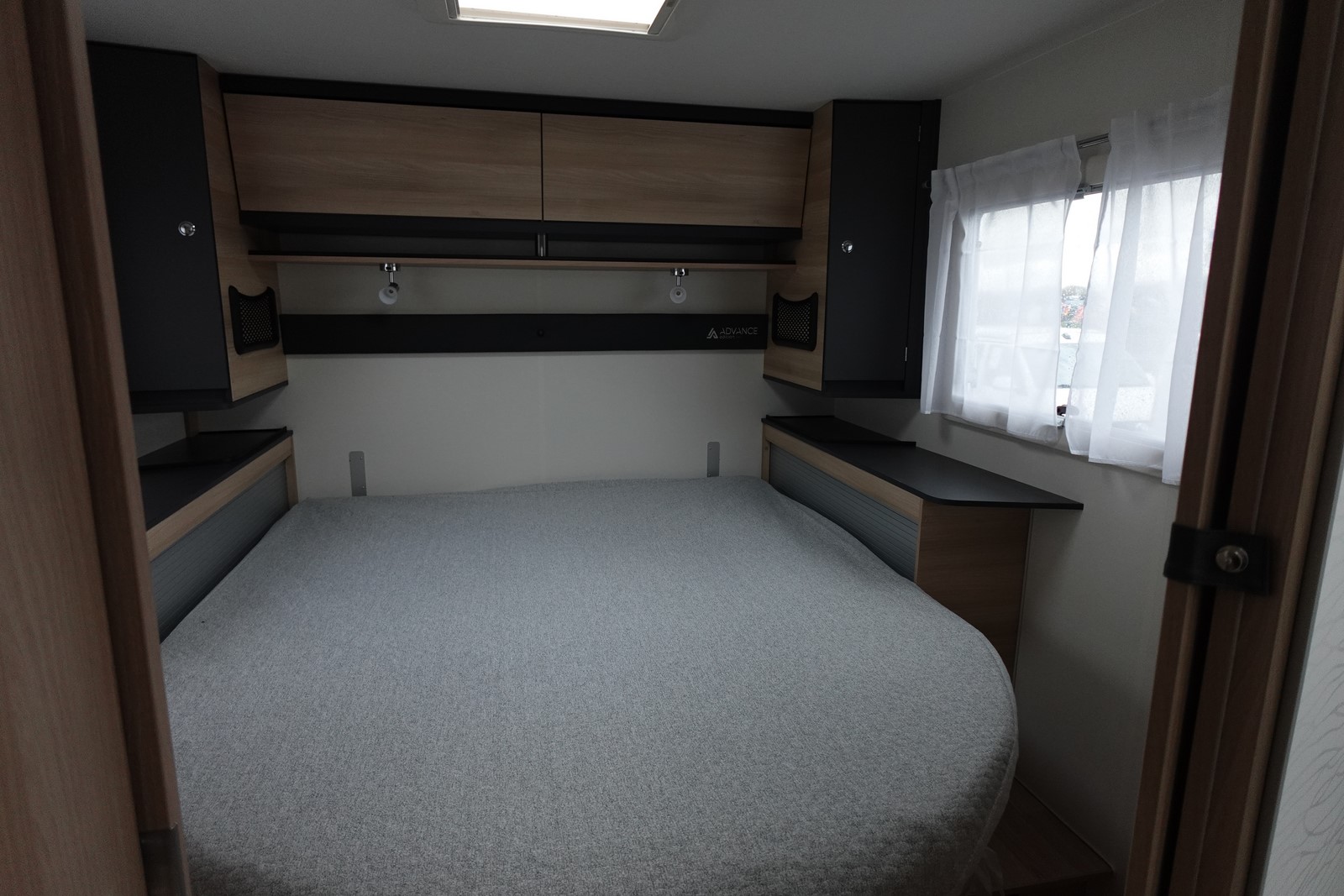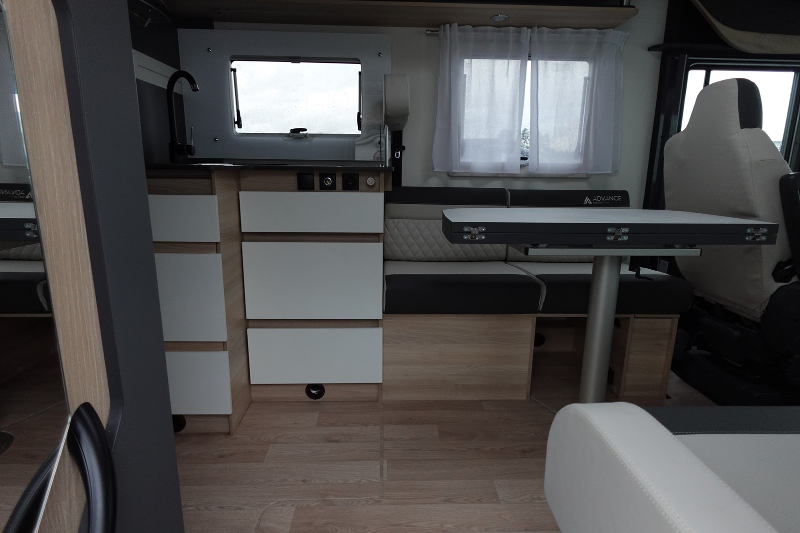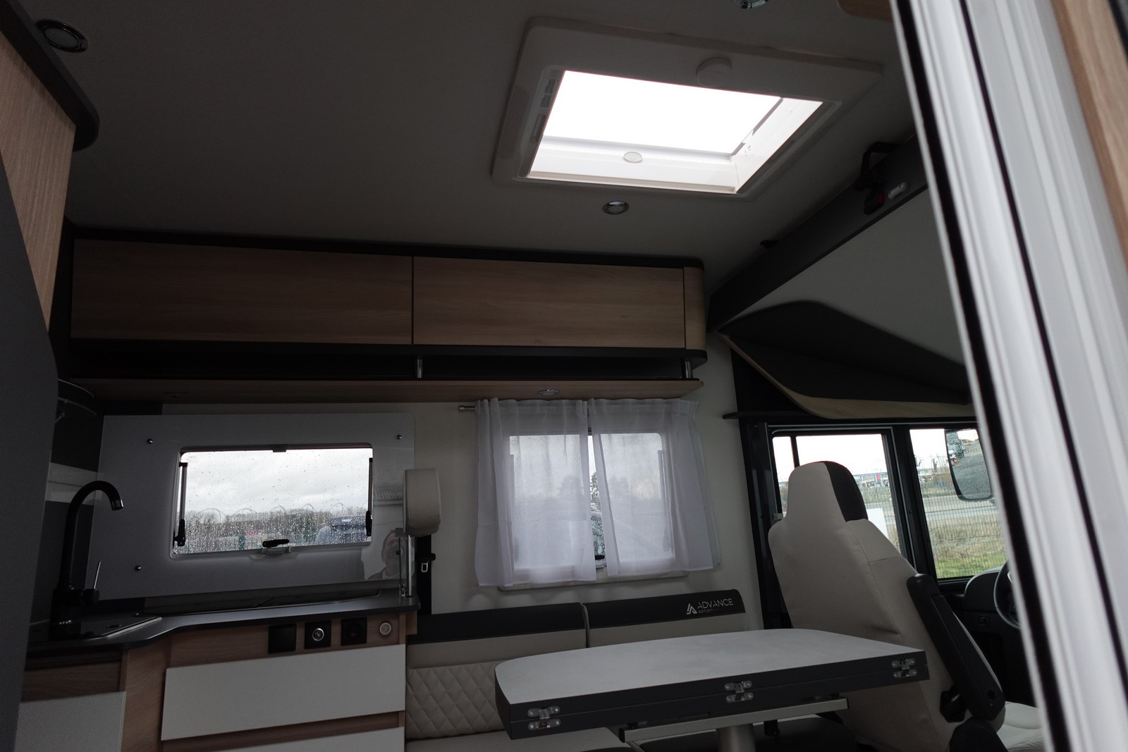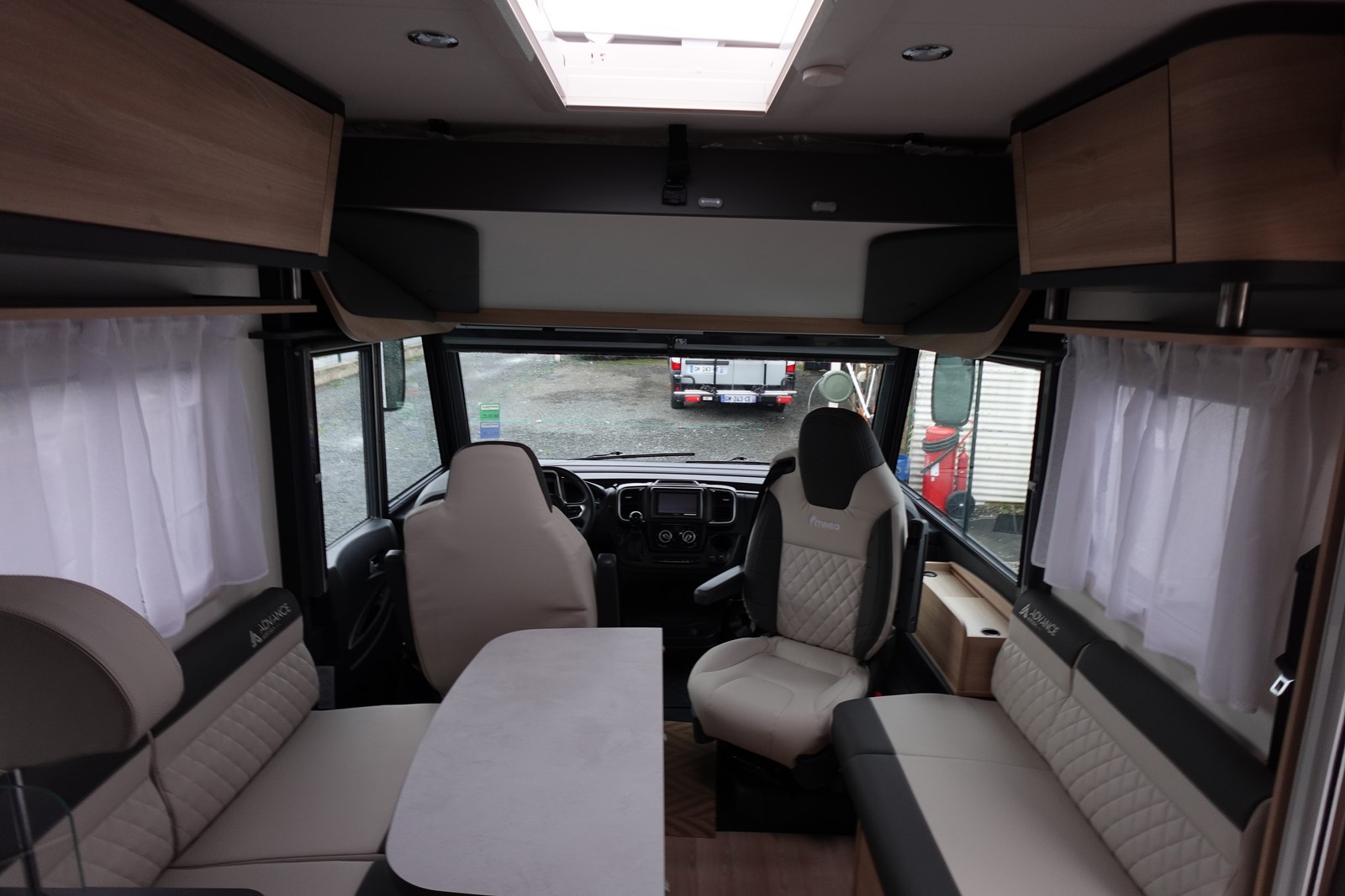 Intégral comprenant un salon avant panoramique avec banquettes face/face, une douche indépendante de l’espace WC / lavabo, un lit central réglable en hauteur, un lit de pavillon 2 places et une cuisine en L avec de nombreux rangements.