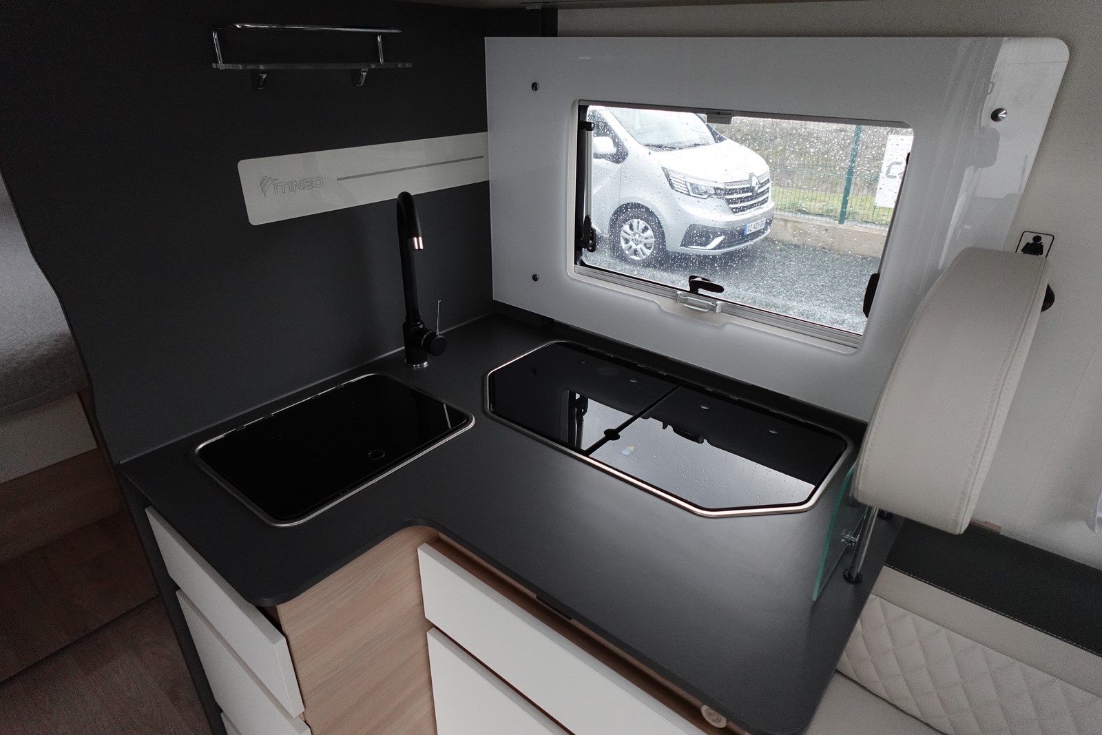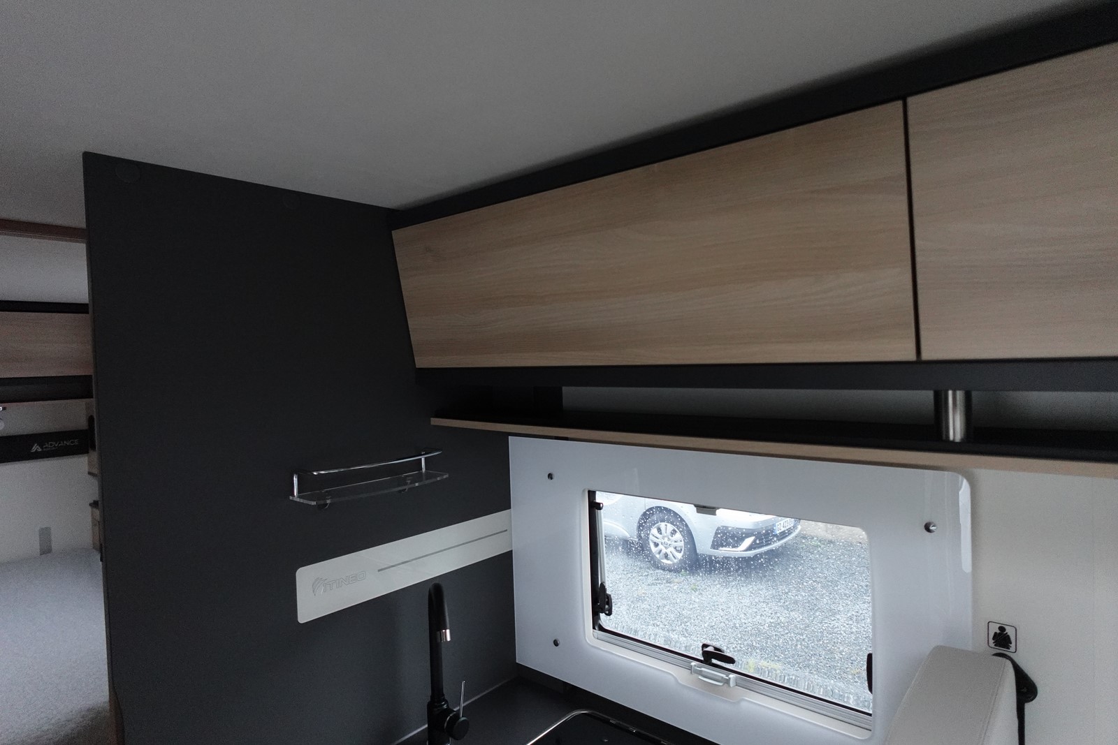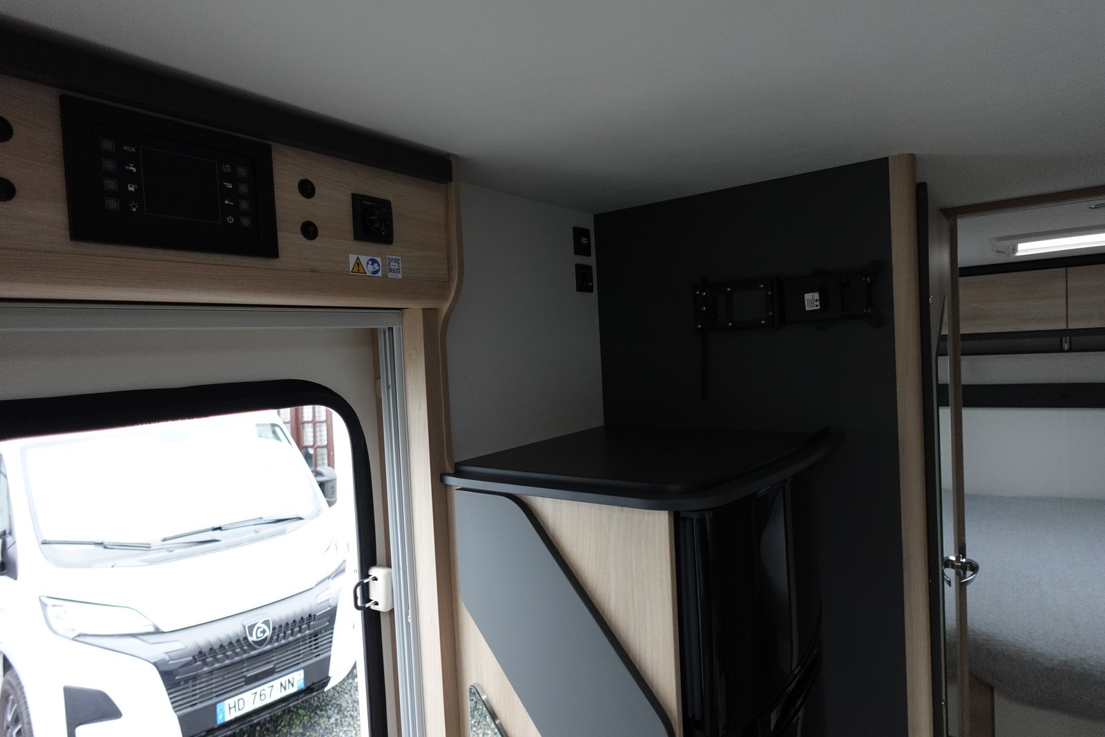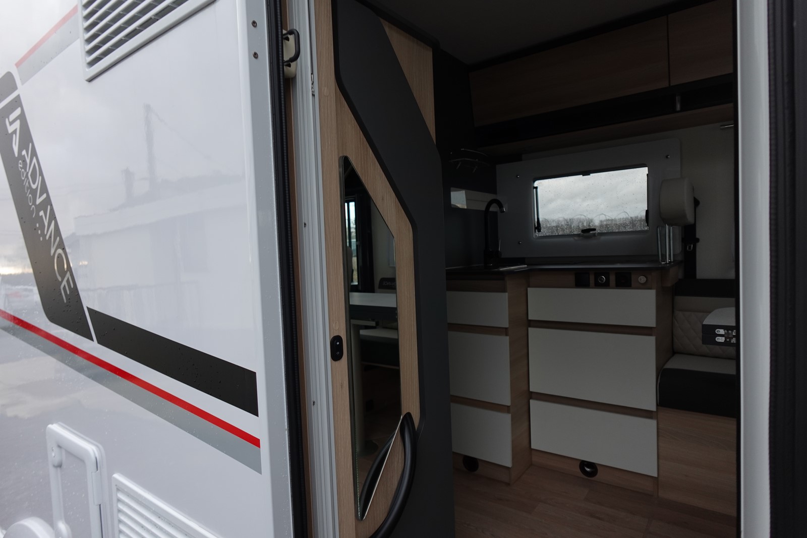 Intégral comprenant un salon avant panoramique avec banquettes face/face, une douche indépendante de l’espace WC / lavabo, un lit central réglable en hauteur, un lit de pavillon 2 places et une cuisine en L avec de nombreux rangements.