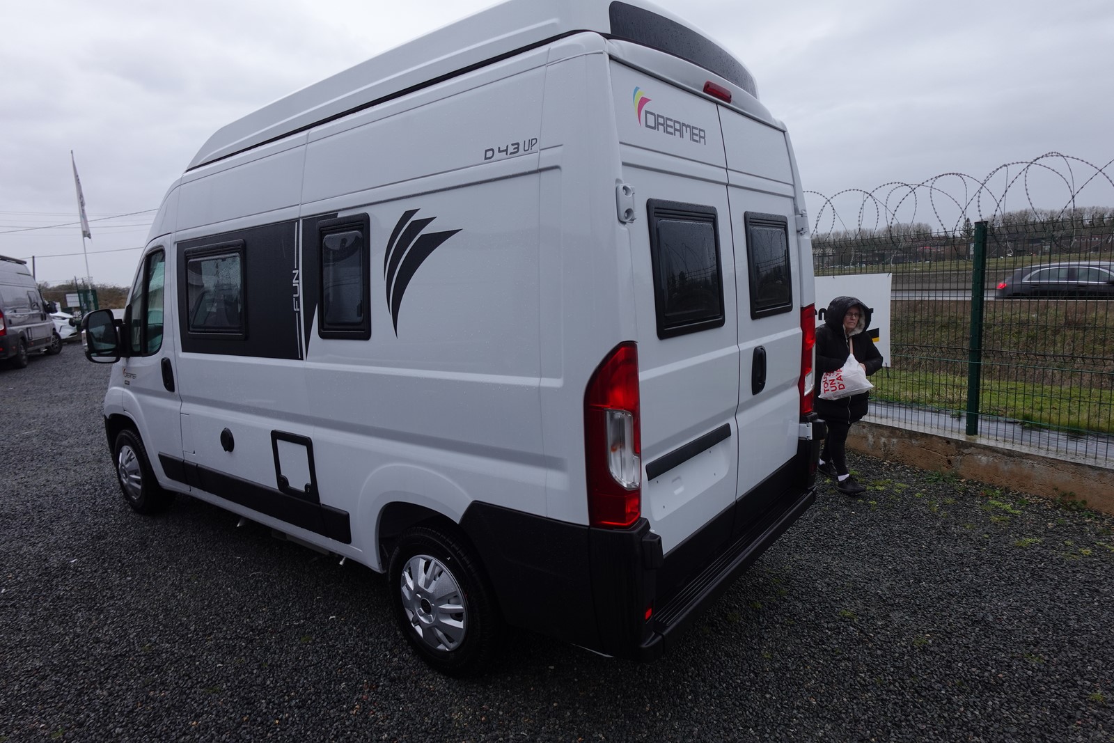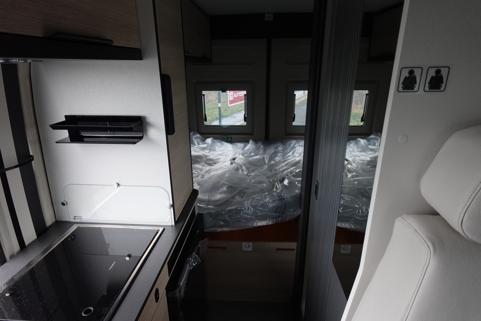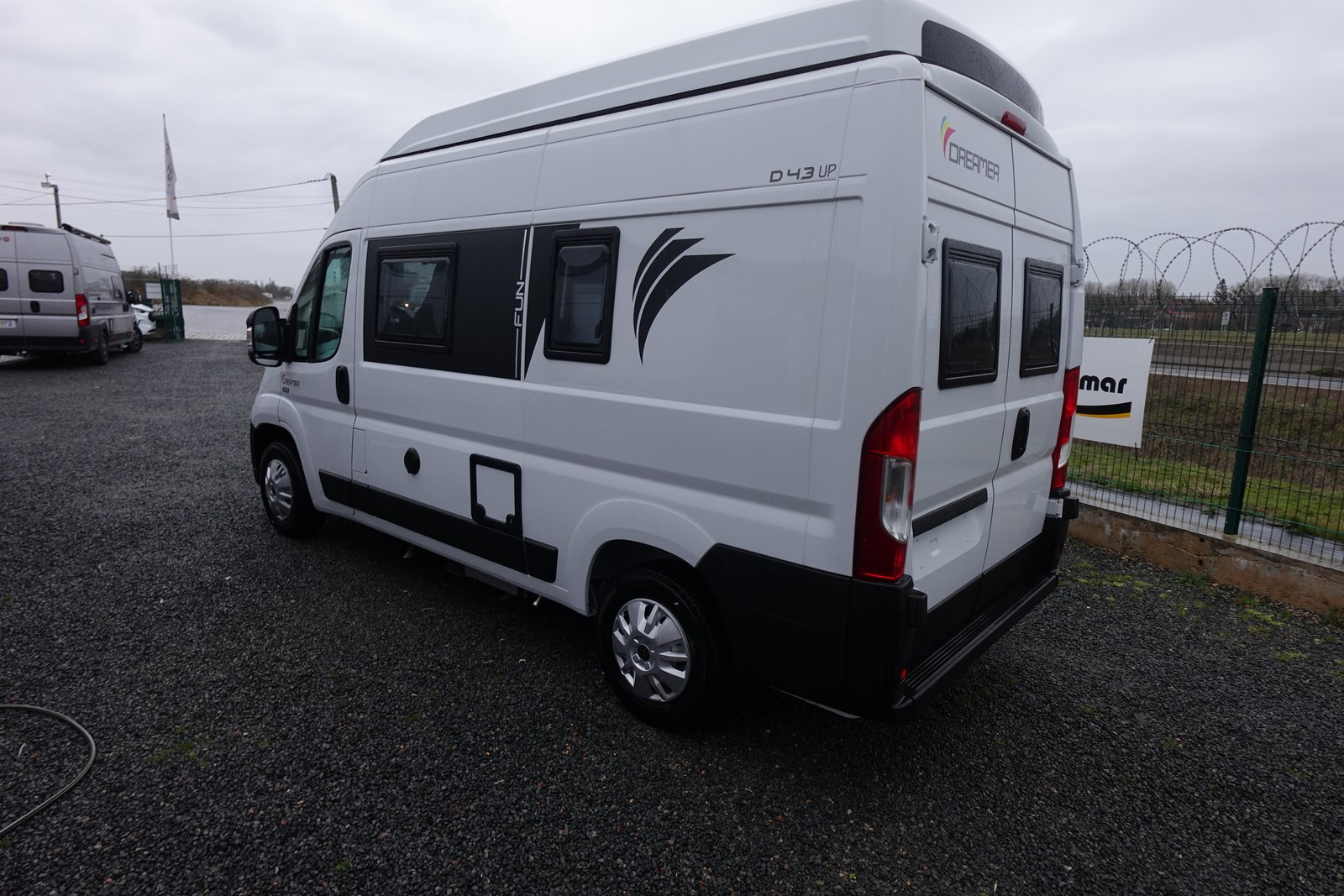 Fourgon aménagé comprenant un salon avant panoramique, un réfrigérateur, une salle d’eau avec douche et WC, un toit relevable avec couchage 2 places, une cuisine avec de nombreux rangements et un lit arrière transversal. Le tout en 5.41 m de long