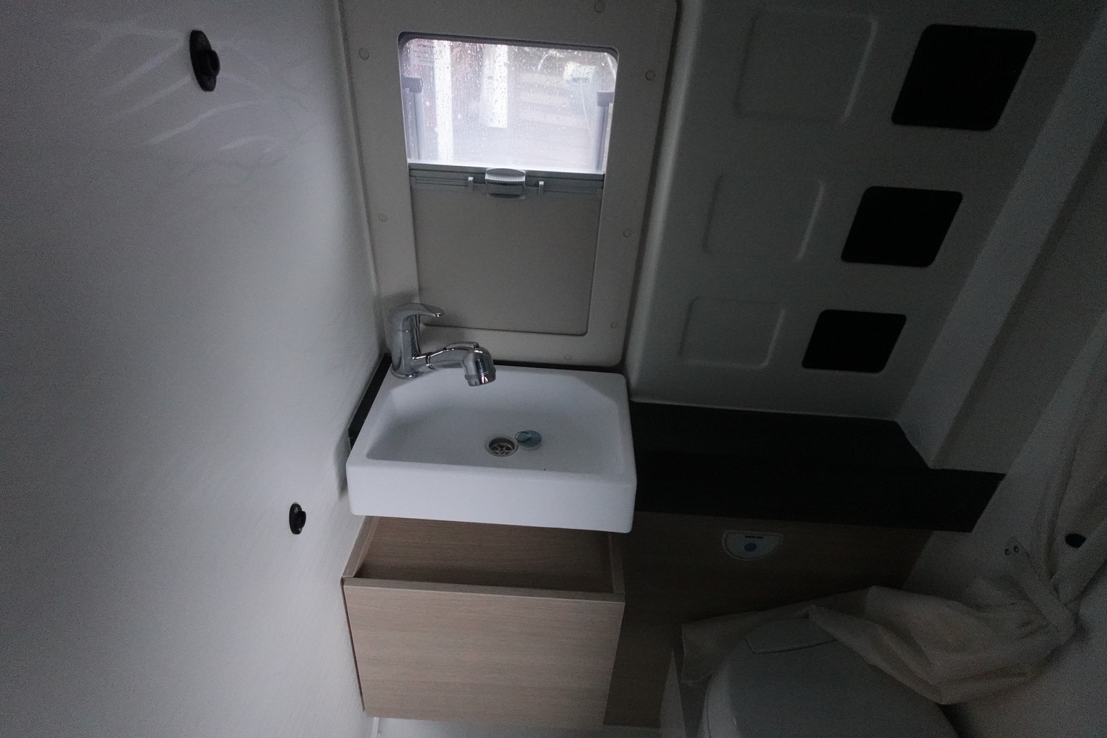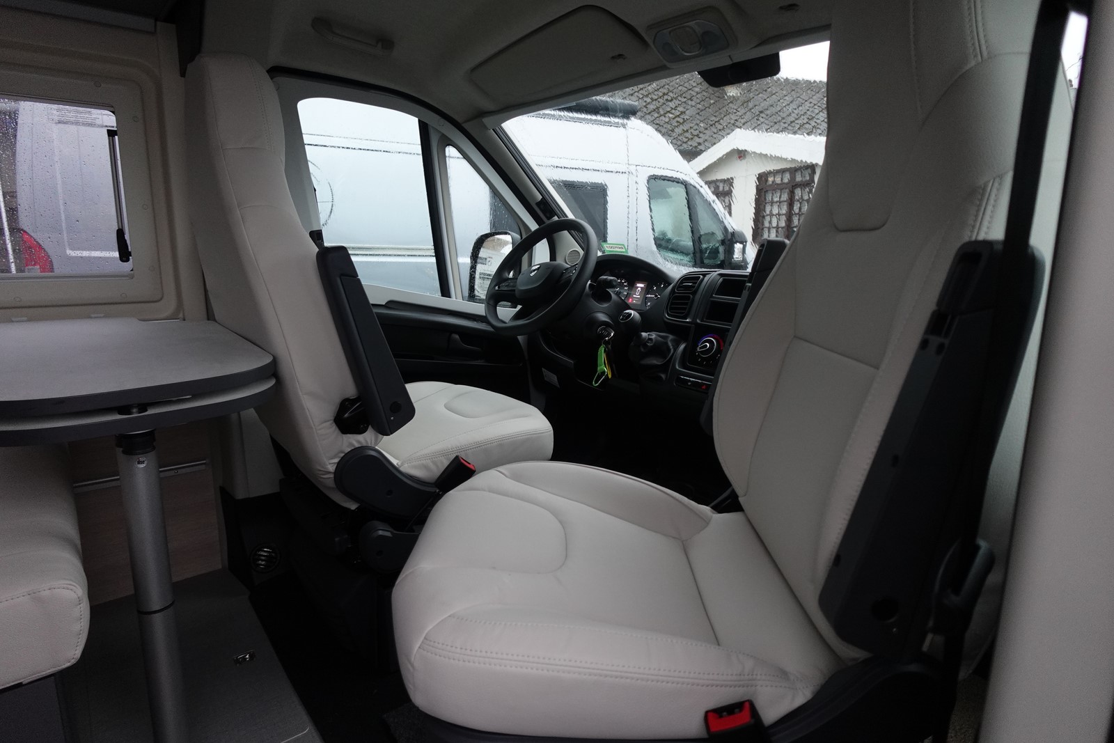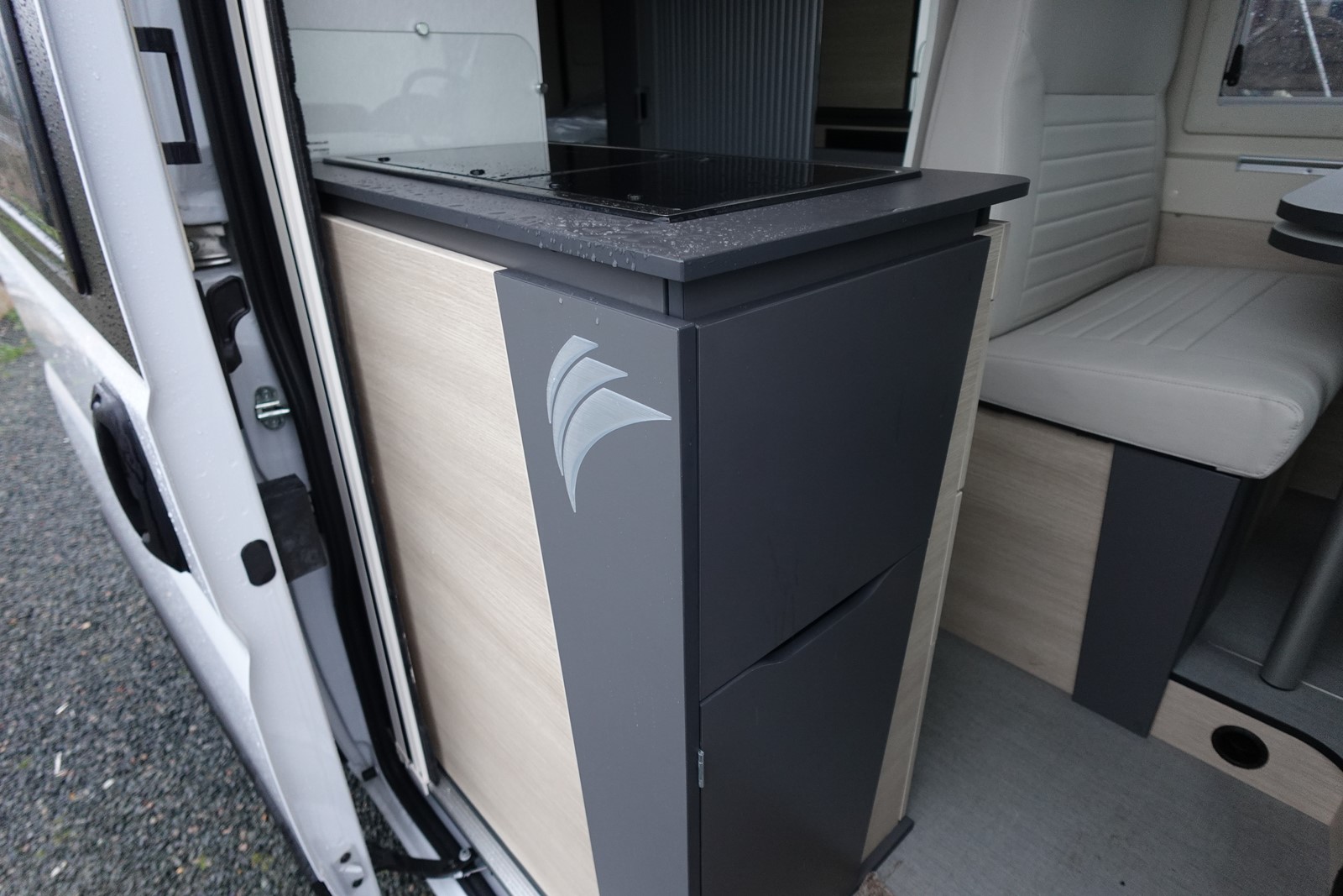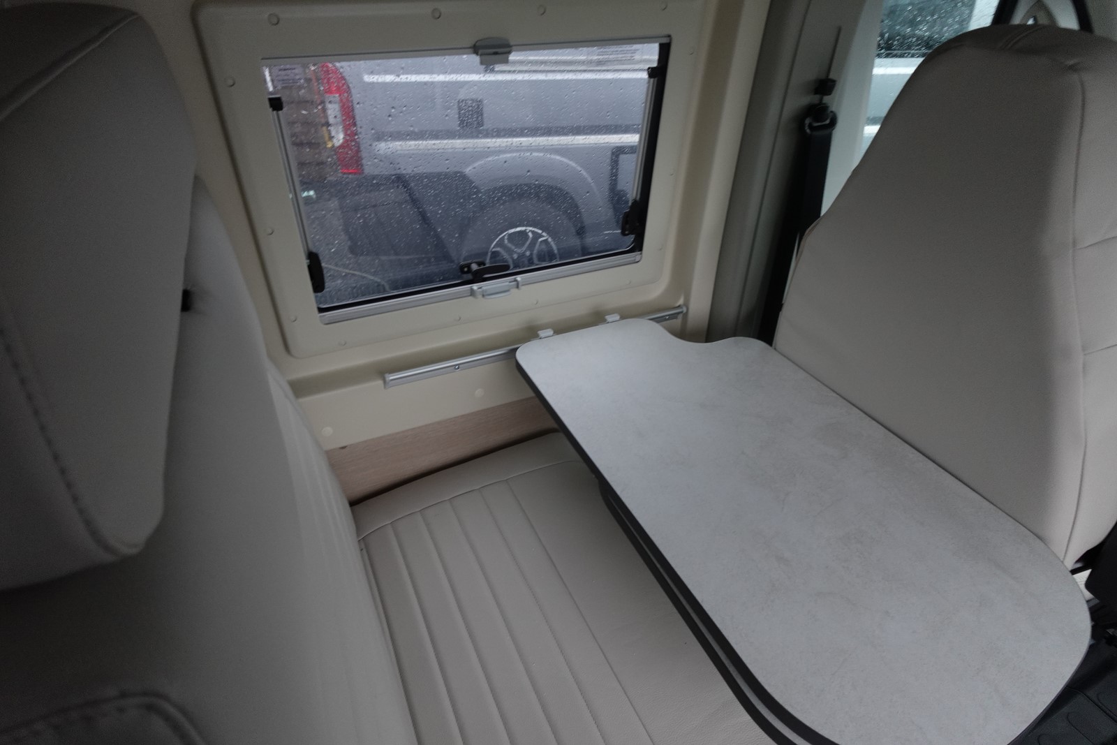 Fourgon aménagé comprenant un salon avant panoramique, un réfrigérateur, une salle d’eau avec douche et WC, un toit relevable avec couchage 2 places, une cuisine avec de nombreux rangements et un lit arrière transversal. Le tout en 5.41 m de long