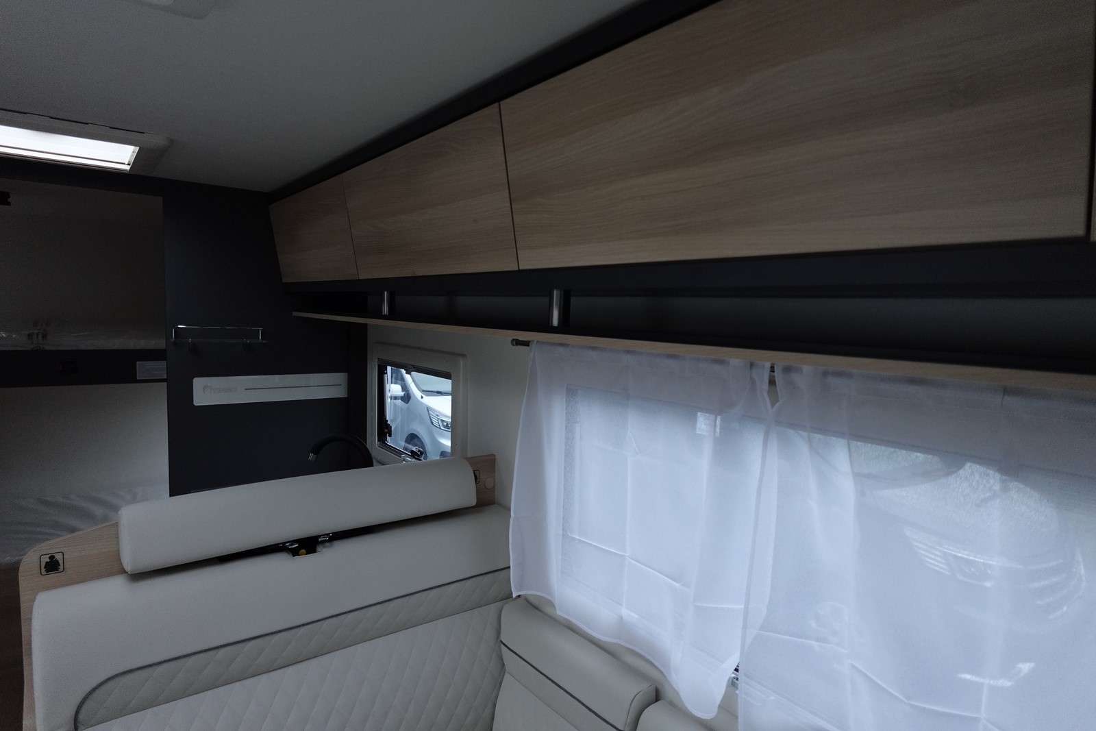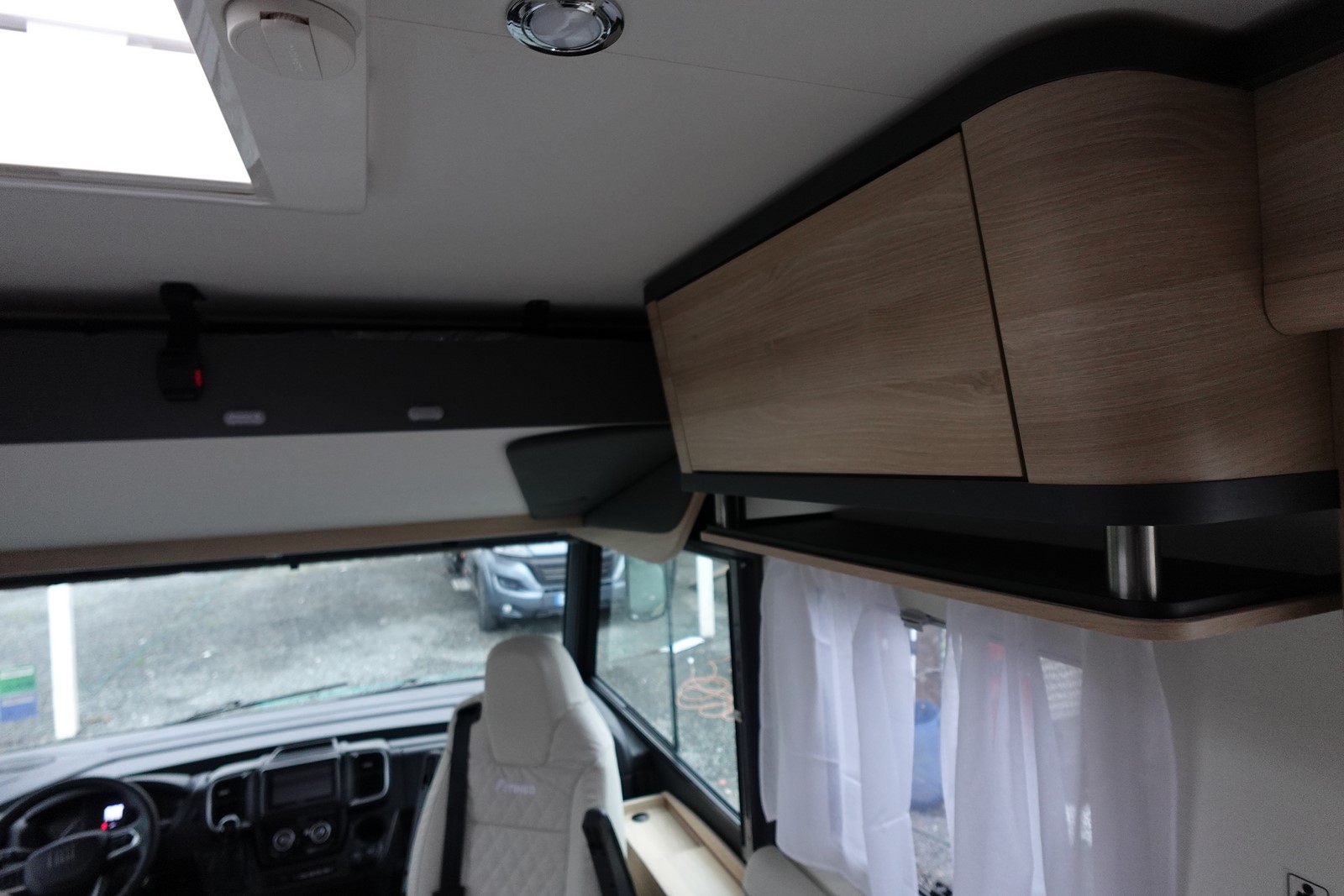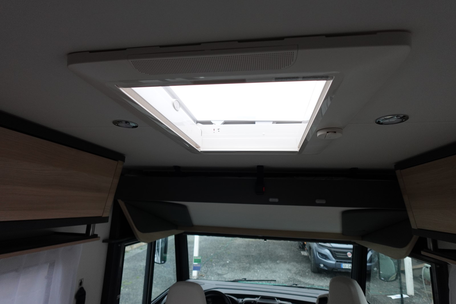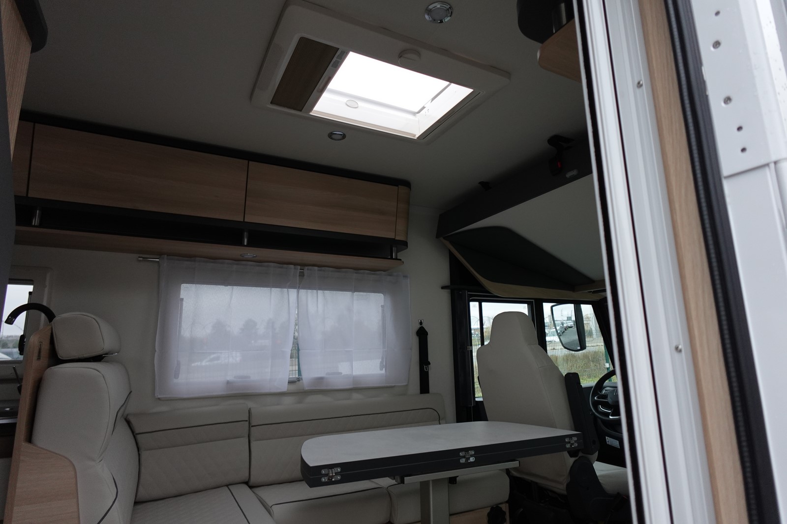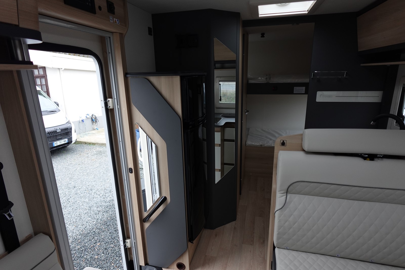 Intégral familial comprenant un grand salon avant panoramique, une salle d’eau avec douche séparée, des lits superposés, un lit de pavillon 2 places et une cuisine en L avec de nombreux rangements. Le tout en 6 places carte grise et couchage.