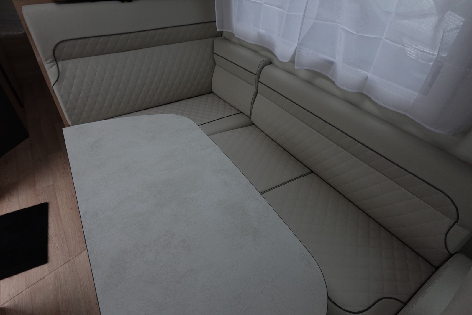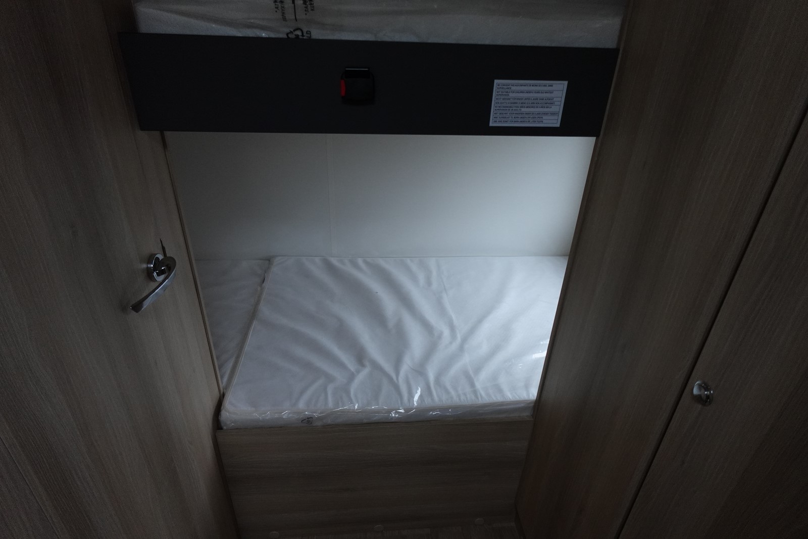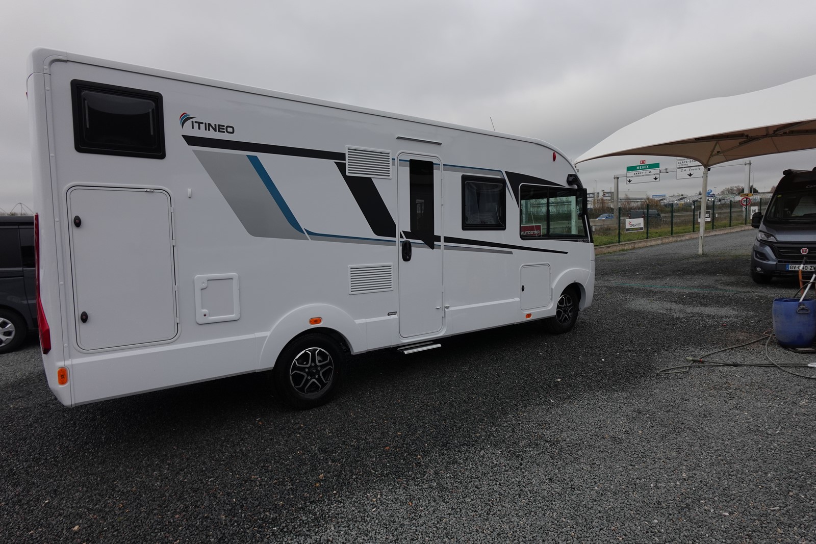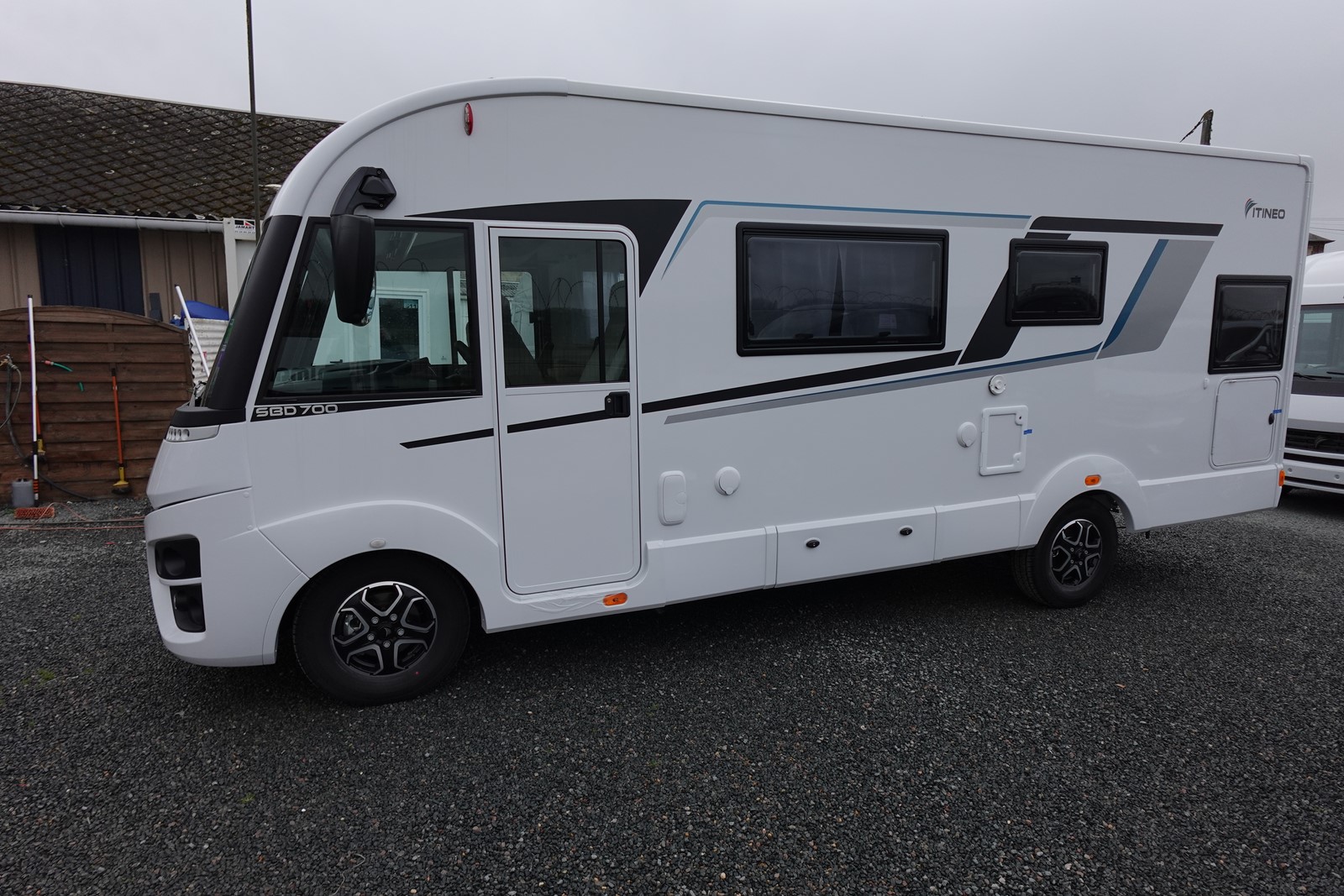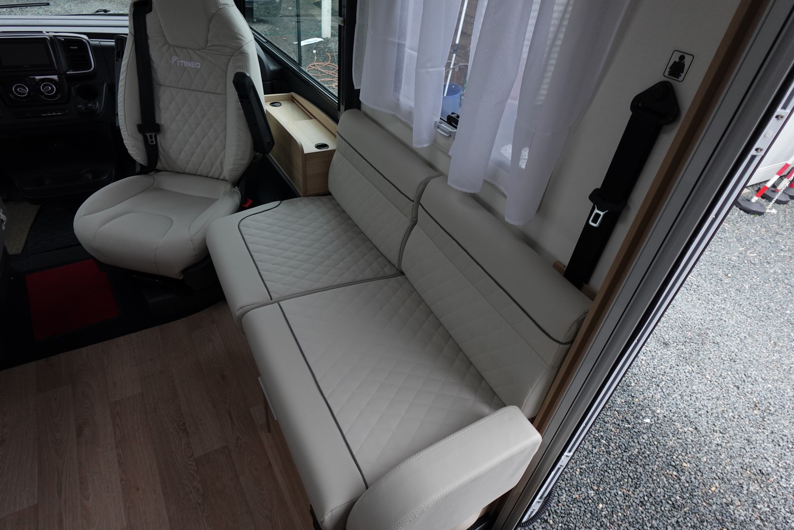 Intégral familial comprenant un grand salon avant panoramique, une salle d’eau avec douche séparée, des lits superposés, un lit de pavillon 2 places et une cuisine en L avec de nombreux rangements. Le tout en 6 places carte grise et couchage.