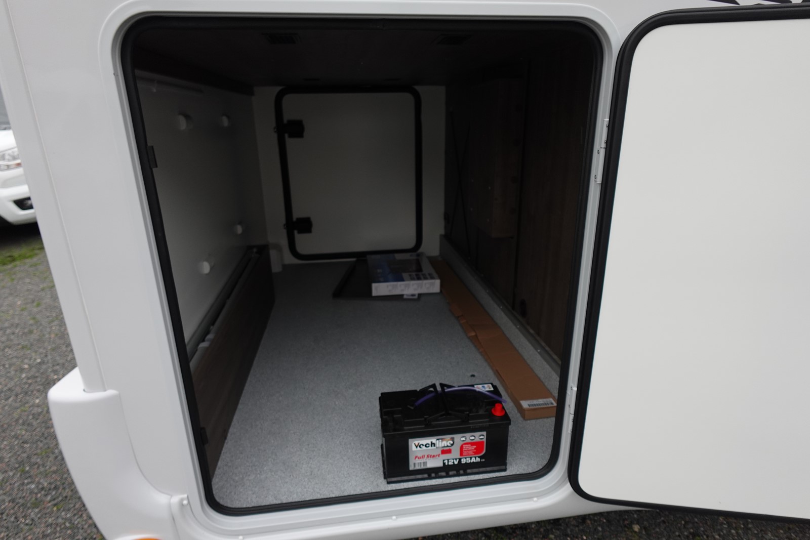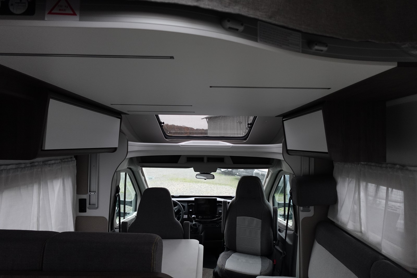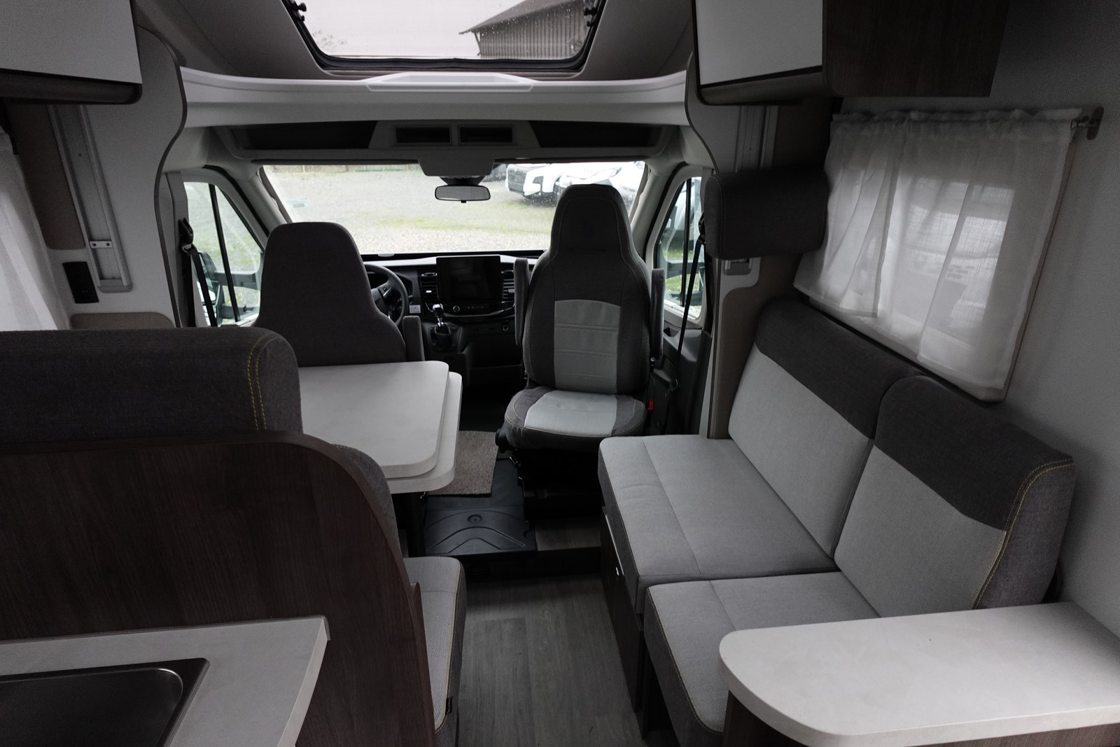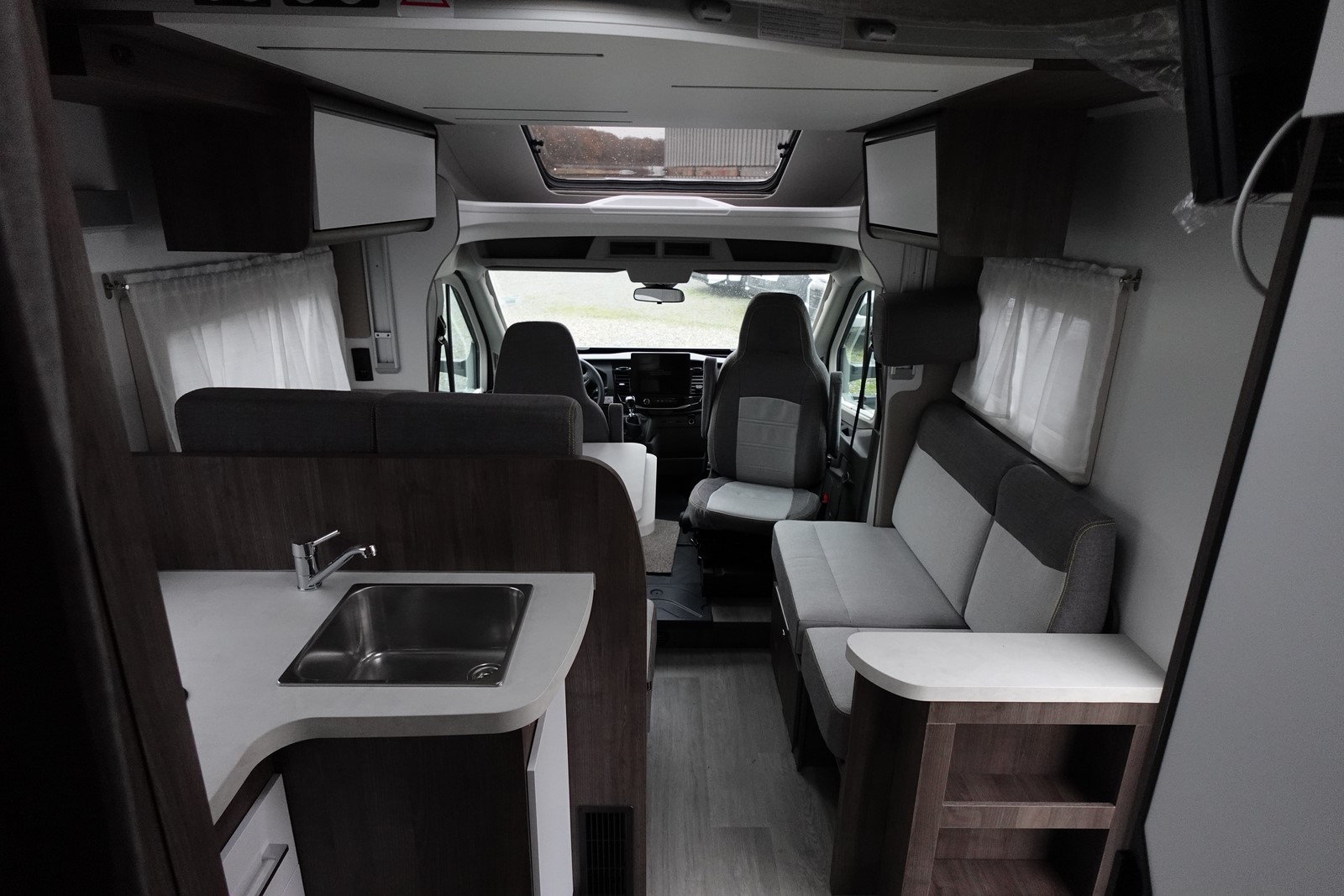 Profilé déjà tout équipé et prêt à partir comprenant des lits jumeaux sur soute garage, une douche indépendante de l’espace WC / lavabo, une cuisine en L avec de nombreux rangements, un salon avant panoramique et un lit de pavillon 2 places.