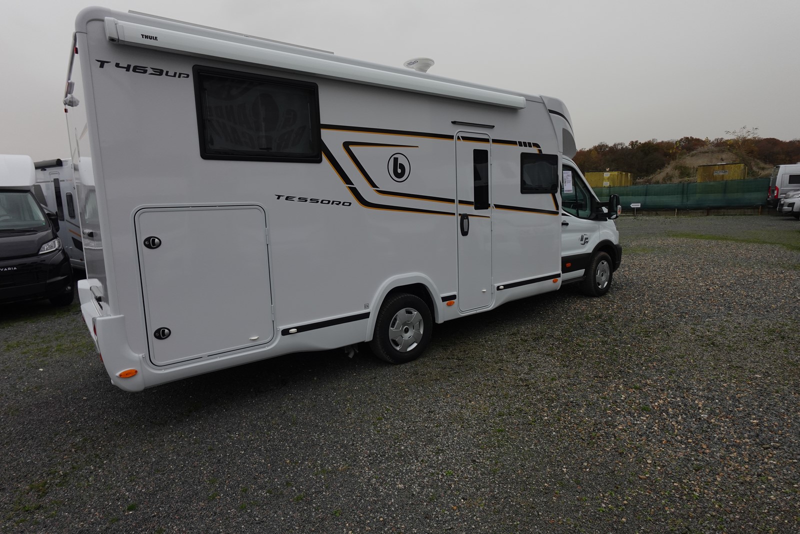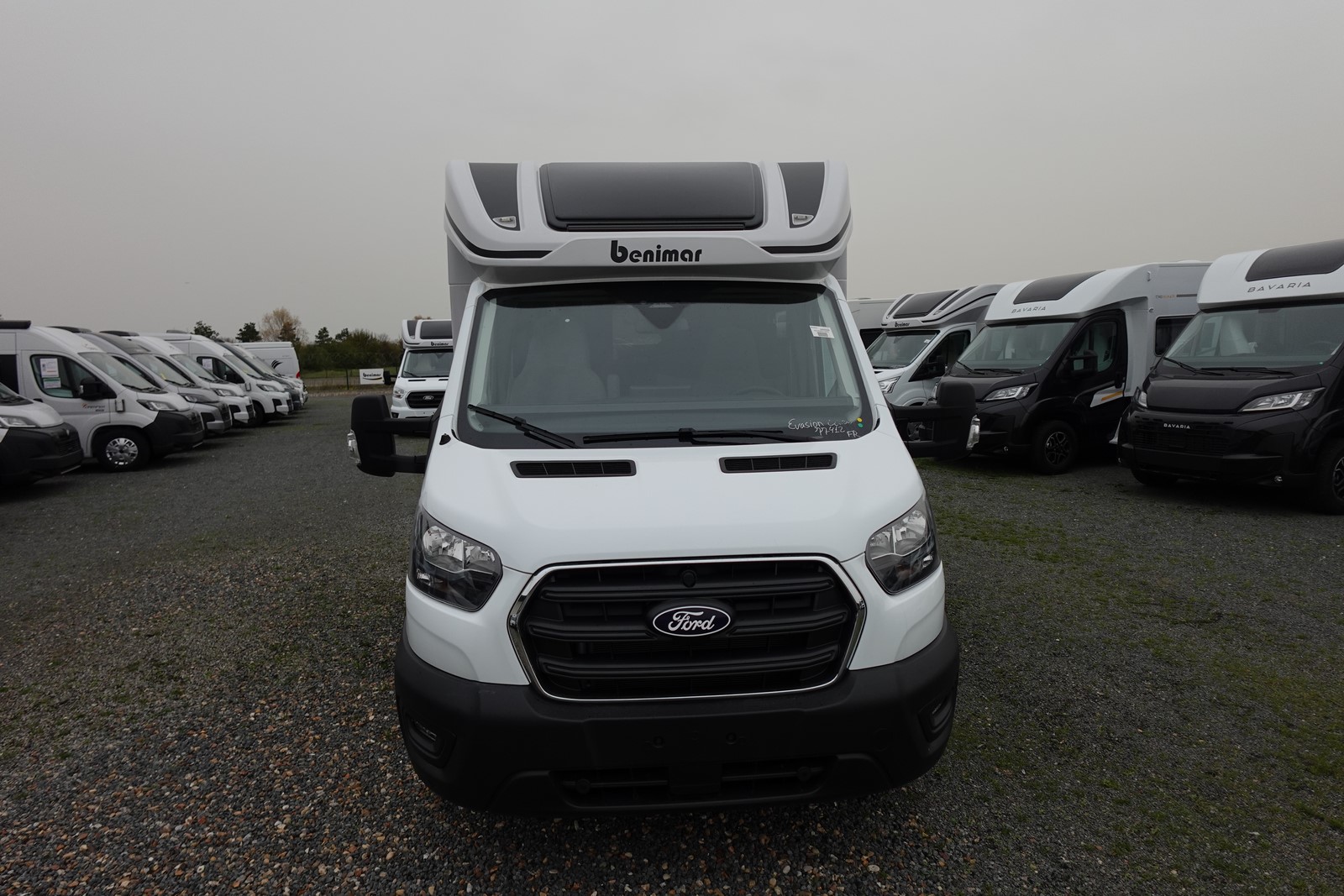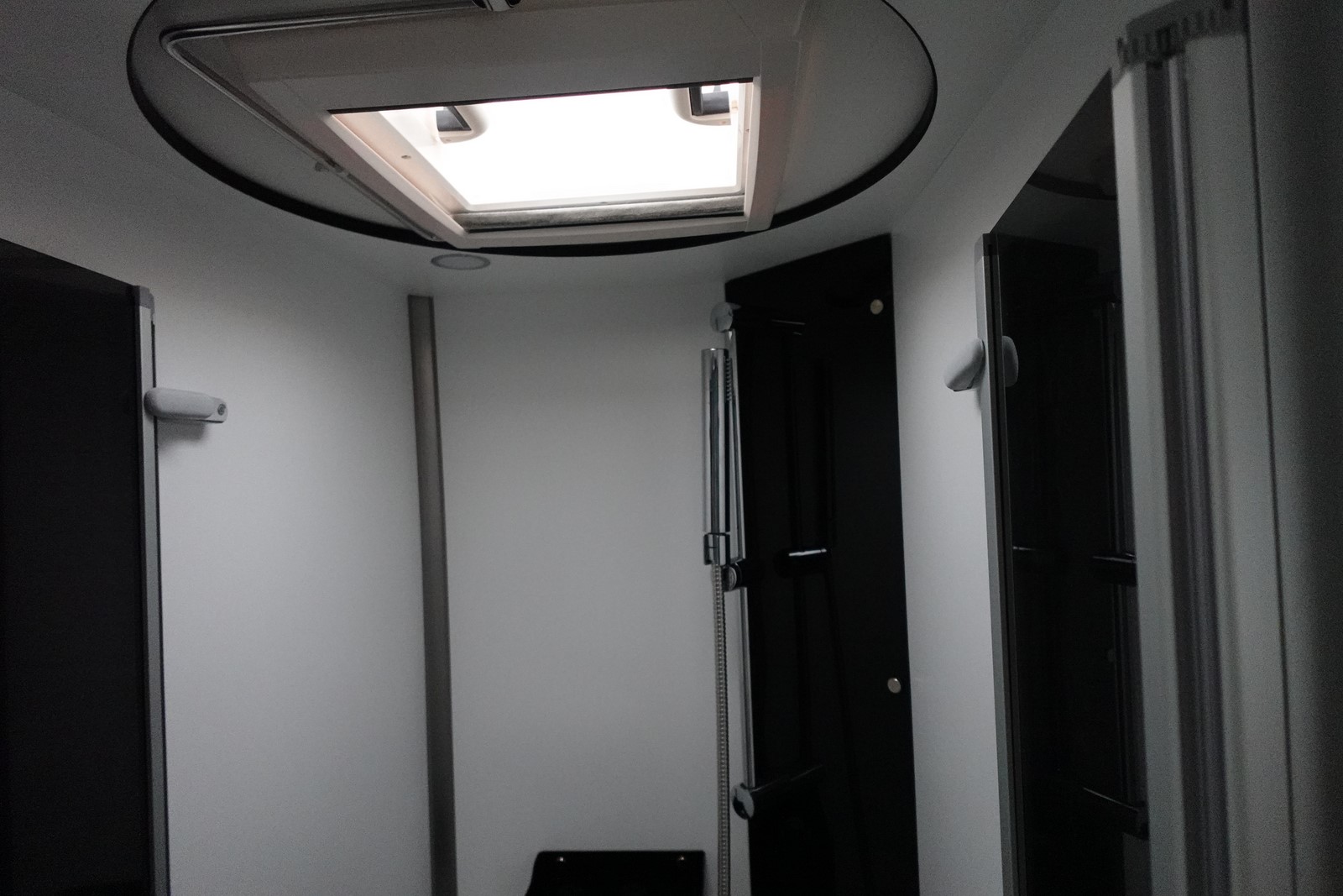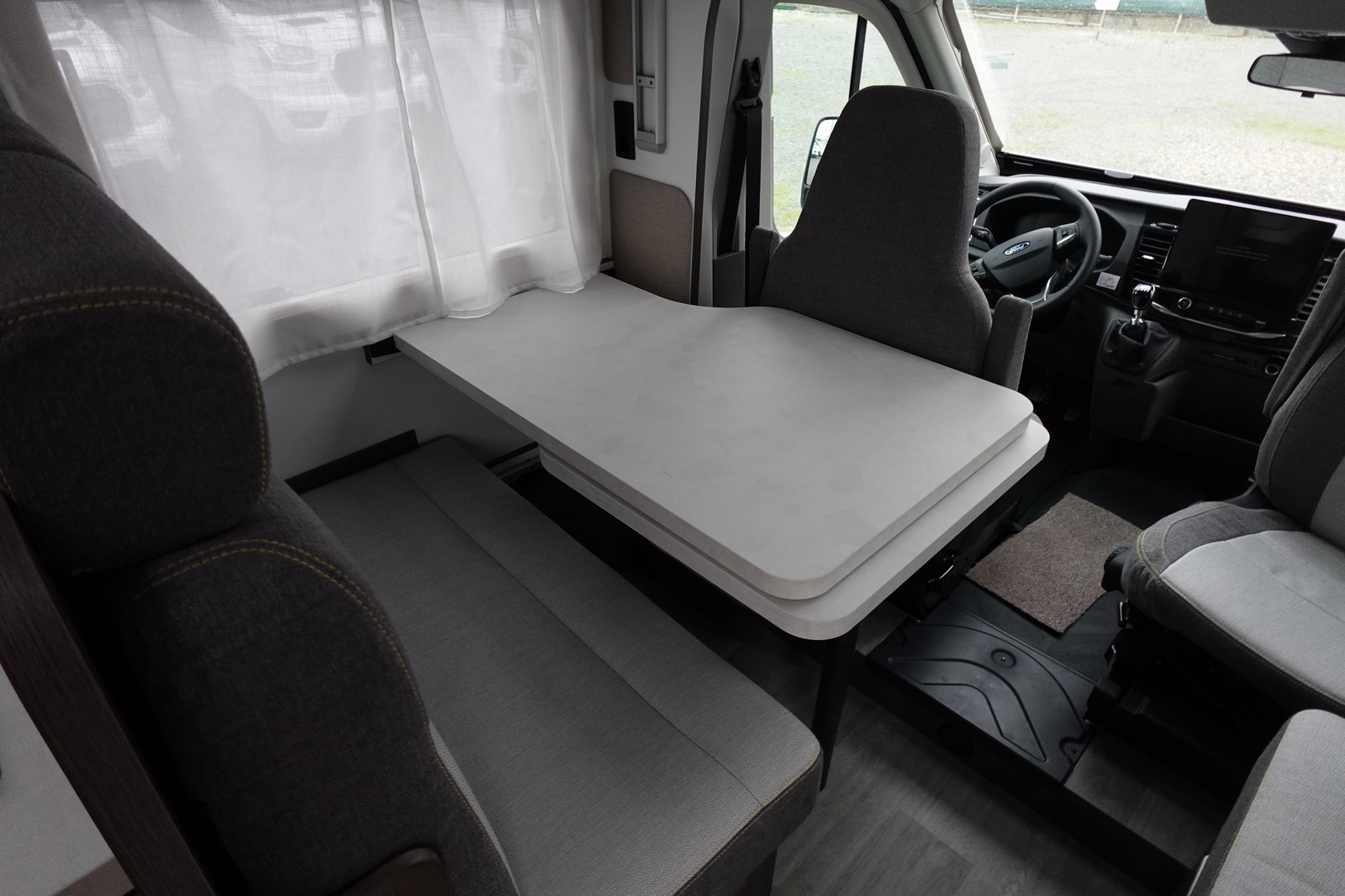 Profilé déjà tout équipé et prêt à partir comprenant des lits jumeaux sur soute garage, une douche indépendante de l’espace WC / lavabo, une cuisine en L avec de nombreux rangements, un salon avant panoramique et un lit de pavillon 2 places.