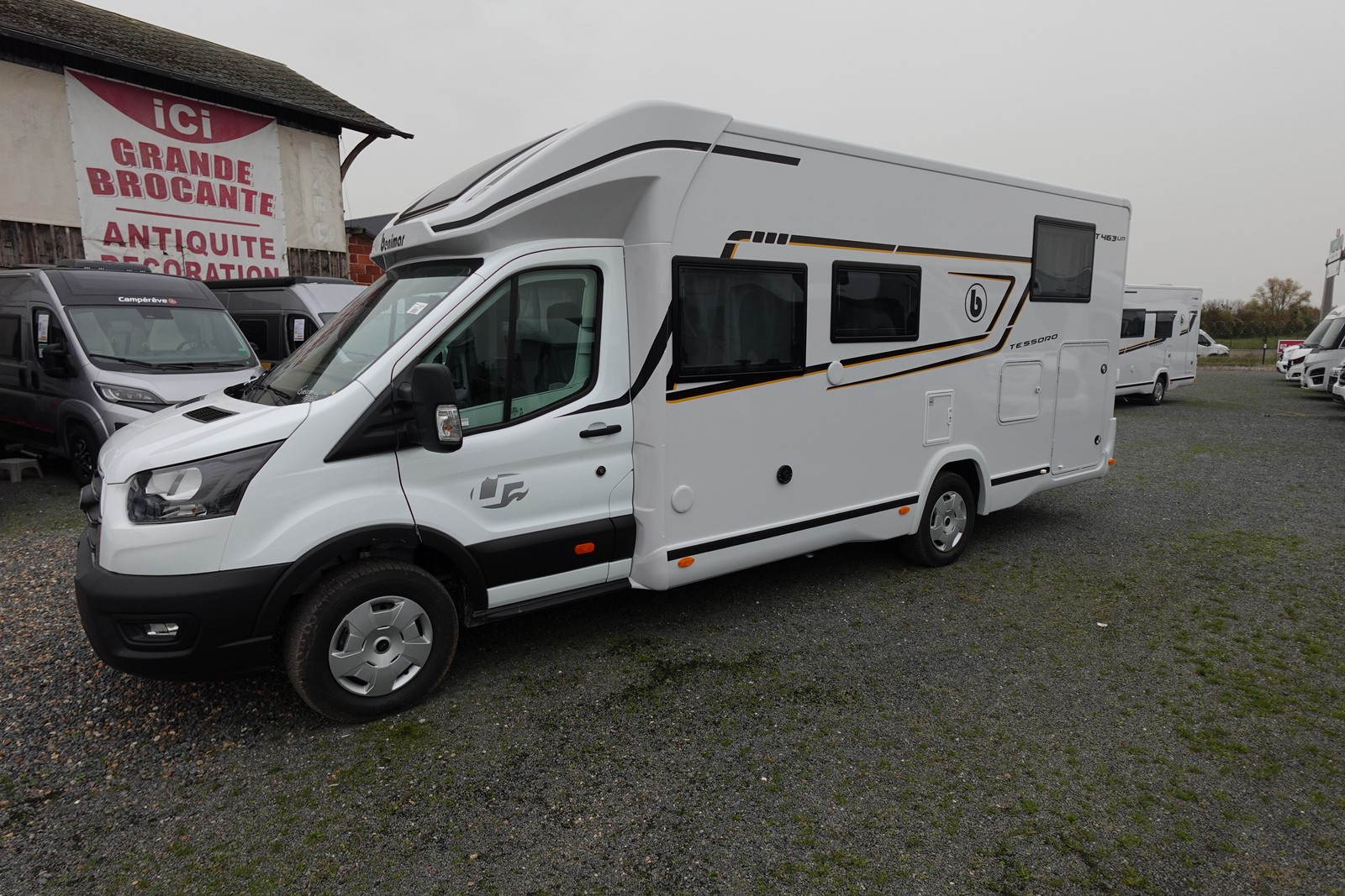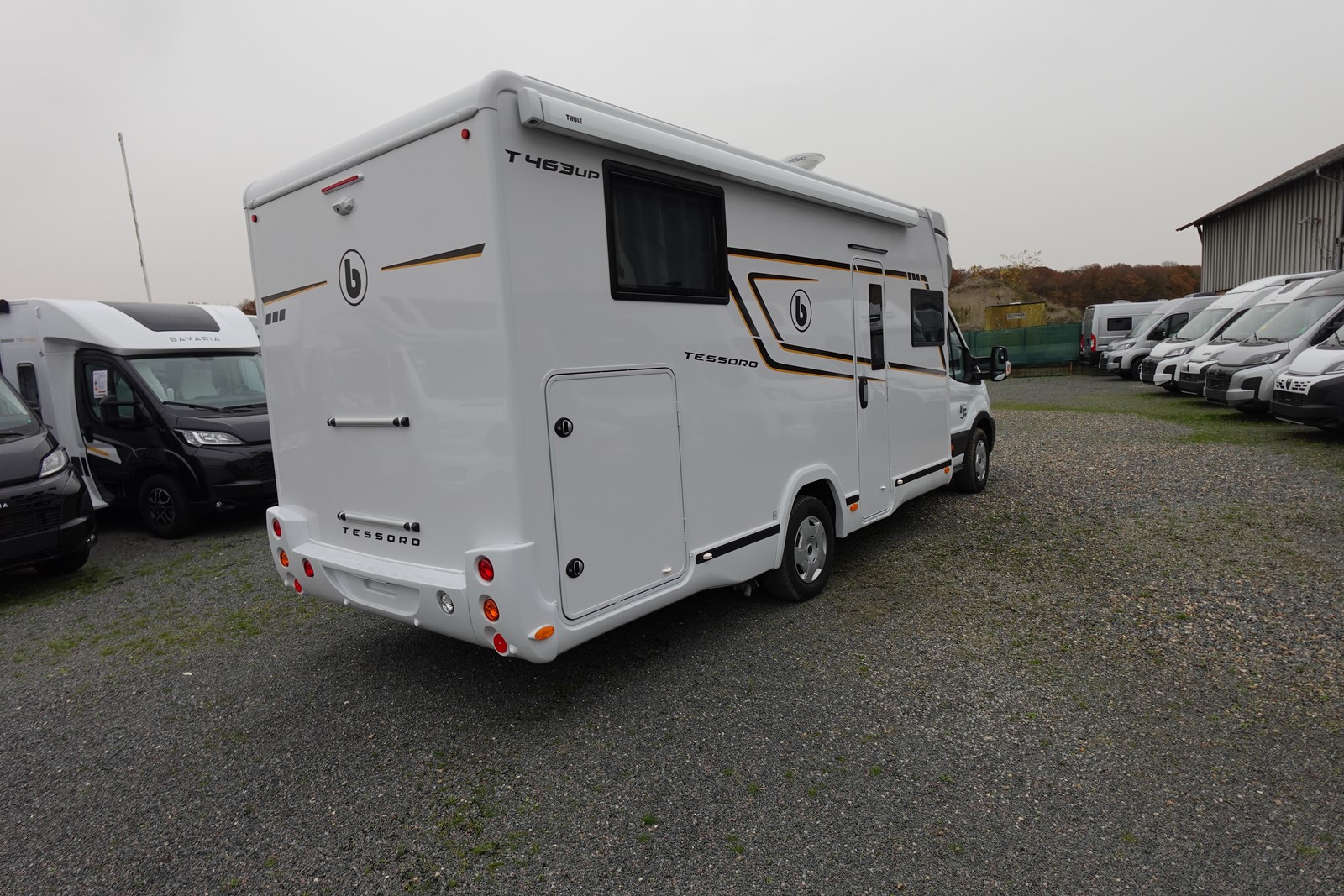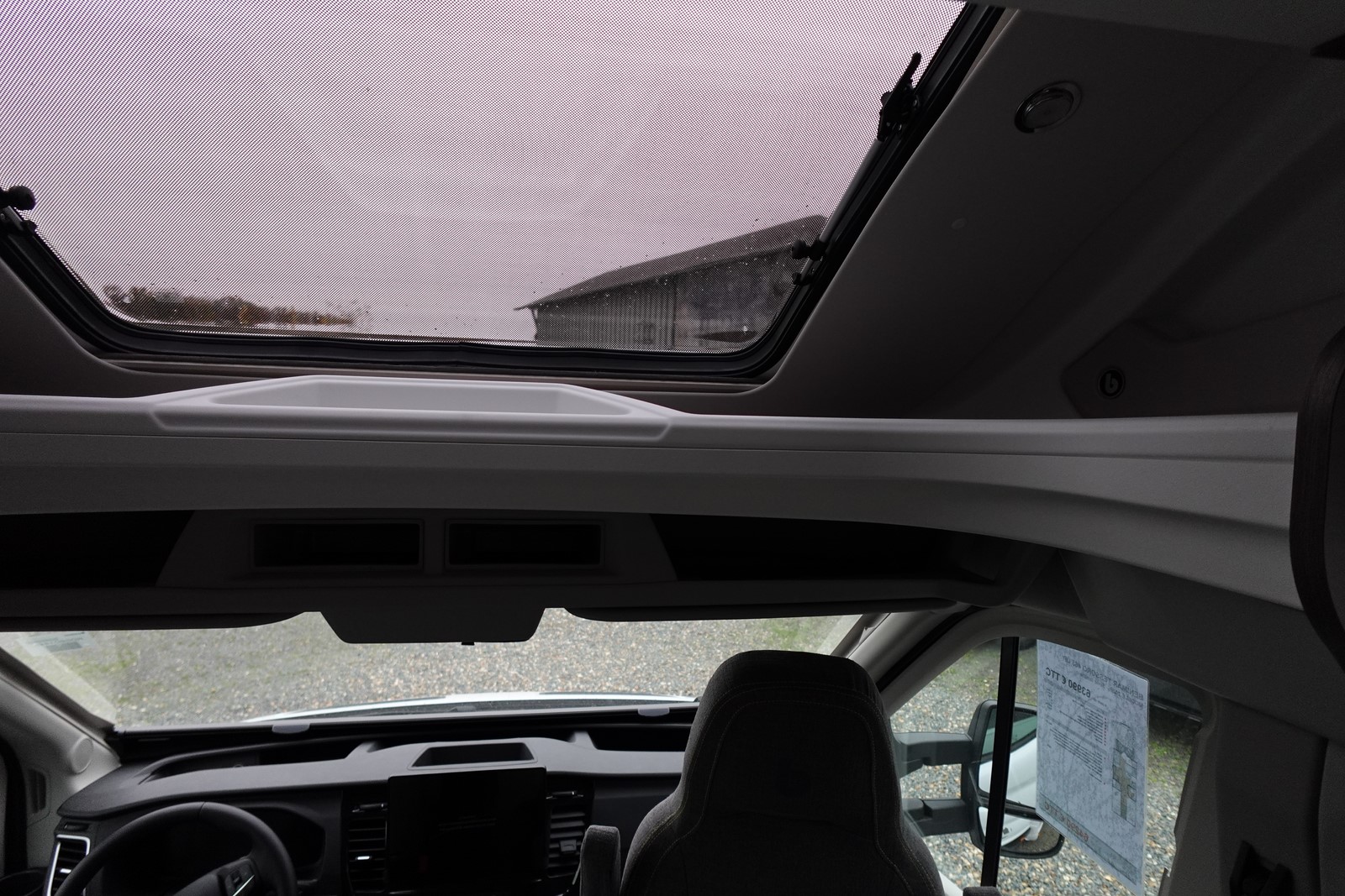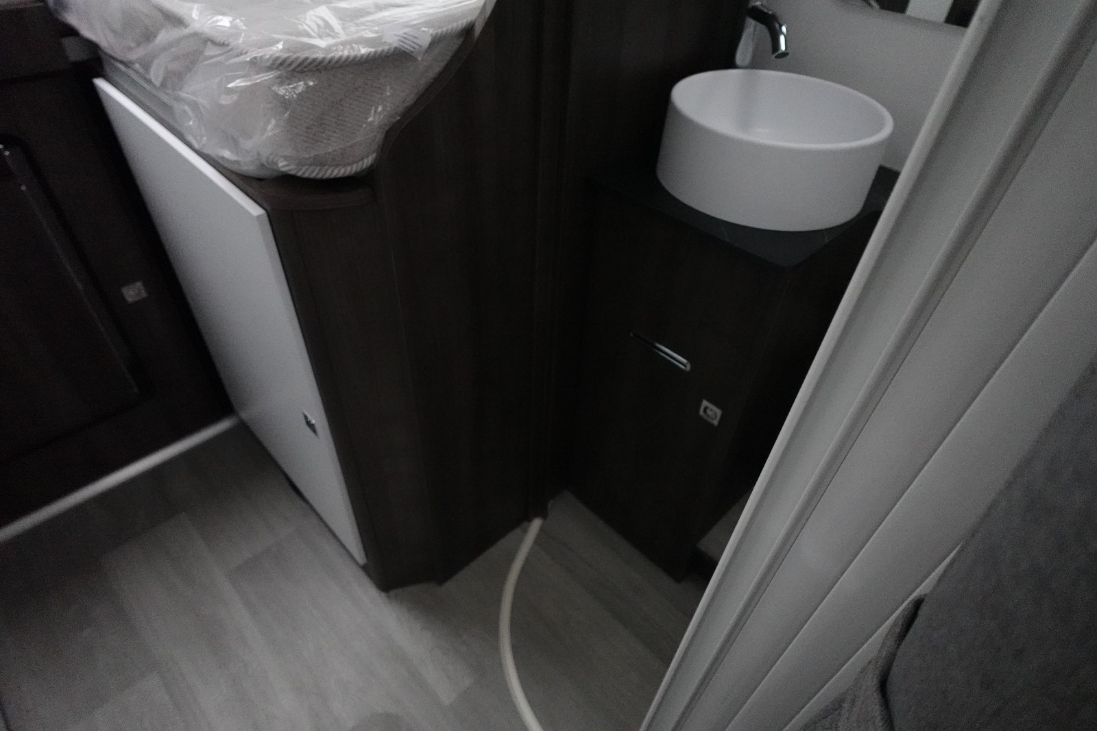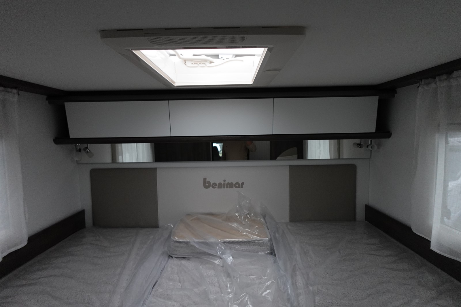 Profilé déjà tout équipé et prêt à partir comprenant des lits jumeaux sur soute garage, une douche indépendante de l’espace WC / lavabo, une cuisine en L avec de nombreux rangements, un salon avant panoramique et un lit de pavillon 2 places.