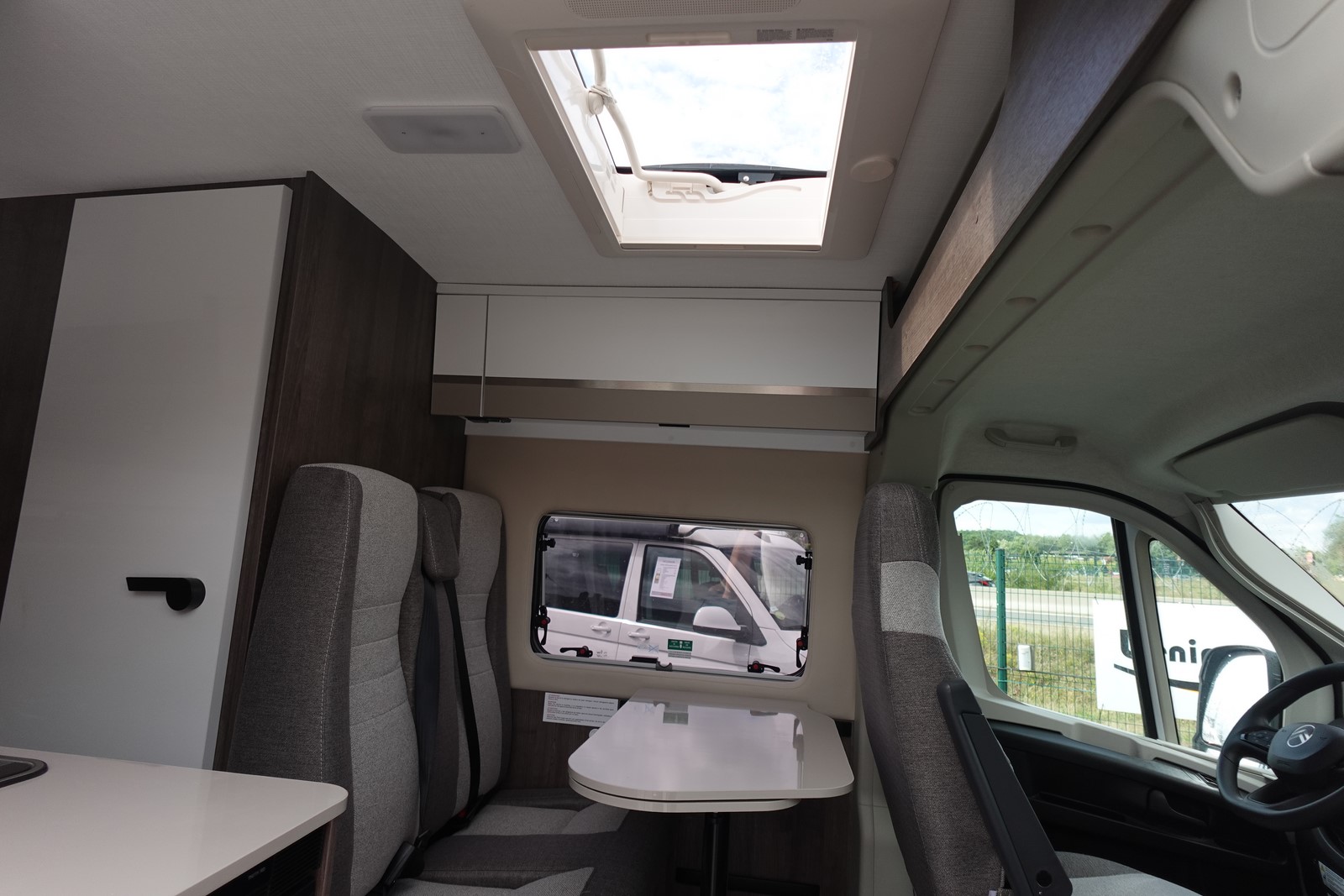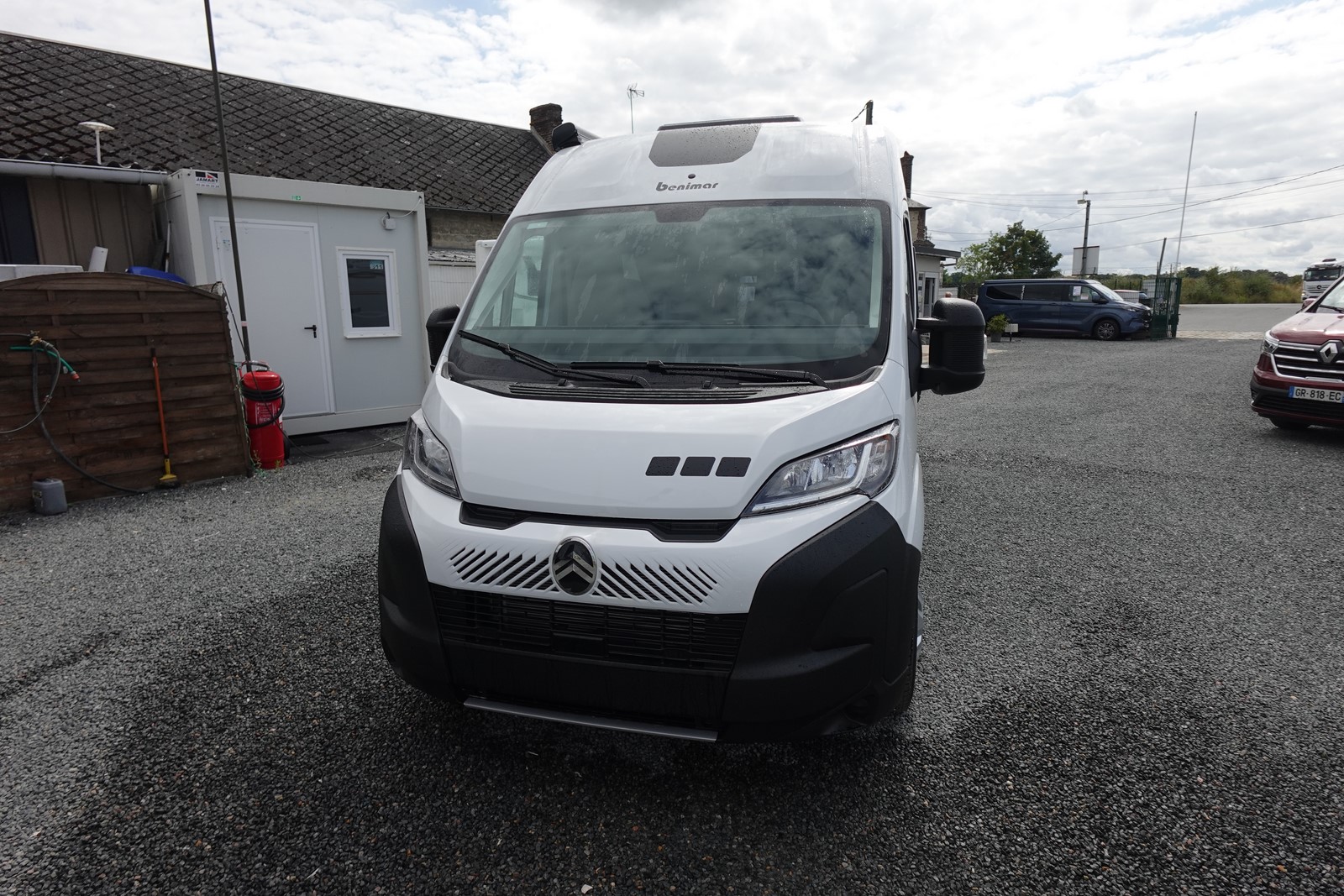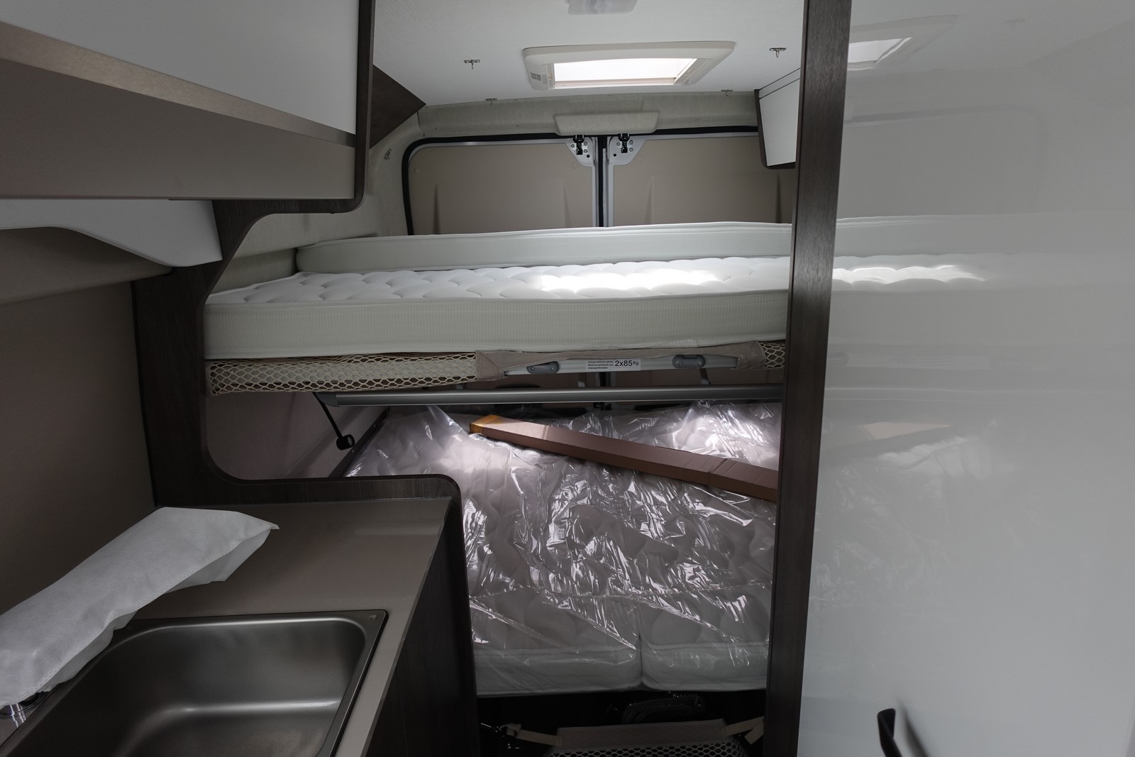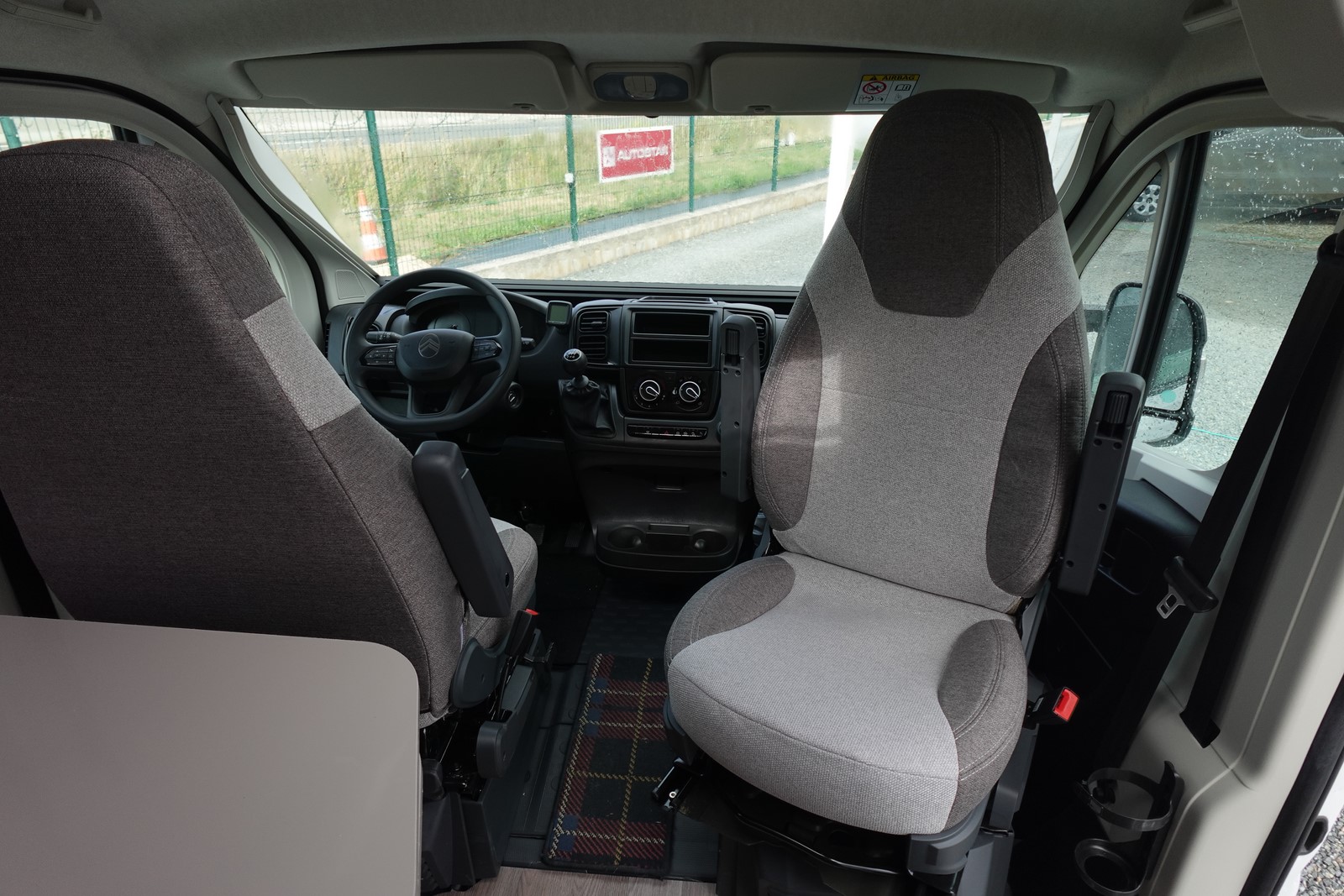 Fourgon aménagé familial comprenant un salon avant panoramique, une salle d’eau avec douche, 2 lits arrière 2 places superposés et amovibles et une cuisine avec de nombreux rangement.