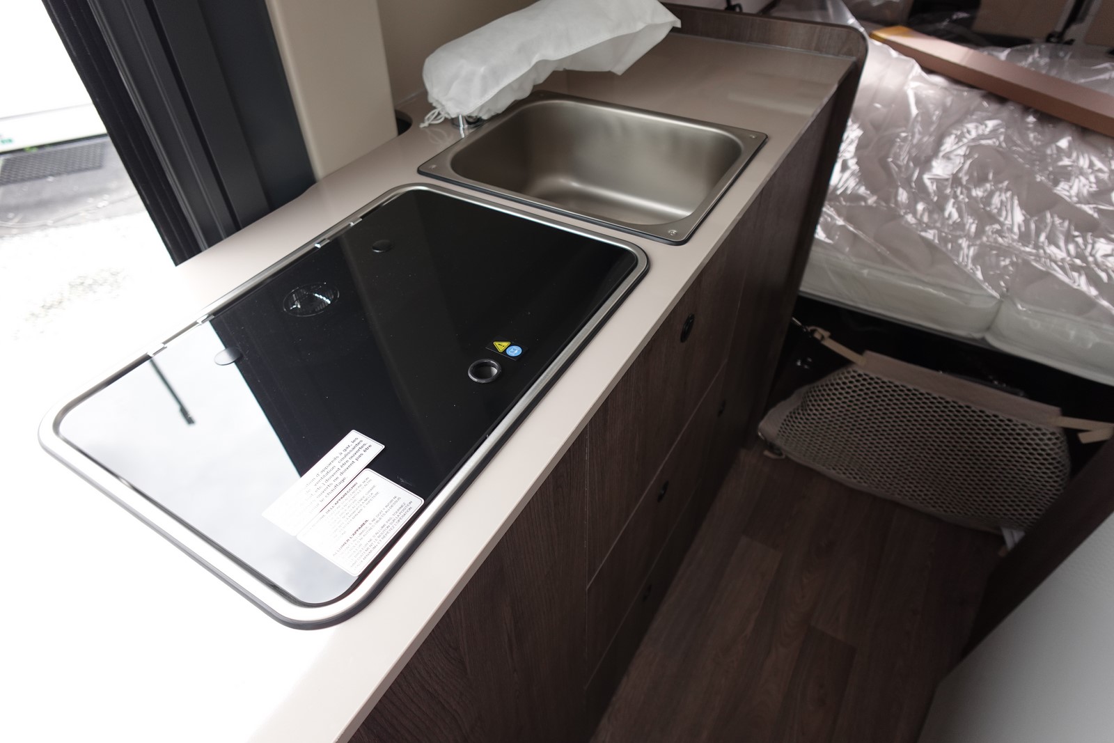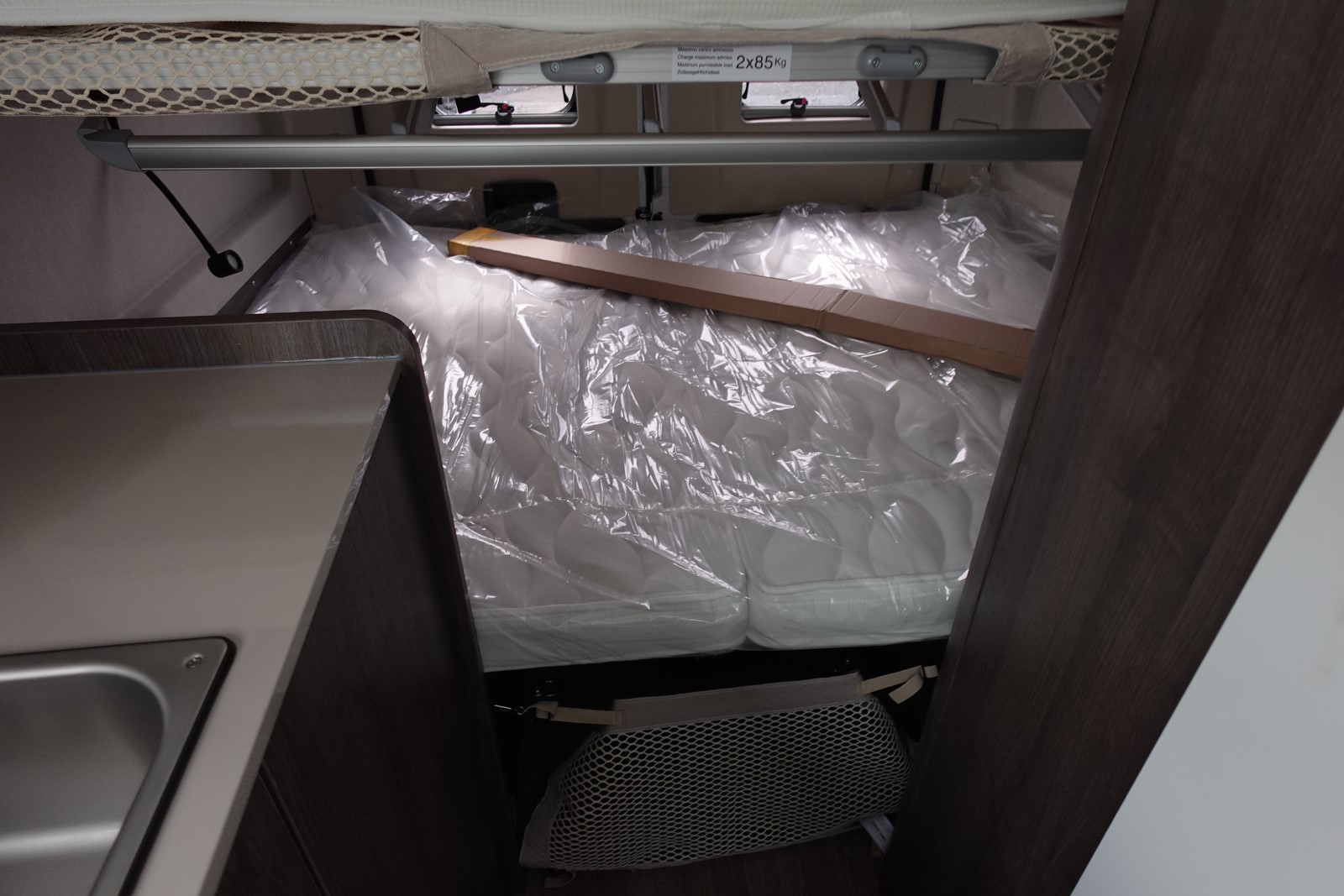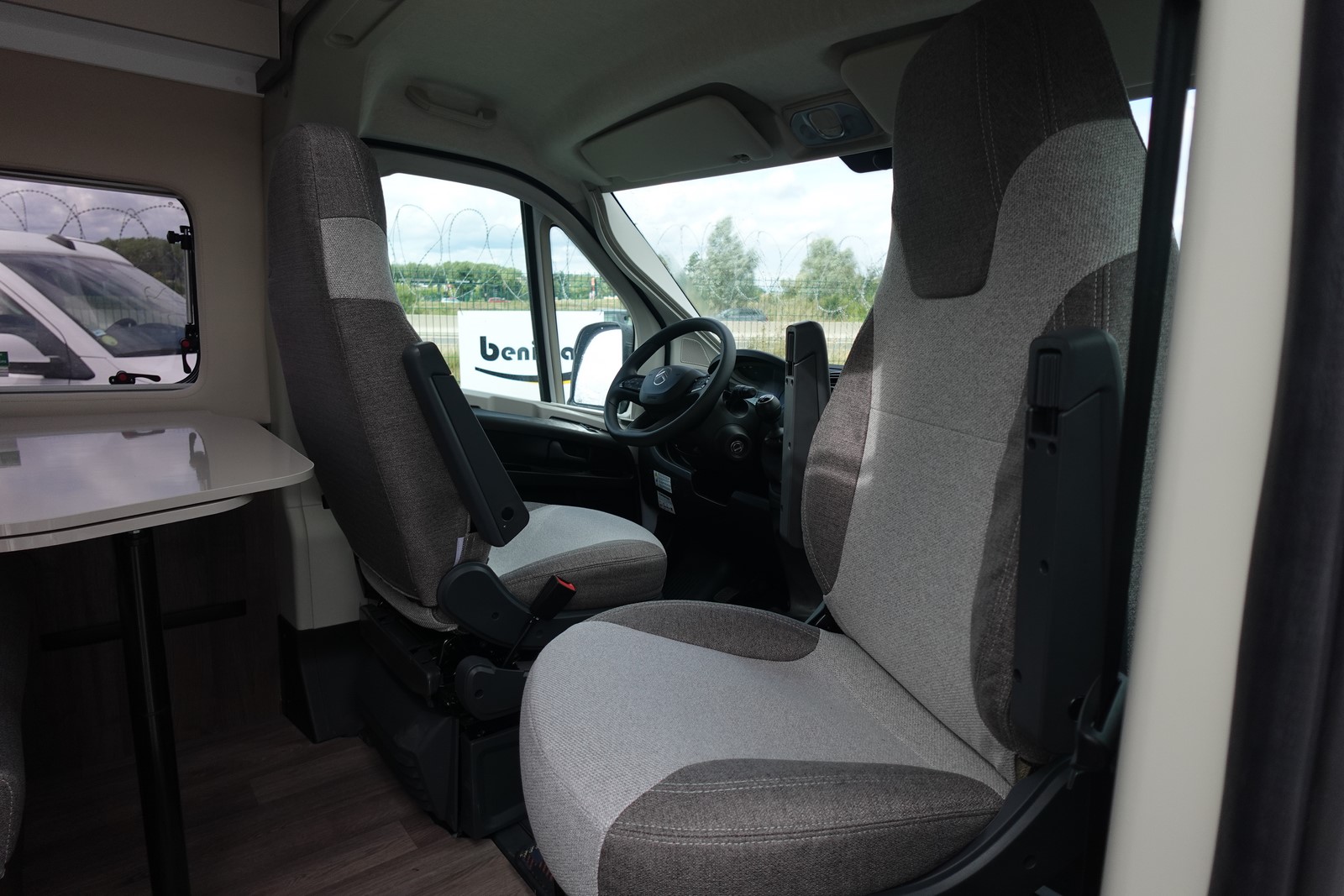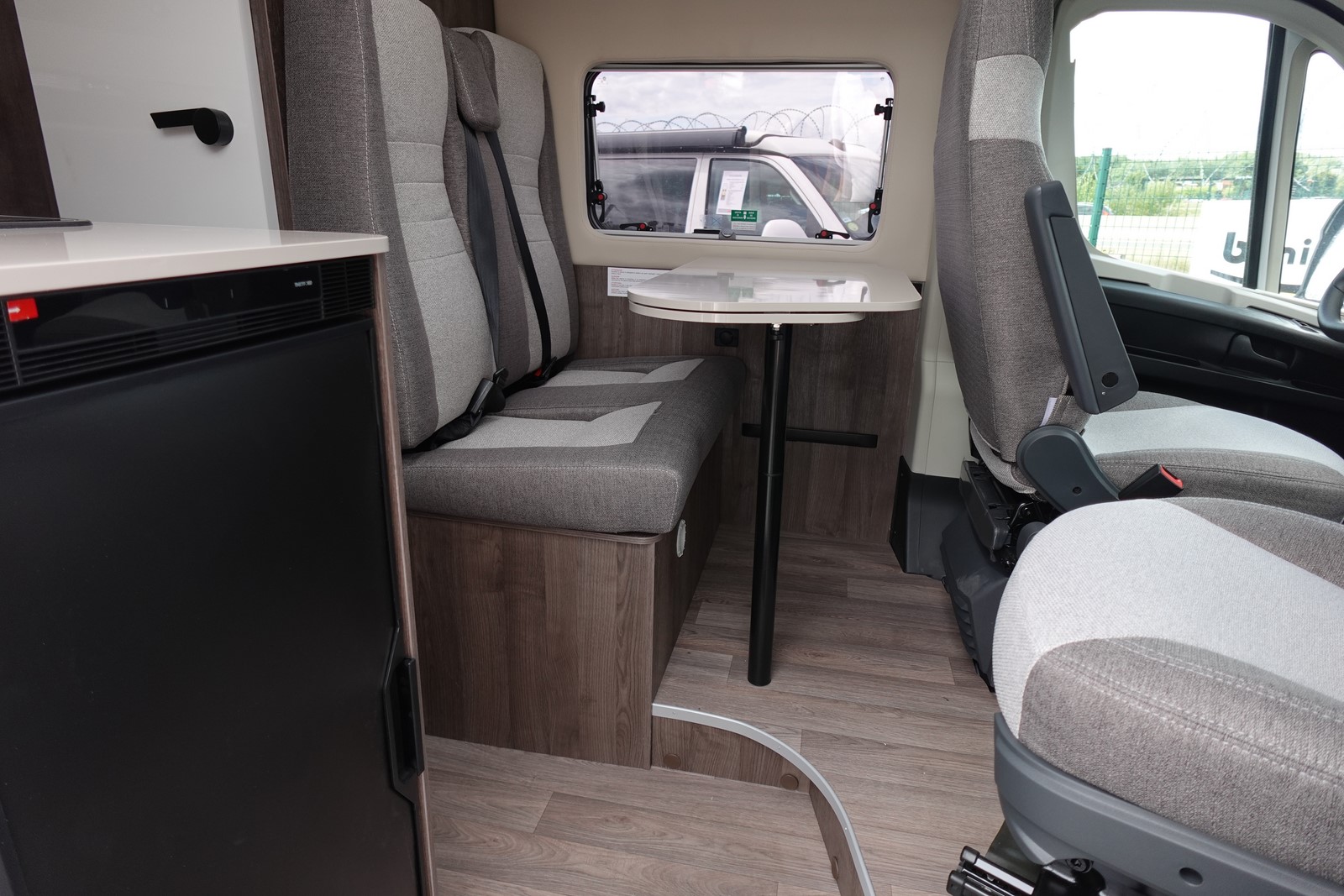 Fourgon aménagé familial comprenant un salon avant panoramique, une salle d’eau avec douche, 2 lits arrière 2 places superposés et amovibles et une cuisine avec de nombreux rangement.