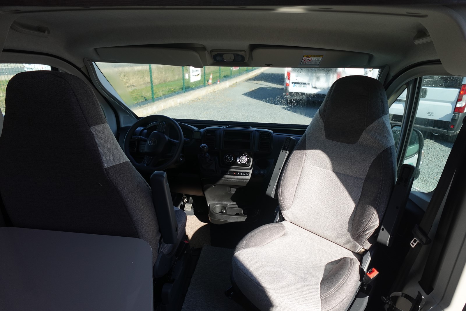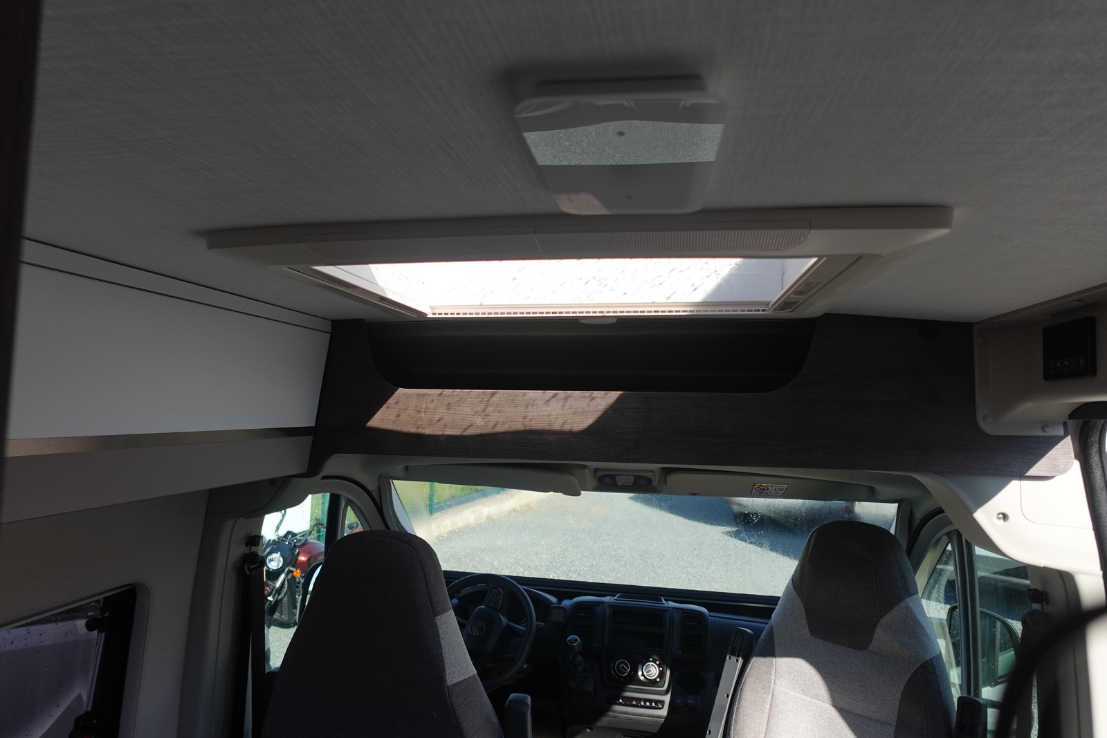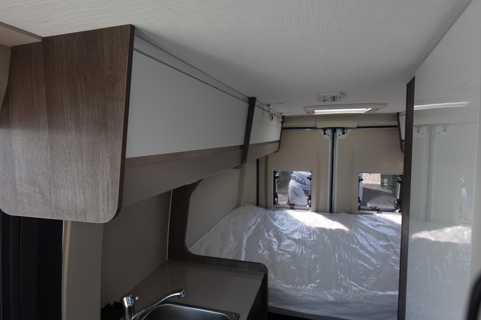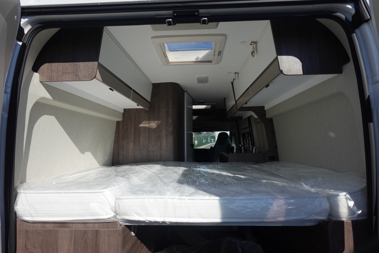 Fourgon aménagé comprenant un salon avant panoramique, une salle d’eau avec douche, un lit transversal arrière pour 2 personnes et une cuisine avec de nombreux rangement.