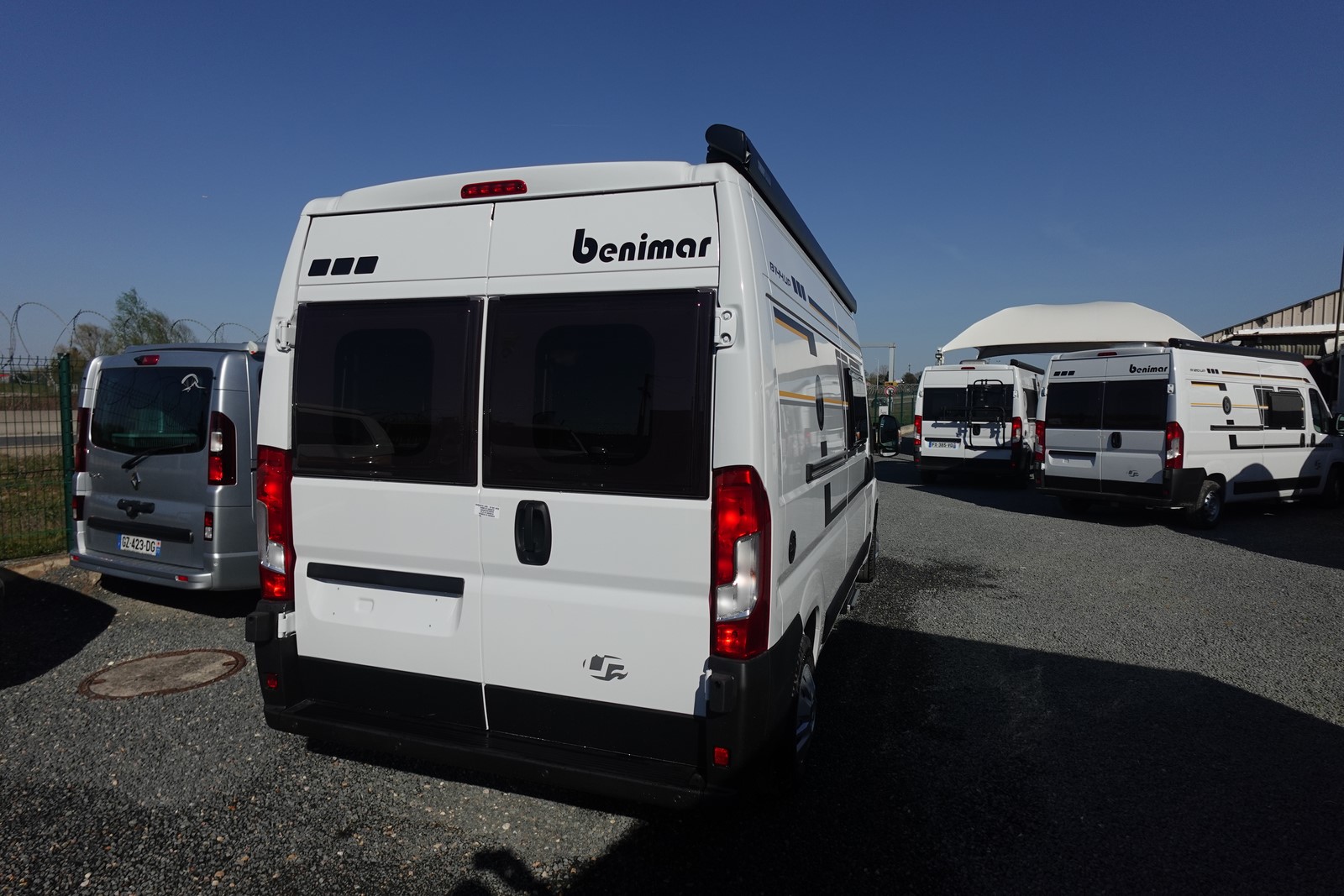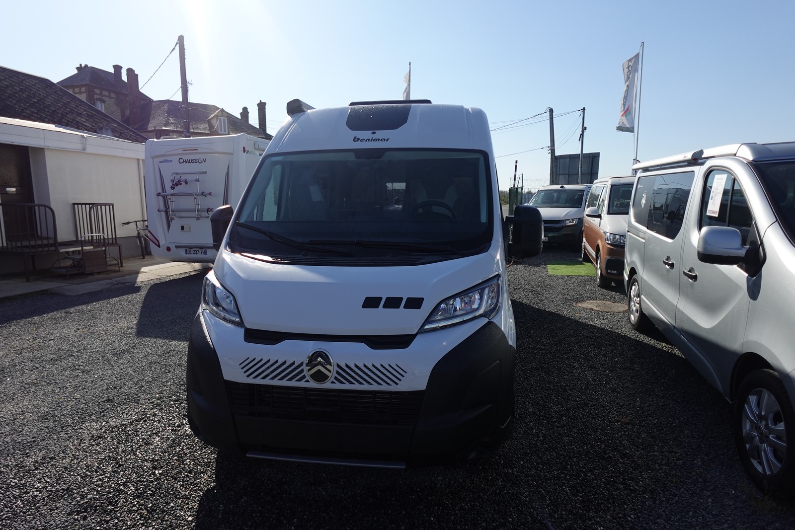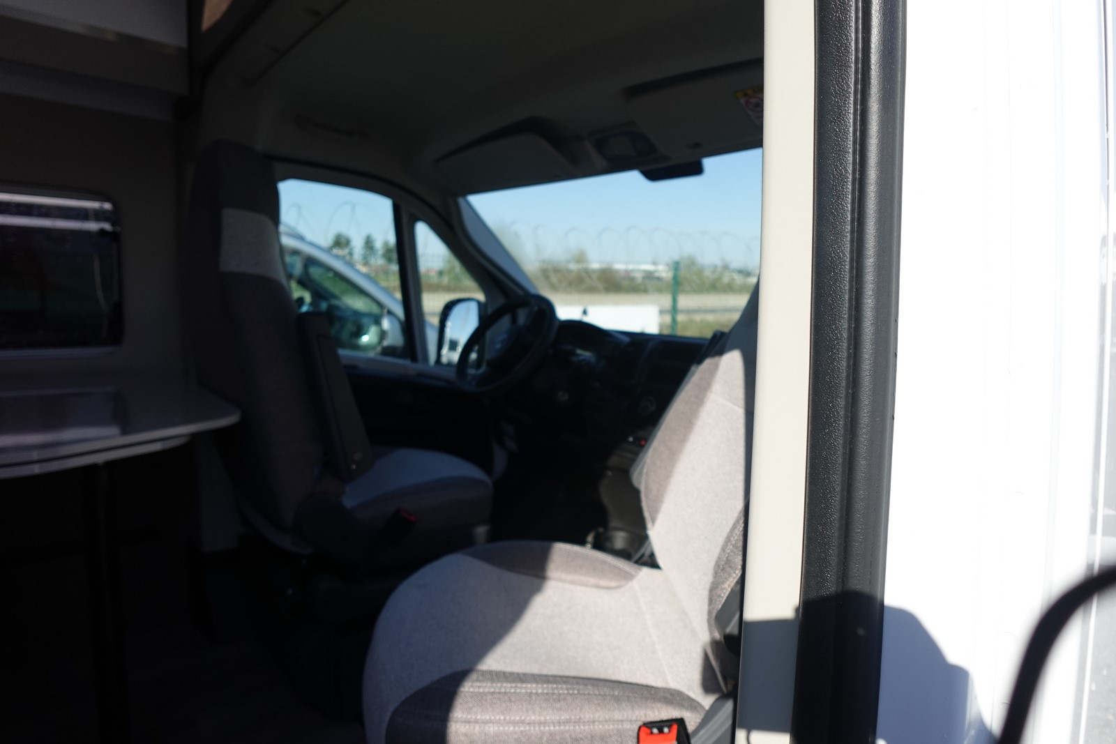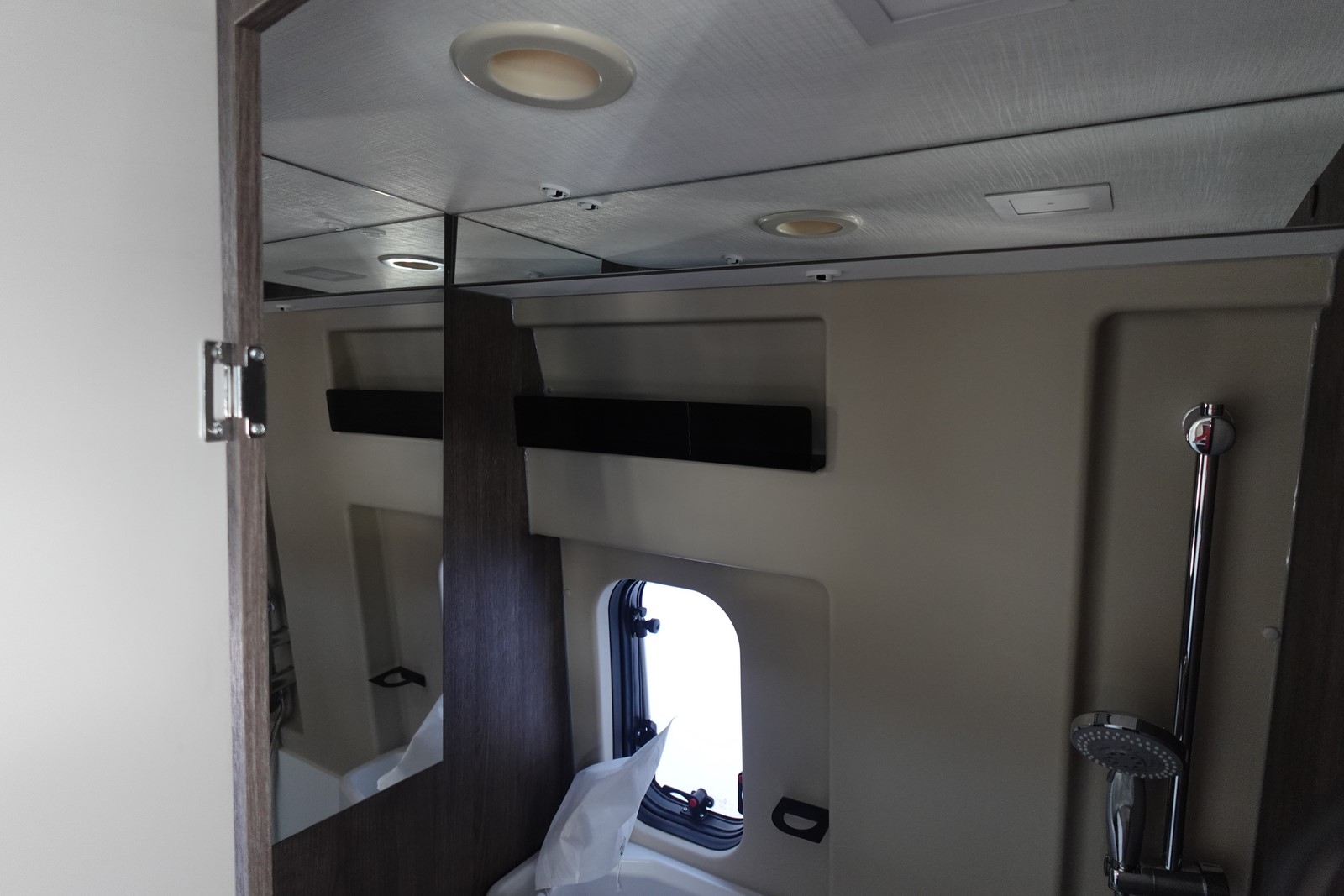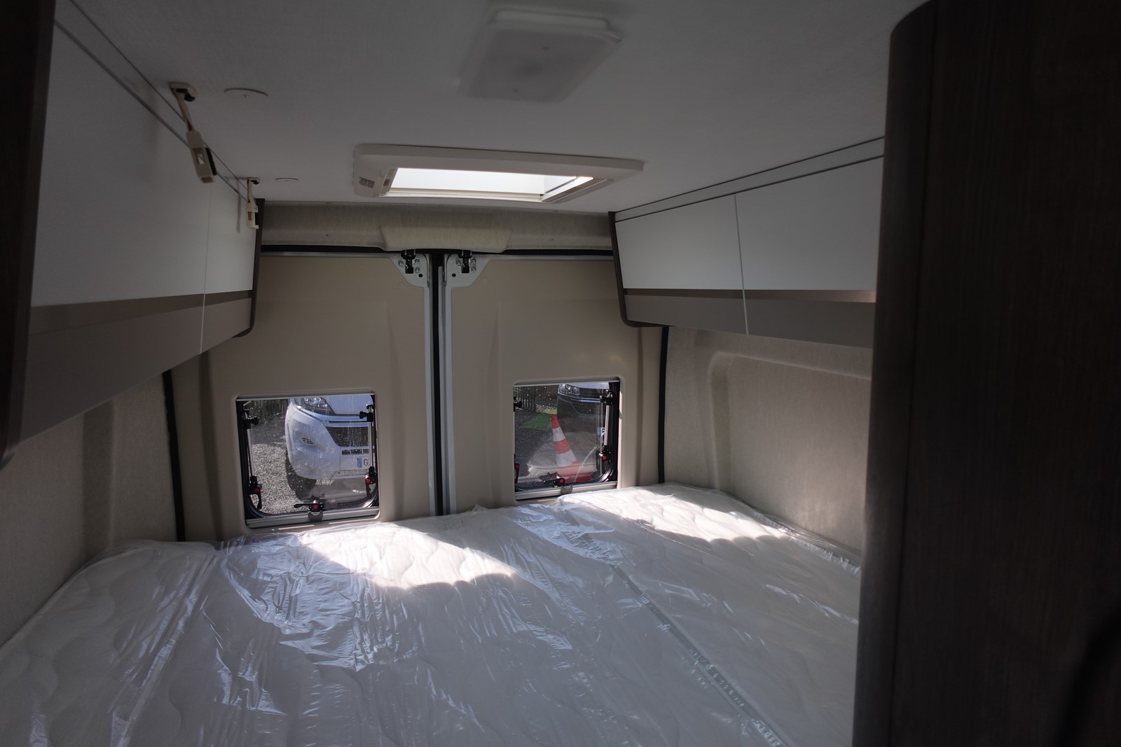 Fourgon aménagé comprenant un salon avant panoramique, une salle d’eau avec douche, un lit transversal arrière pour 2 personnes et une cuisine avec de nombreux rangement.