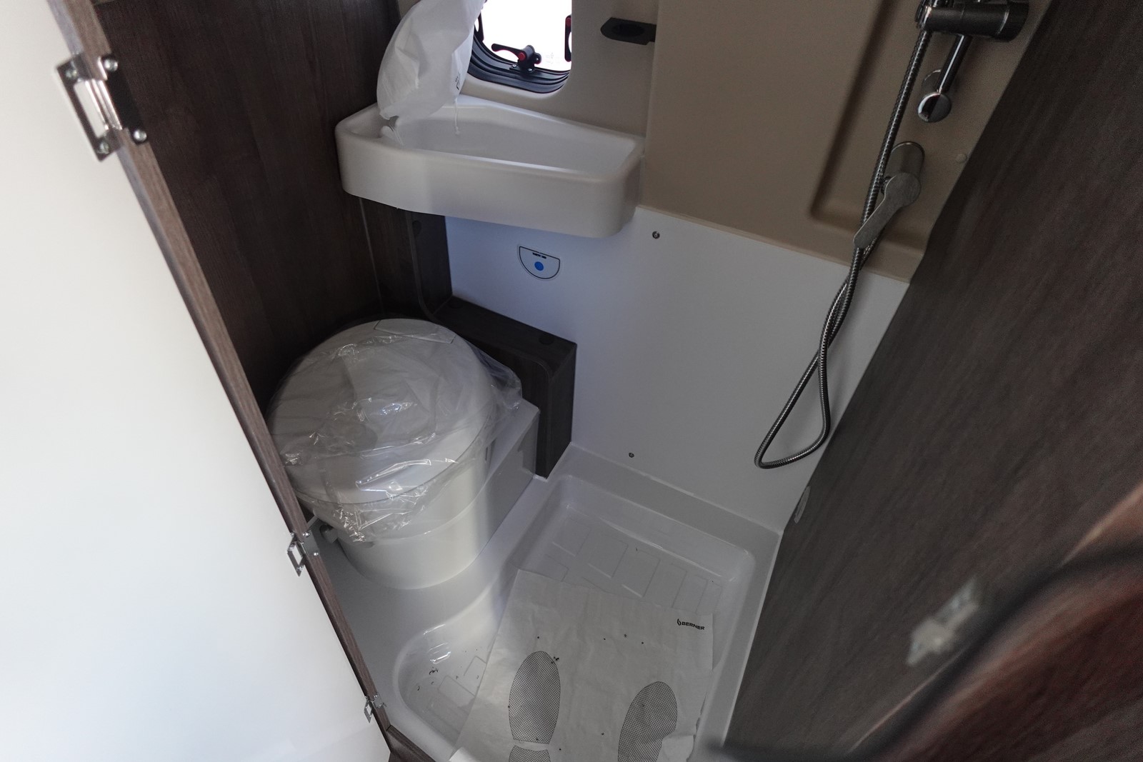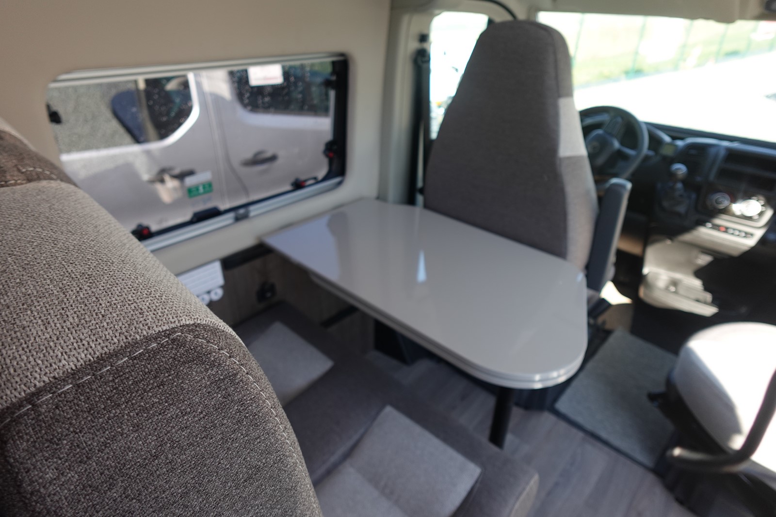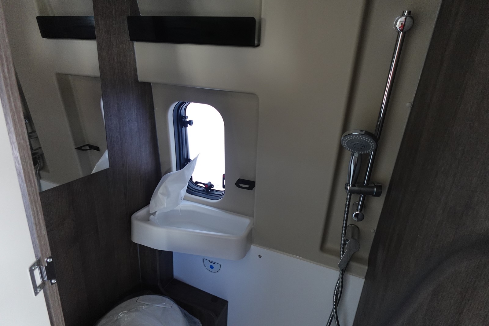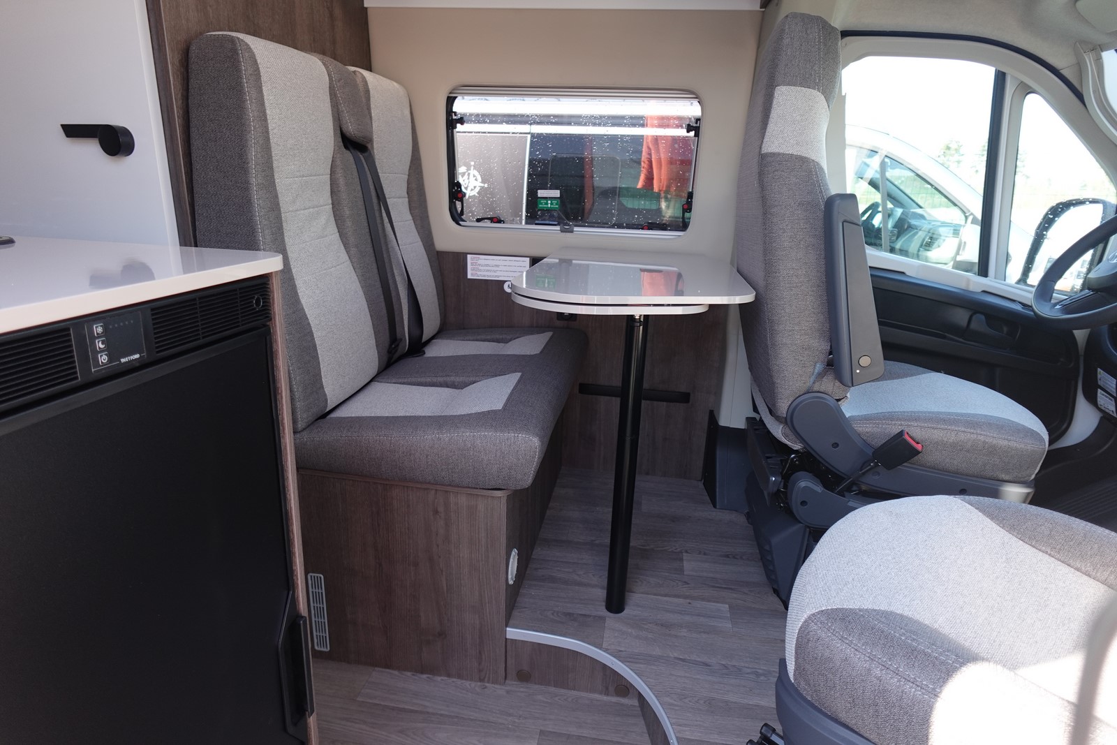 Fourgon aménagé comprenant un salon avant panoramique, une salle d’eau avec douche, un lit transversal arrière pour 2 personnes et une cuisine avec de nombreux rangement.