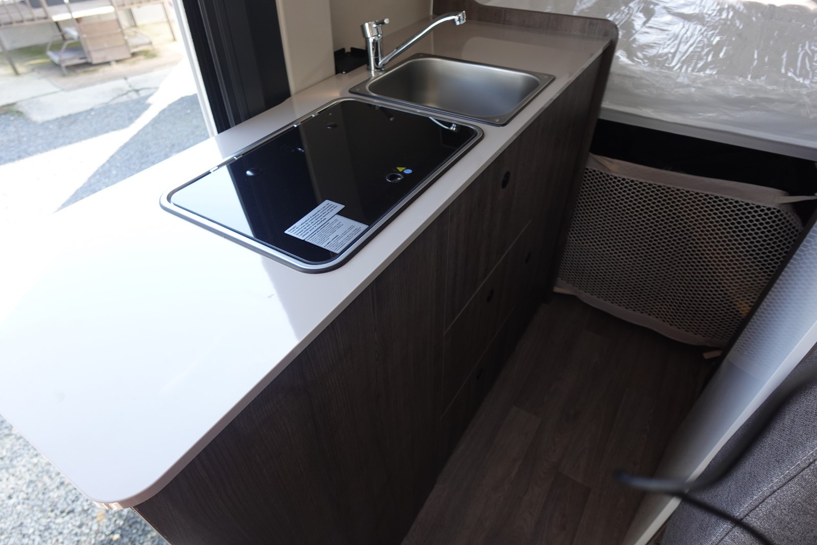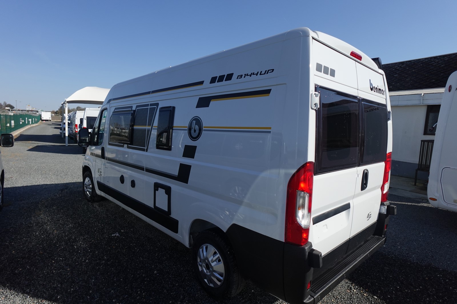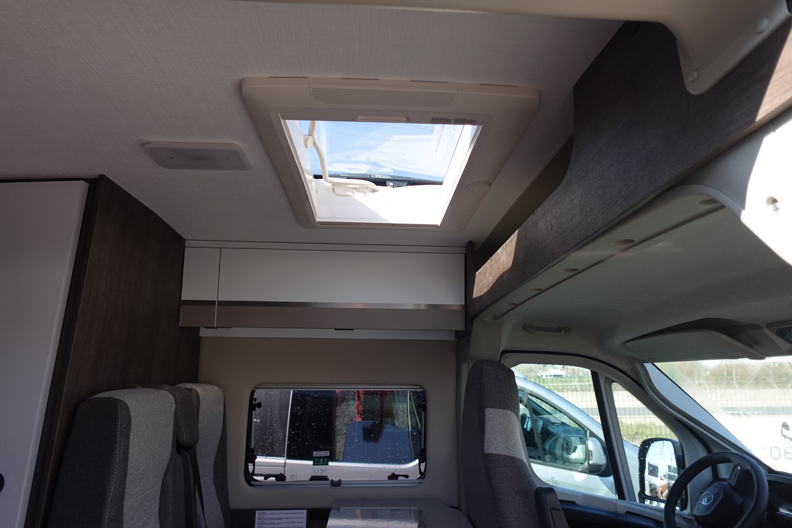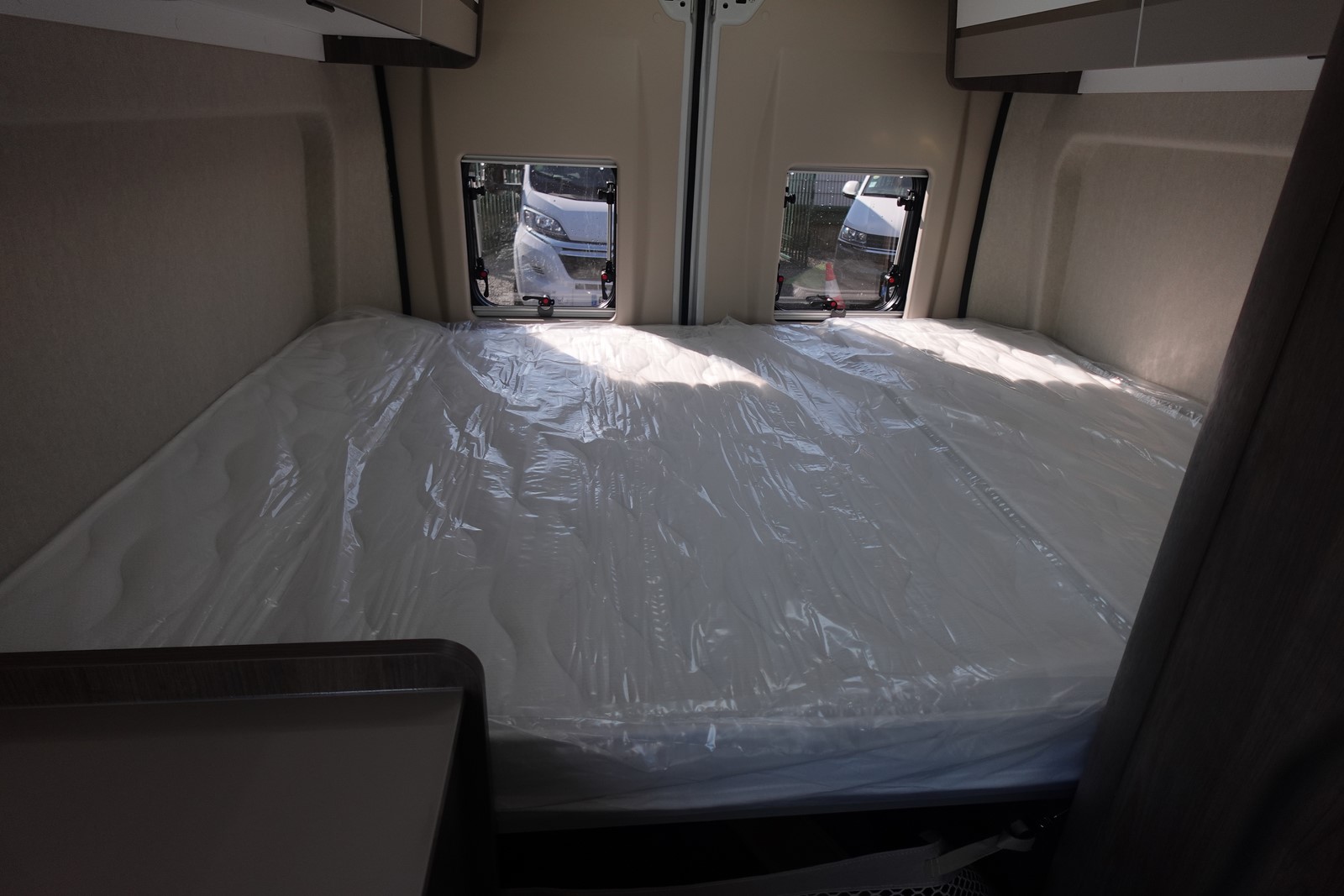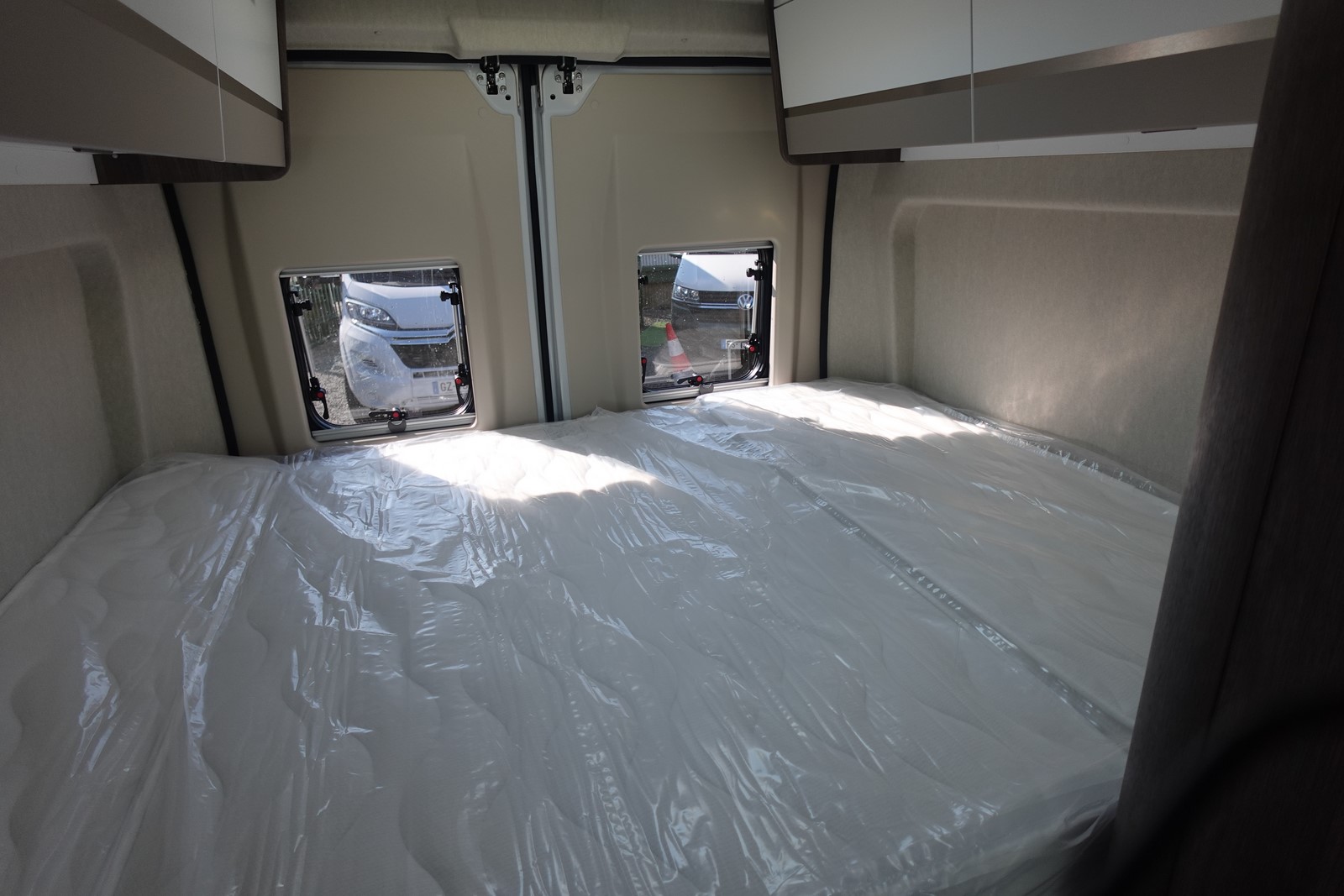Fourgon aménagé comprenant un salon avant panoramique, une salle d’eau avec douche, un lit transversal arrière pour 2 personnes et une cuisine avec de nombreux rangement.
