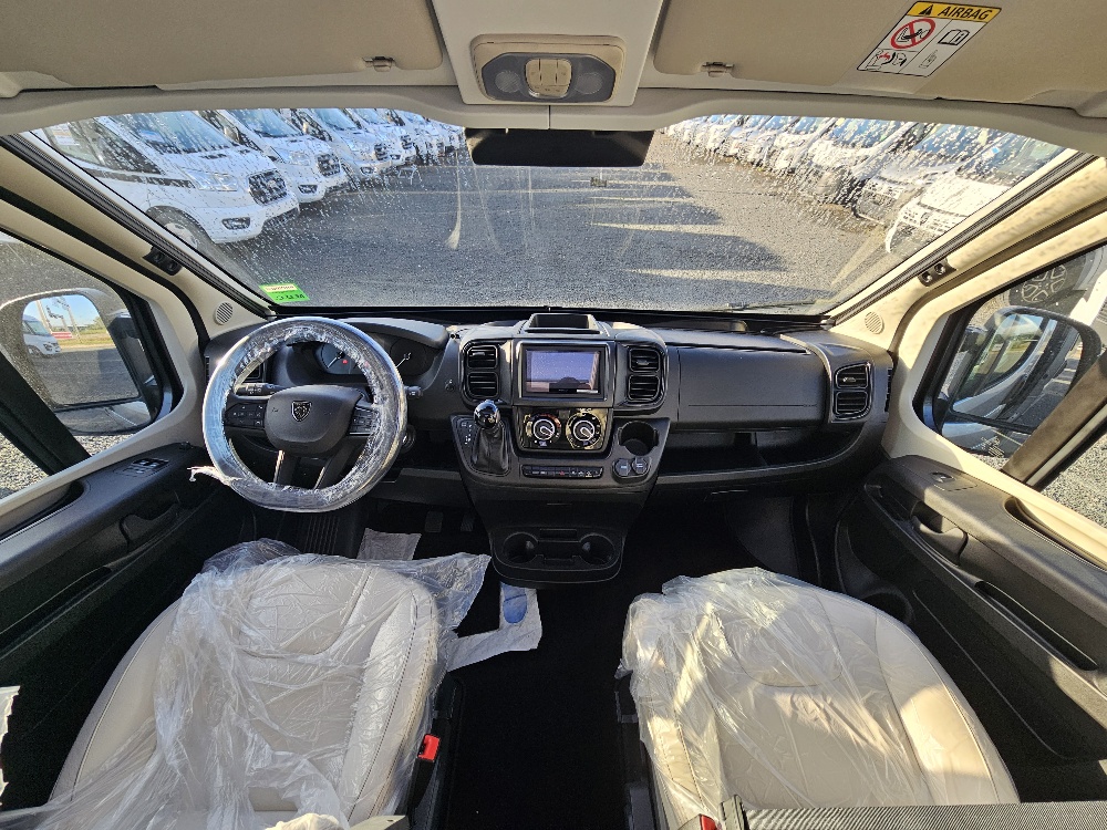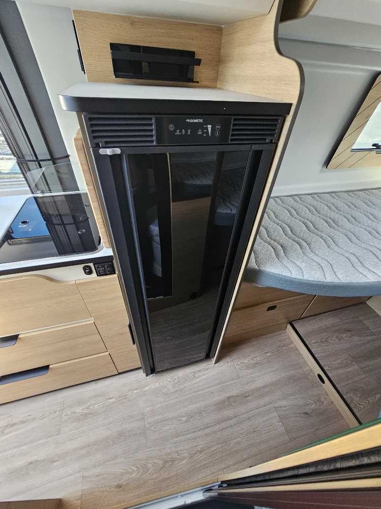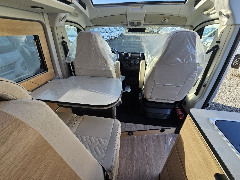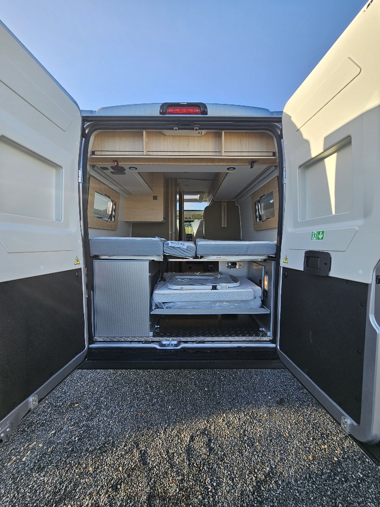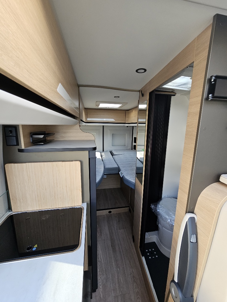 Magnifique fourgon aménagé comprenant un salon avant panoramique, un grand réfrigérateur, une salle d’eau DUO’SPACE avec paroi pivotante et des lits jumeaux.
