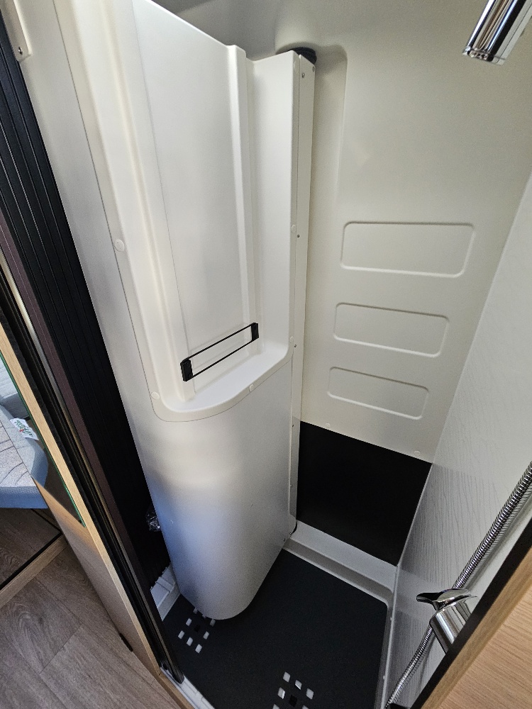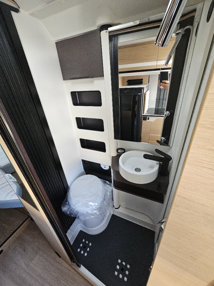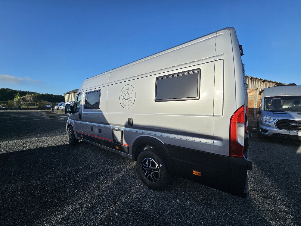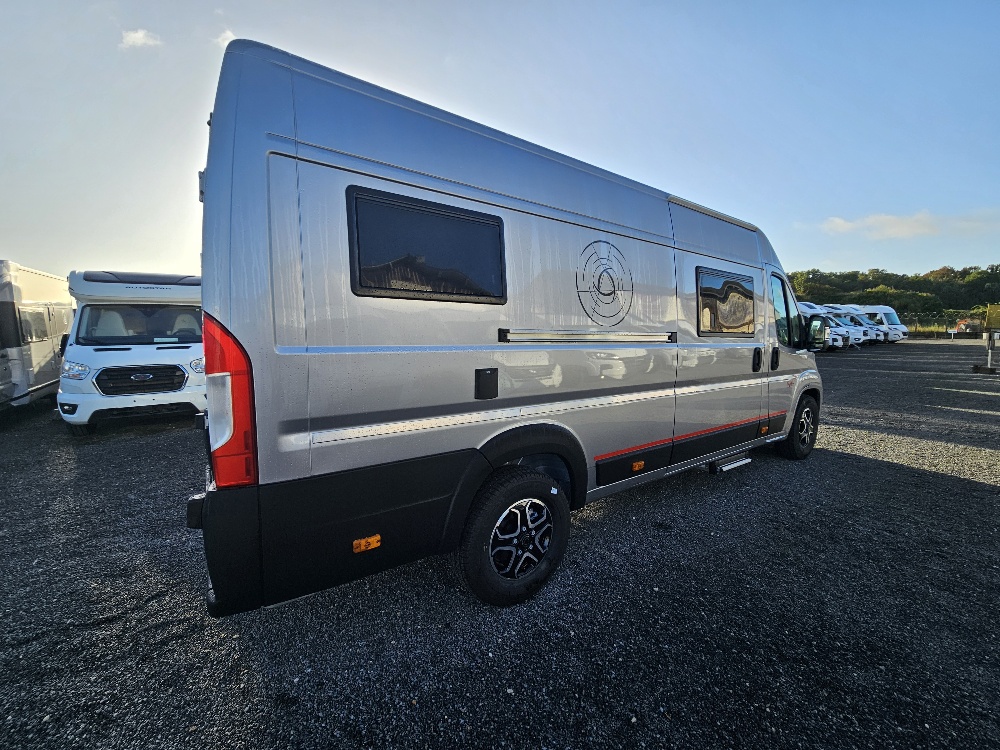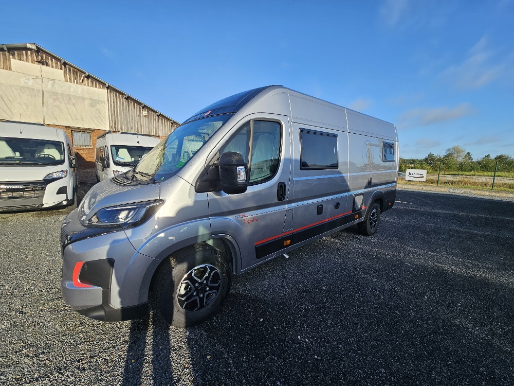Magnifique fourgon aménagé comprenant un salon avant panoramique, un grand réfrigérateur, une salle d’eau DUO’SPACE avec paroi pivotante et des lits jumeaux.