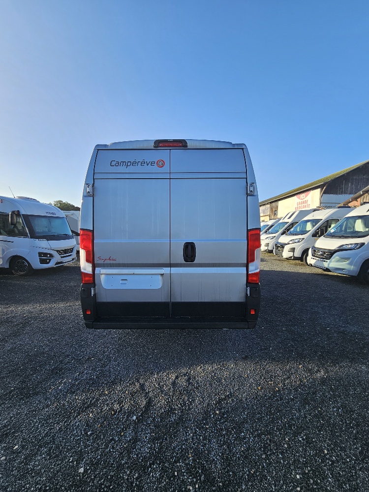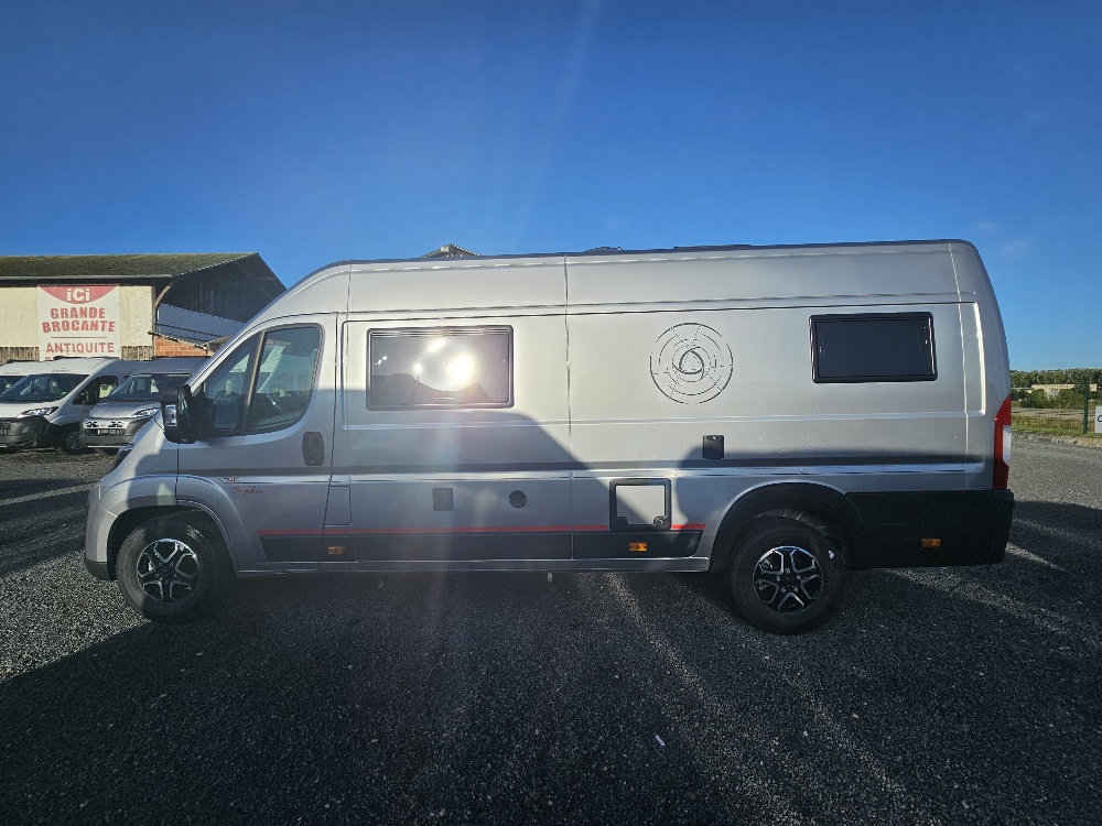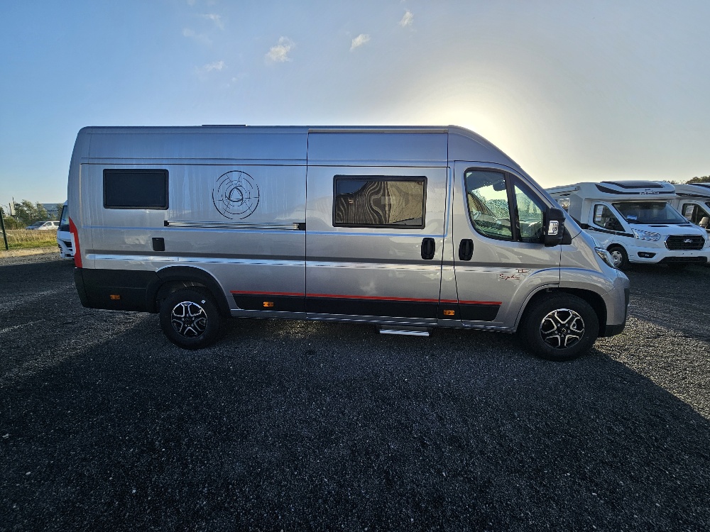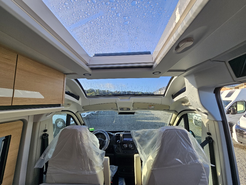 Magnifique fourgon aménagé comprenant un salon avant panoramique, un grand réfrigérateur, une salle d’eau DUO’SPACE avec paroi pivotante et des lits jumeaux.