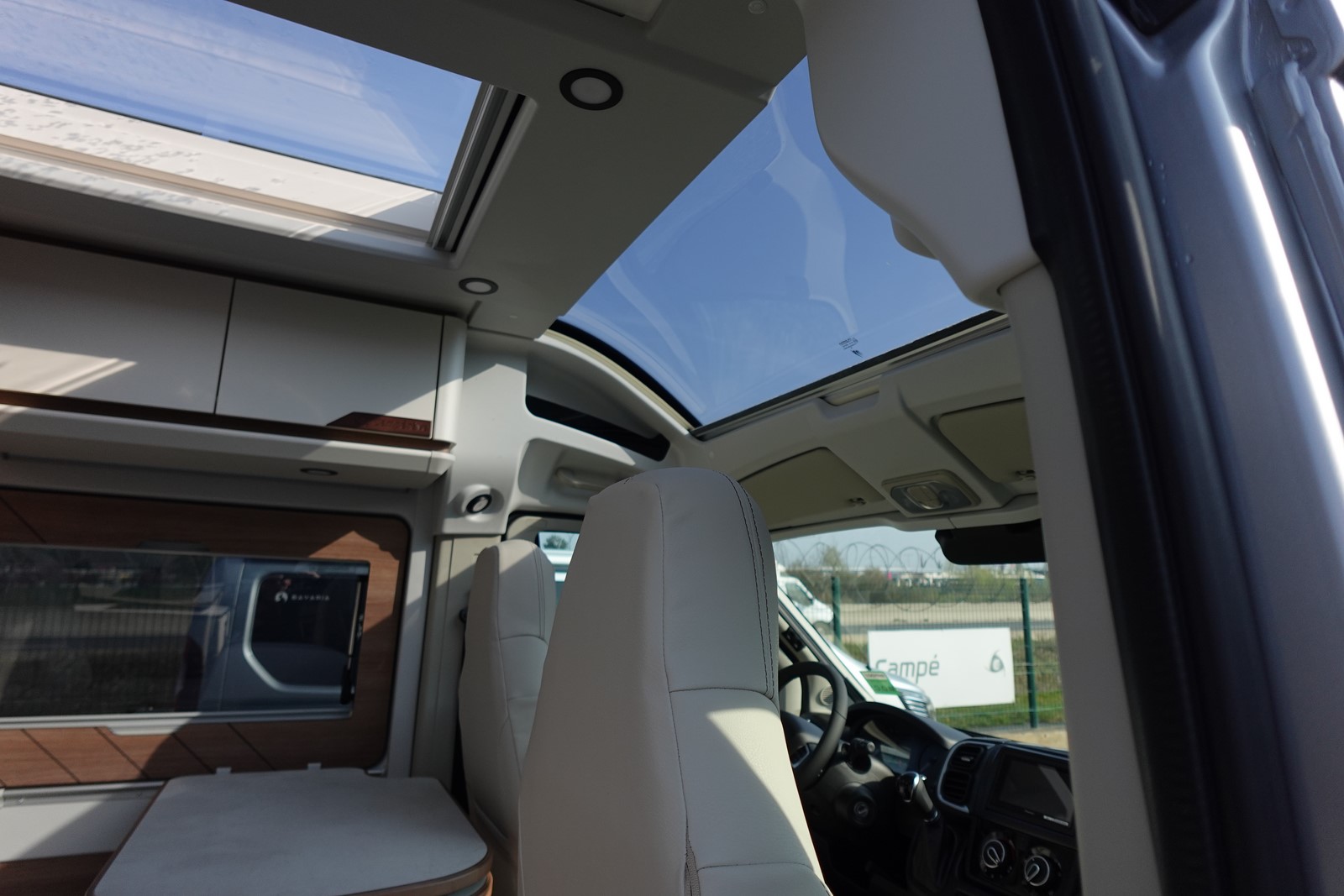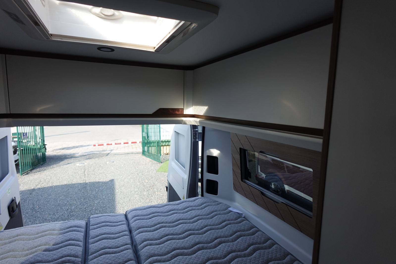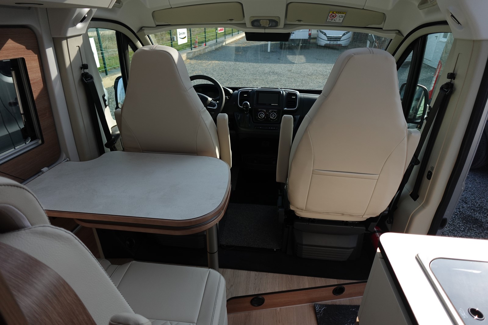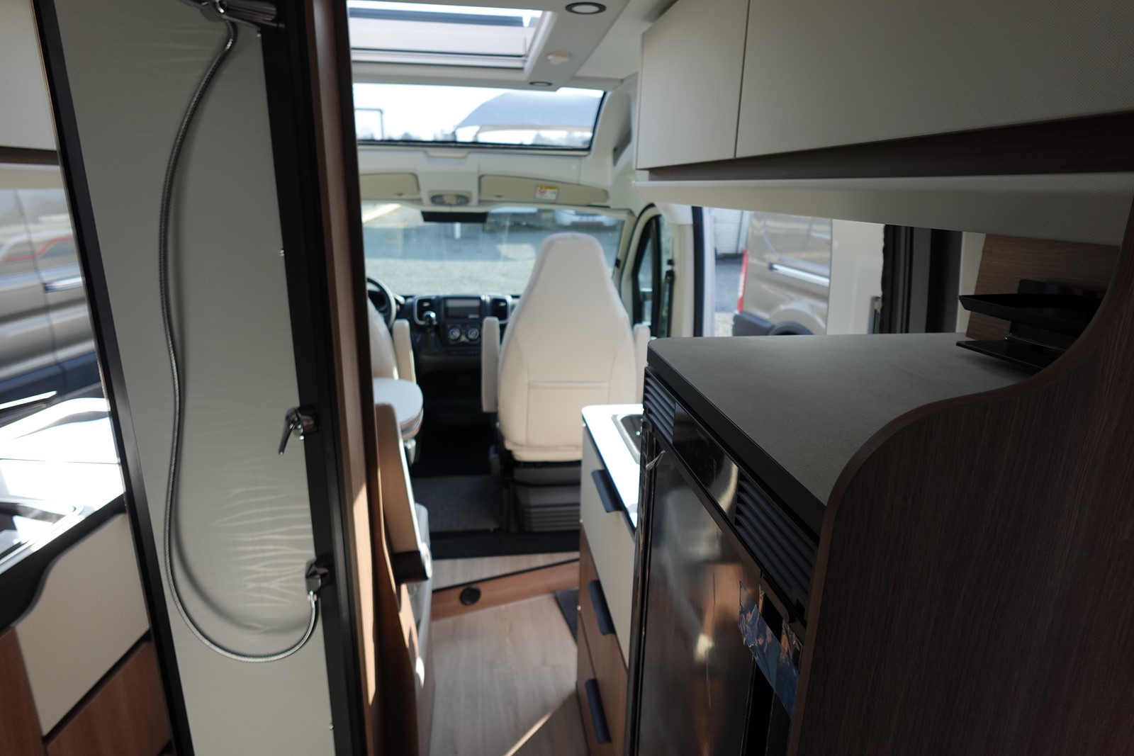 Magnifique fourgon aménagé comprenant un salon avant panoramique, un grand réfrigérateur, une salle d’eau DUO’SPACE avec paroi pivotante et des lits jumeaux.