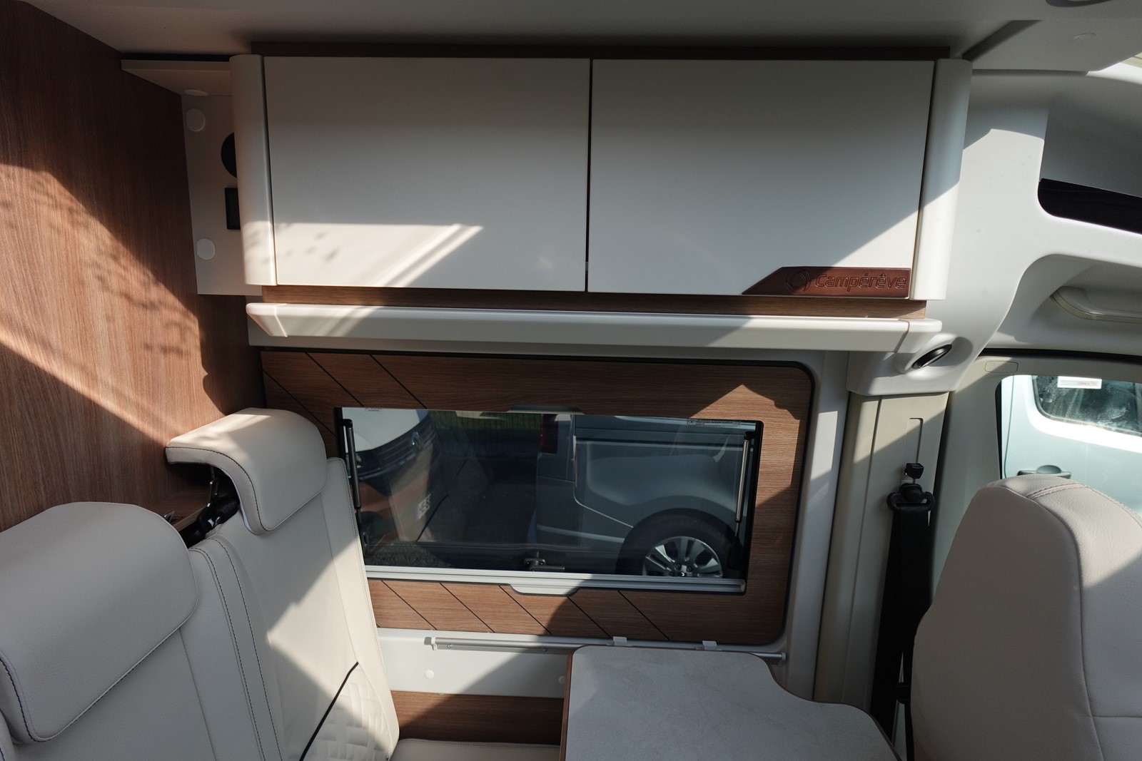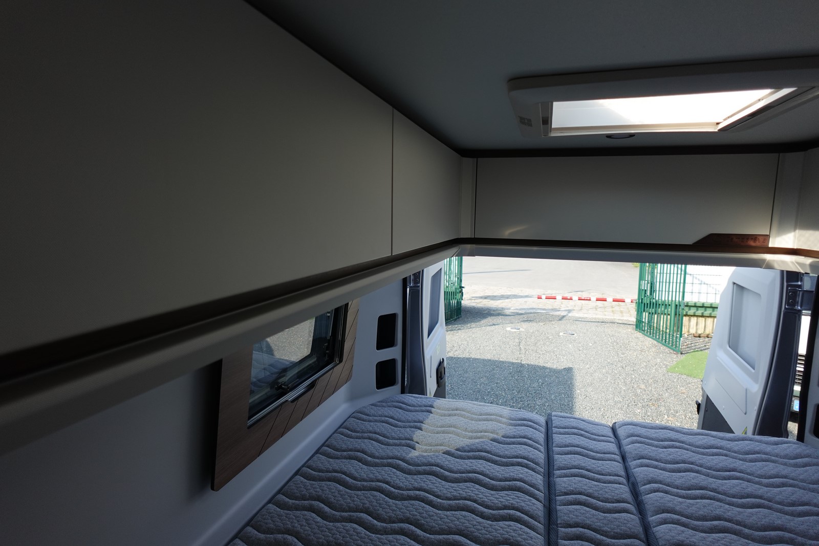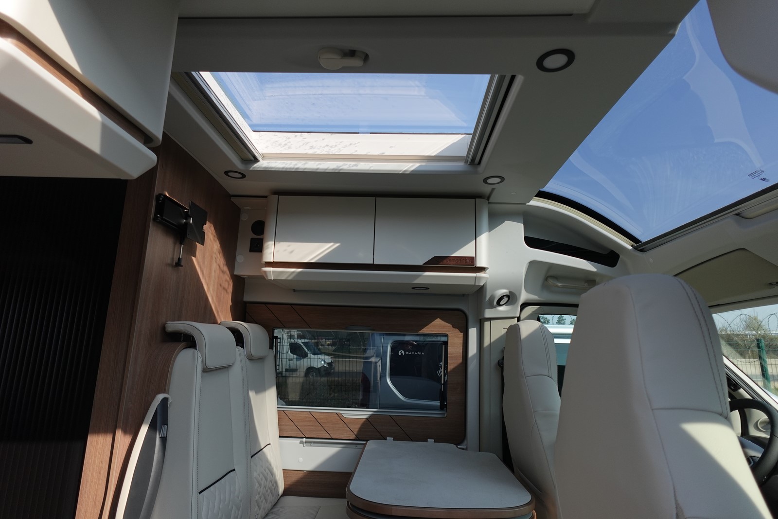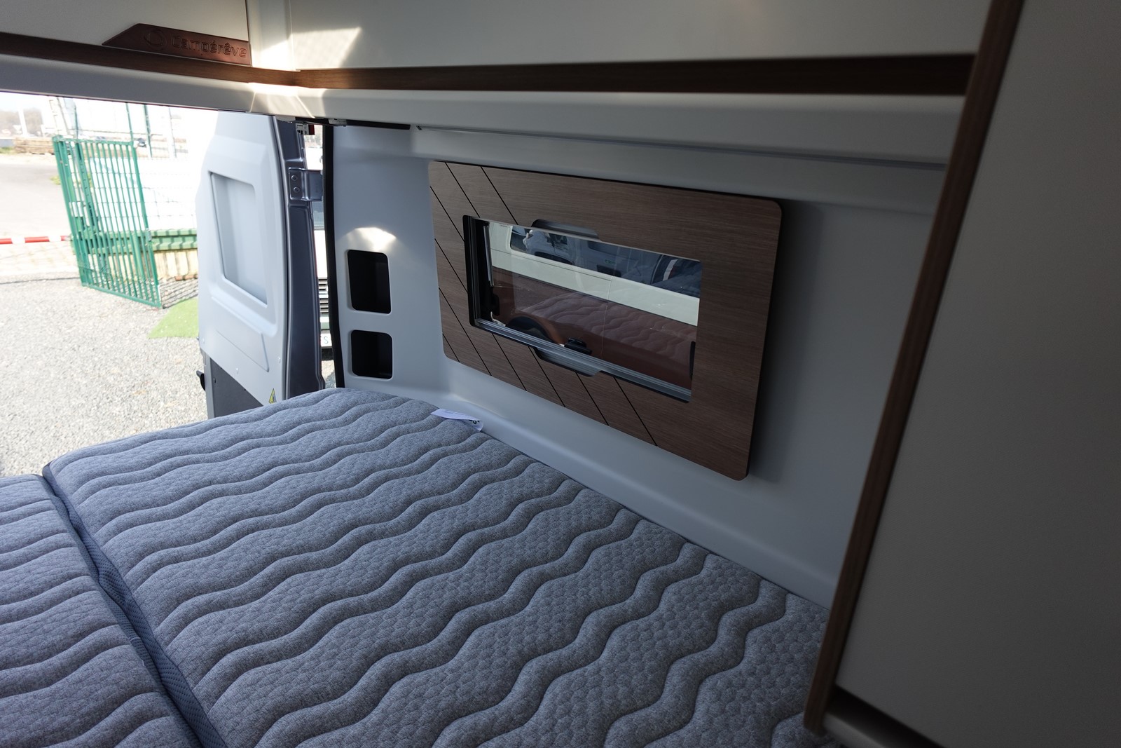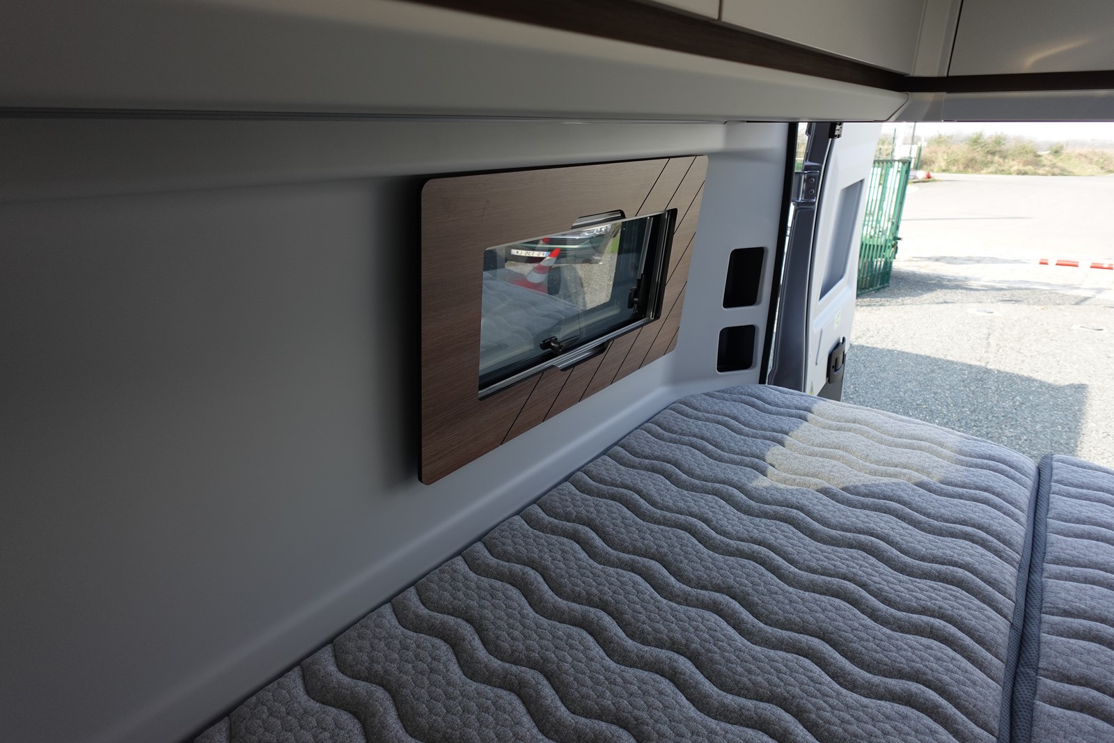 Magnifique fourgon aménagé comprenant un salon avant panoramique, un grand réfrigérateur, une salle d’eau DUO’SPACE avec paroi pivotante et des lits jumeaux.