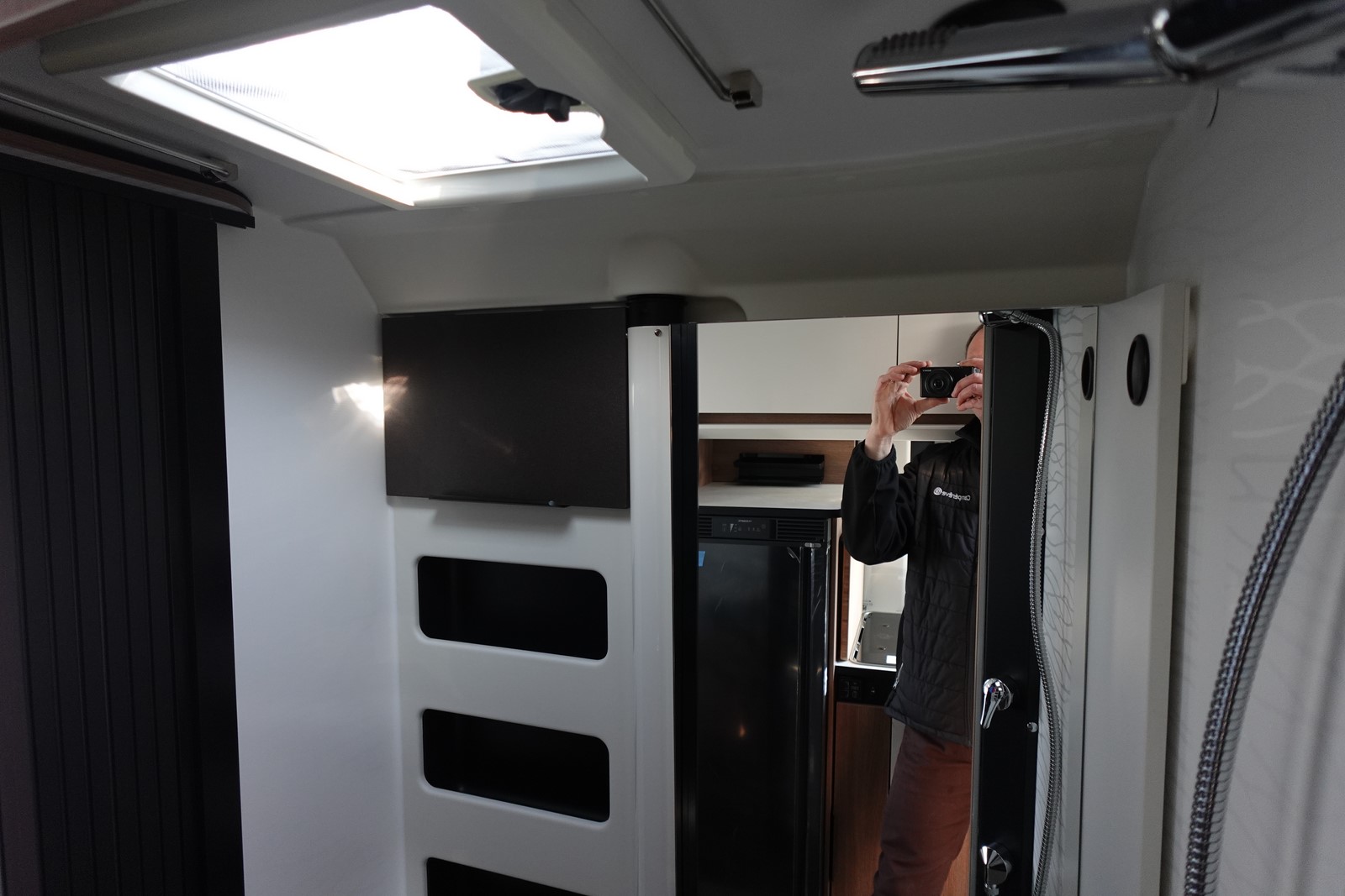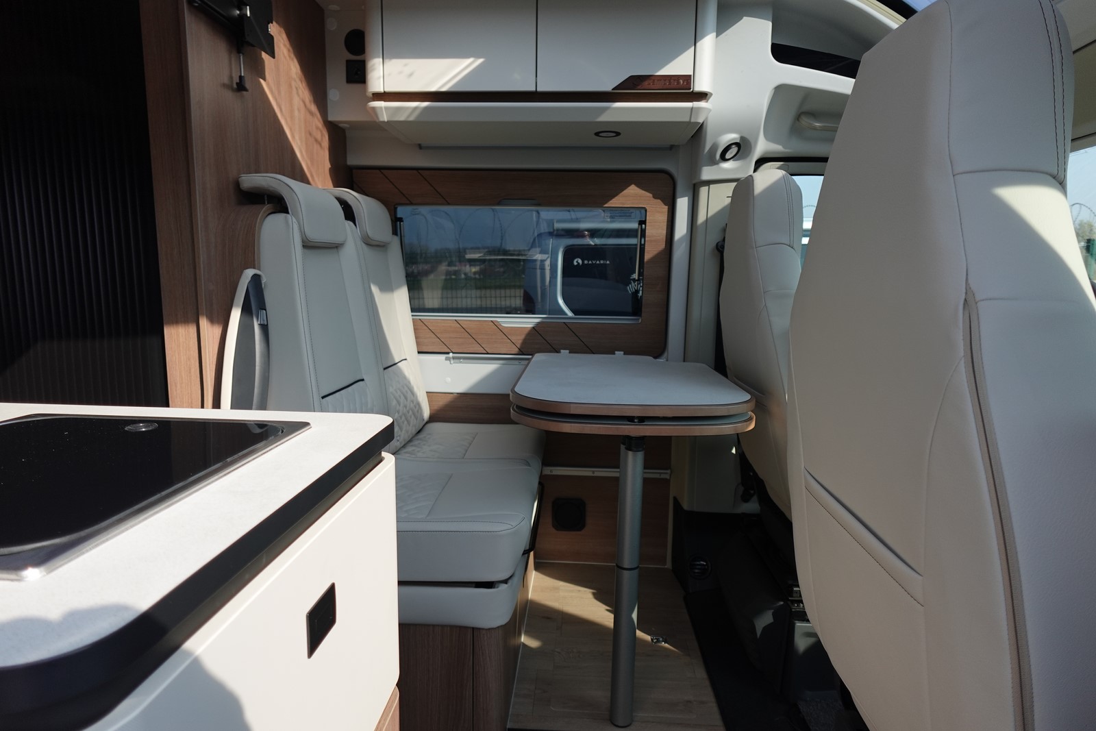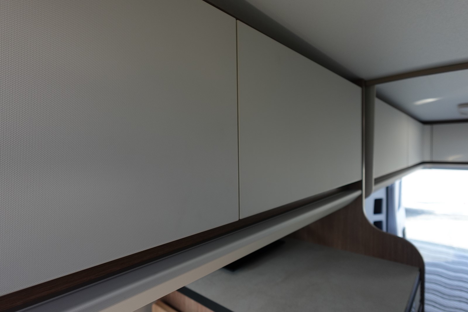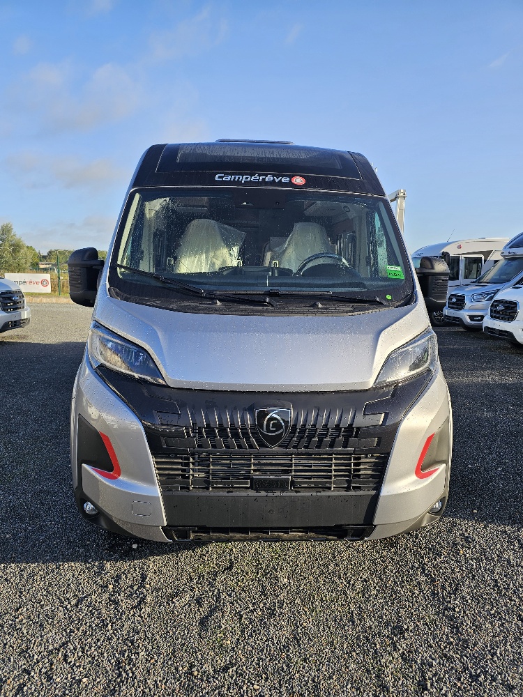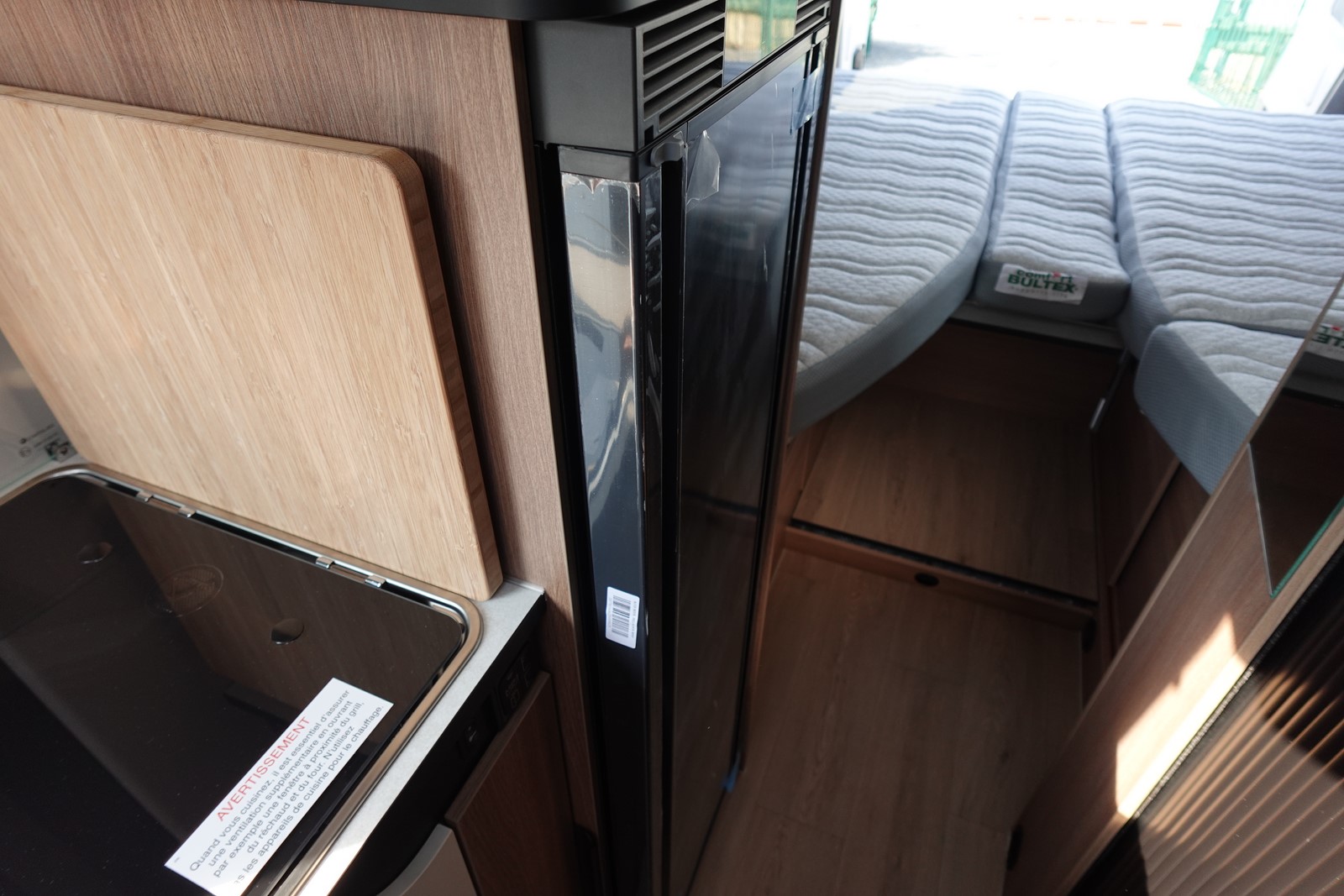 Magnifique fourgon aménagé comprenant un salon avant panoramique, un grand réfrigérateur, une salle d’eau DUO’SPACE avec paroi pivotante et des lits jumeaux.