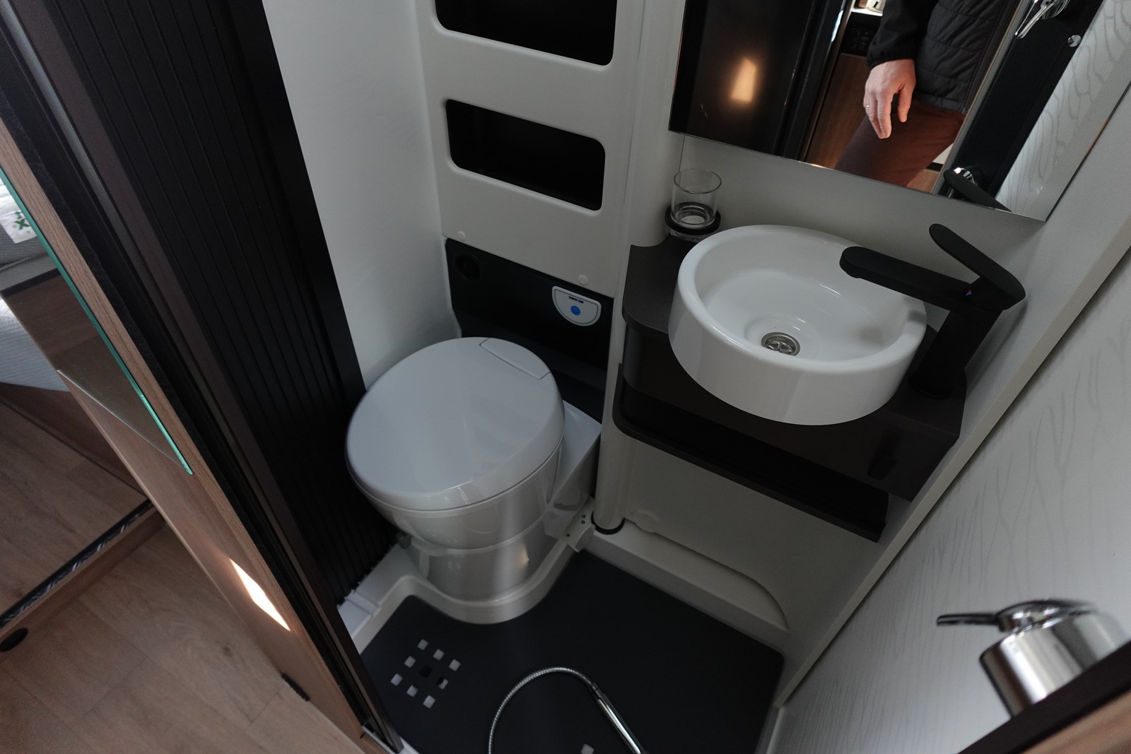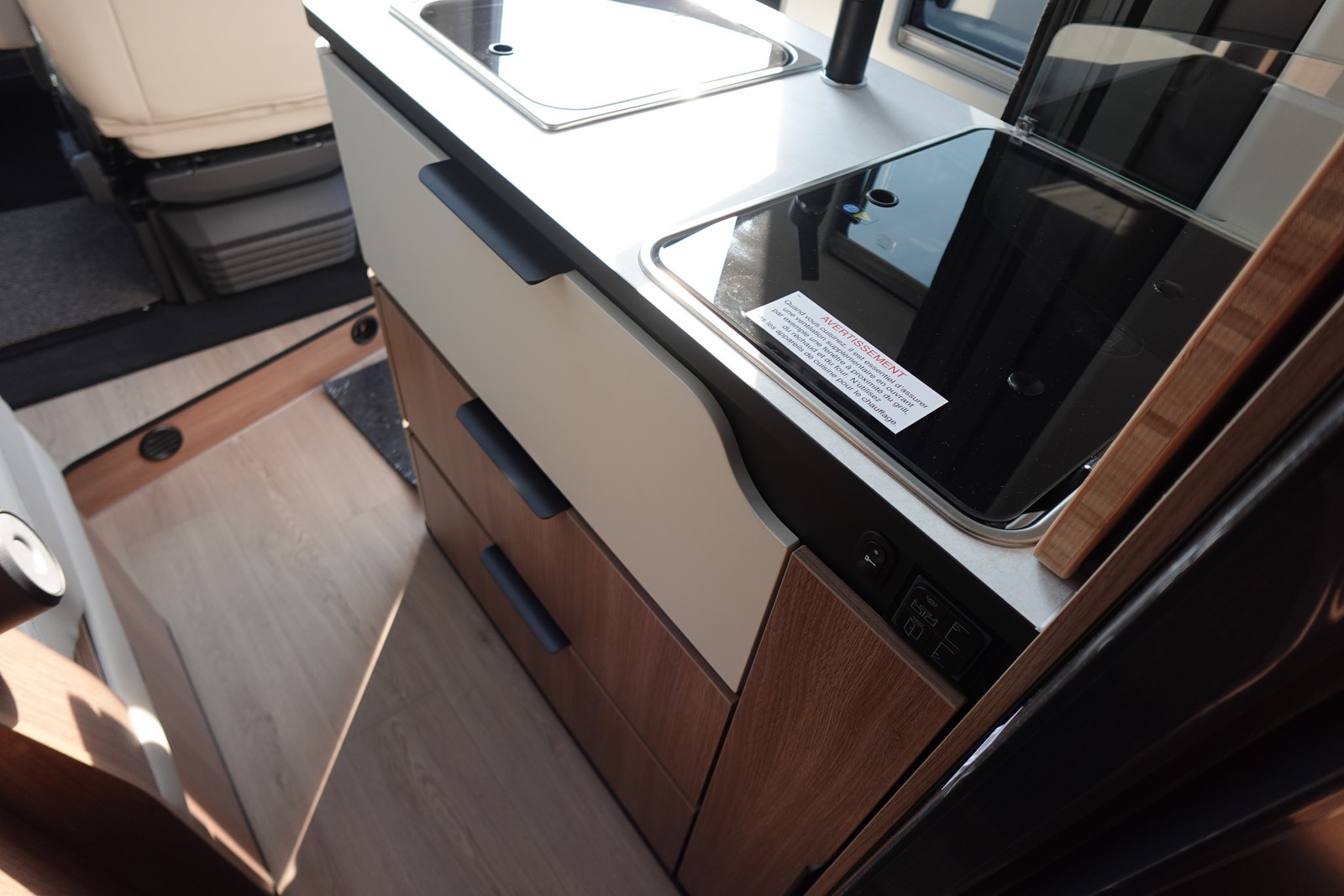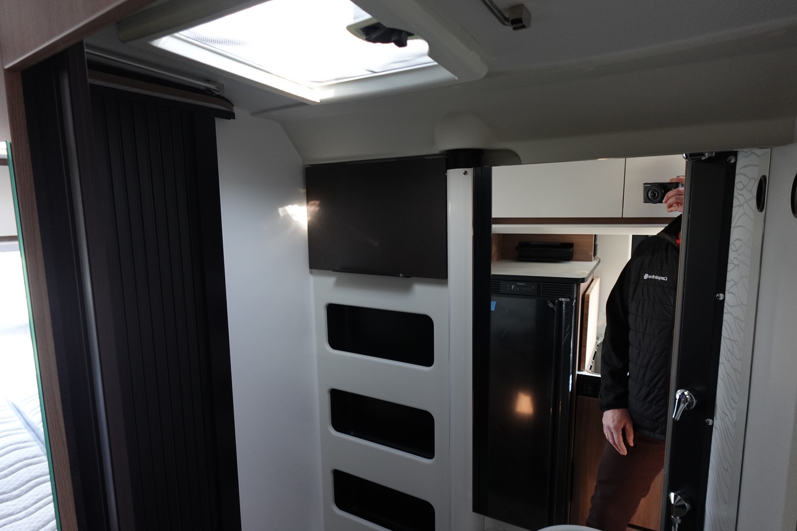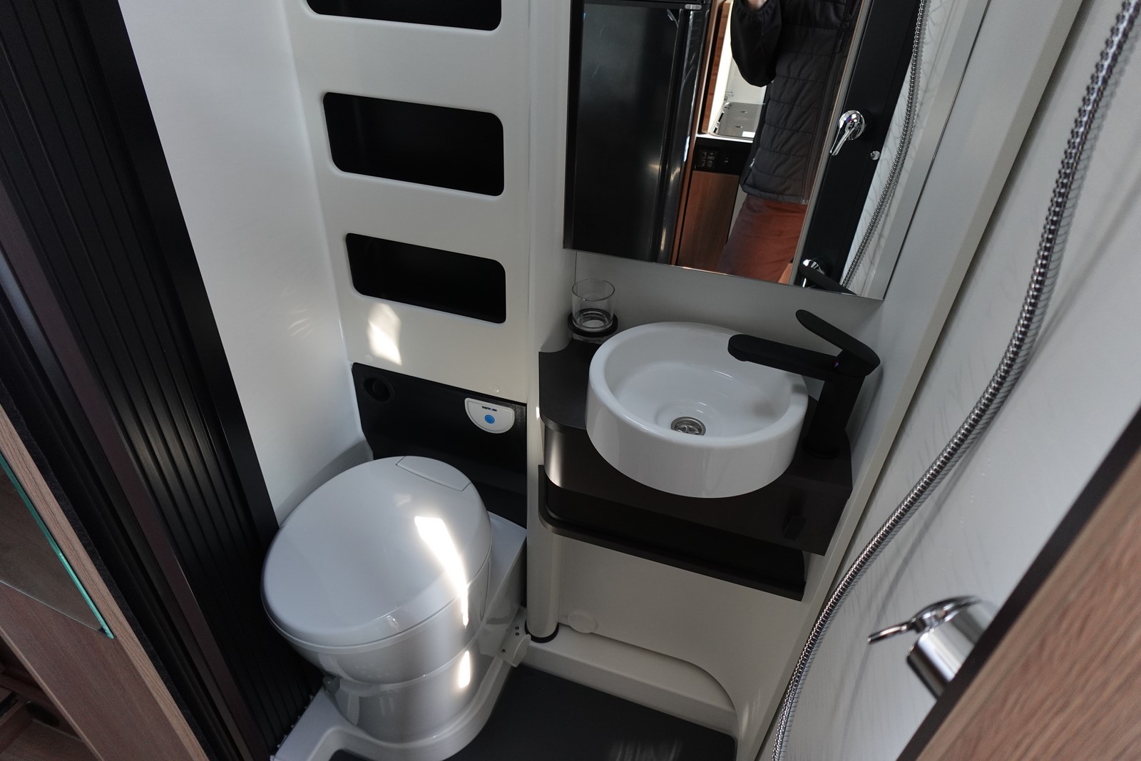 Magnifique fourgon aménagé comprenant un salon avant panoramique, un grand réfrigérateur, une salle d’eau DUO’SPACE avec paroi pivotante et des lits jumeaux.