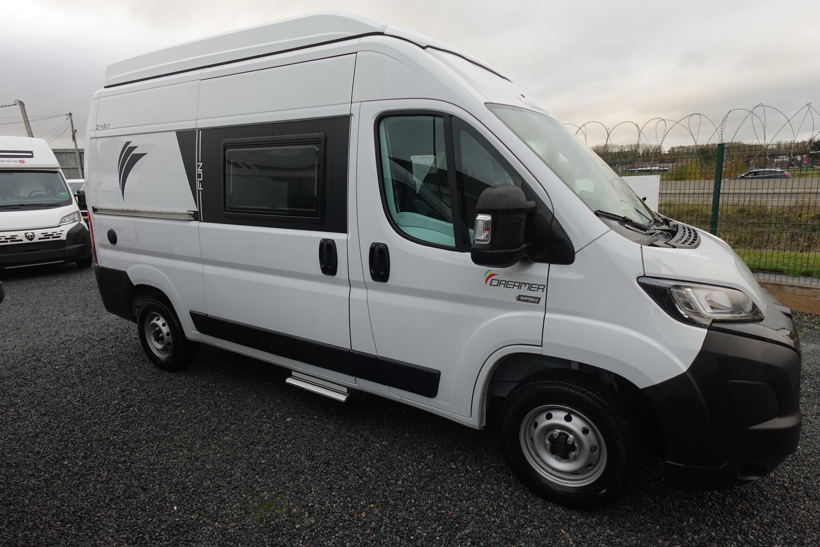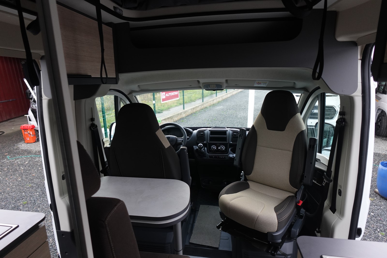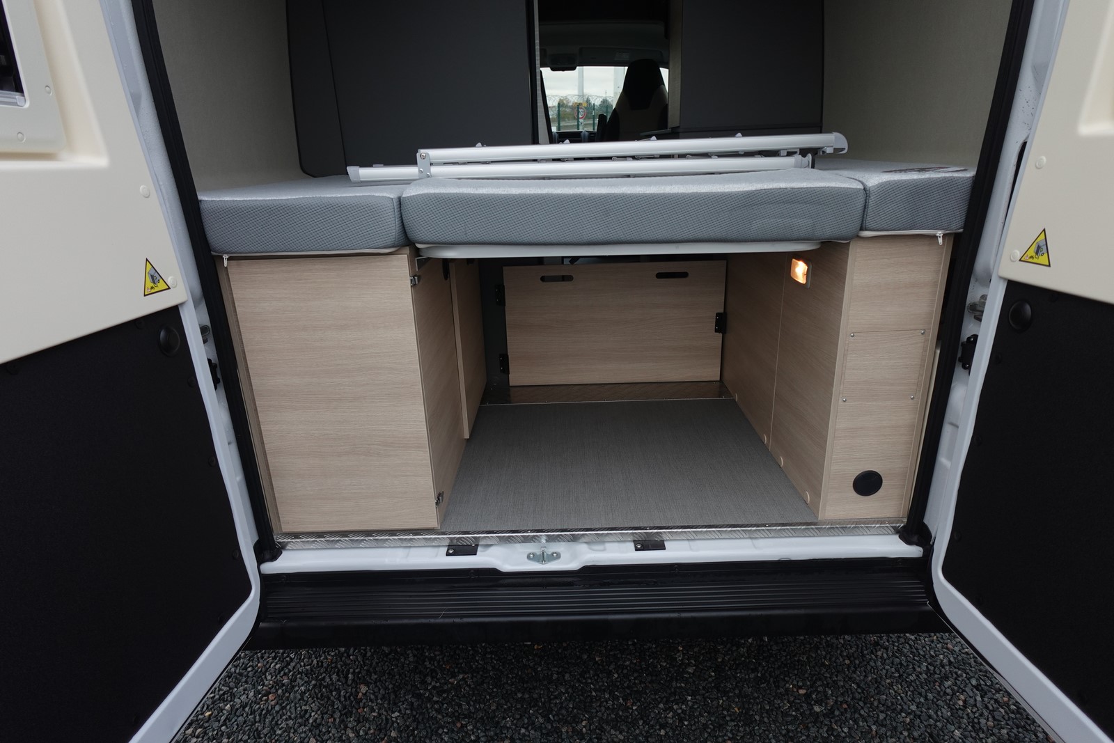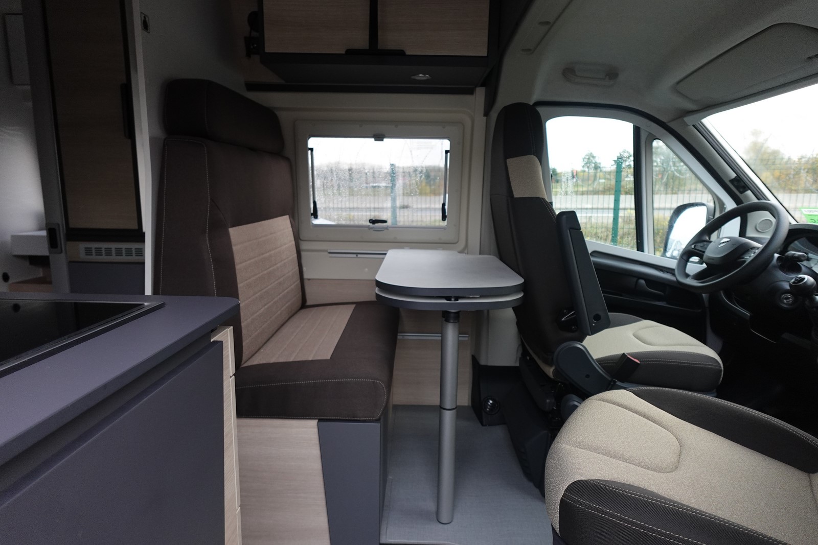 Fourgon aménagé comprenant un salon avant panoramique, une salle d’eau avec douche et WC, un lit arrière transversal, un lit 2 places dans toit relevable et une cuisine avec de nombreux rangements. Le tout en 5.41 m de long.