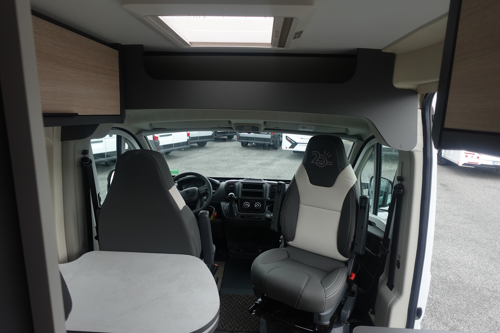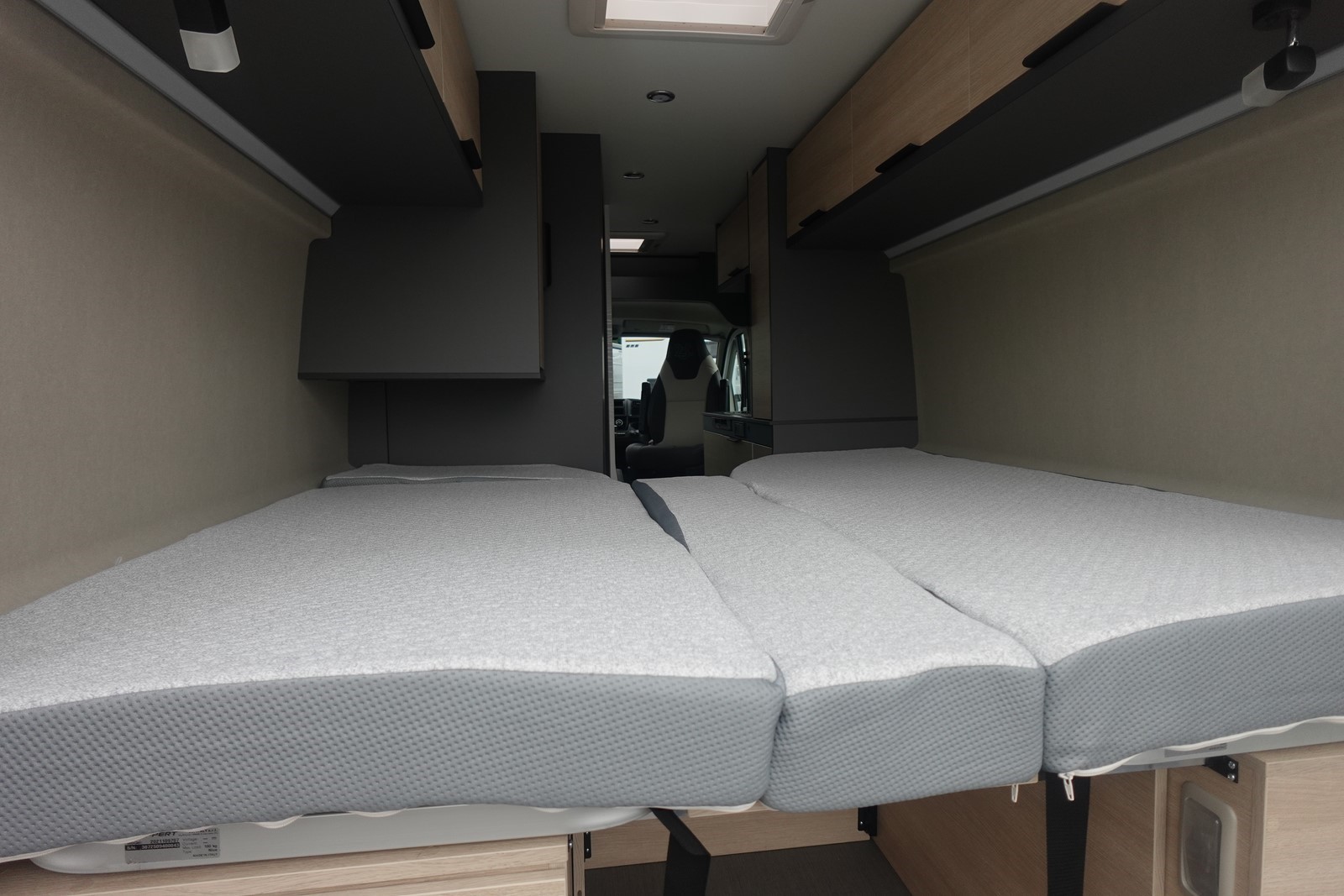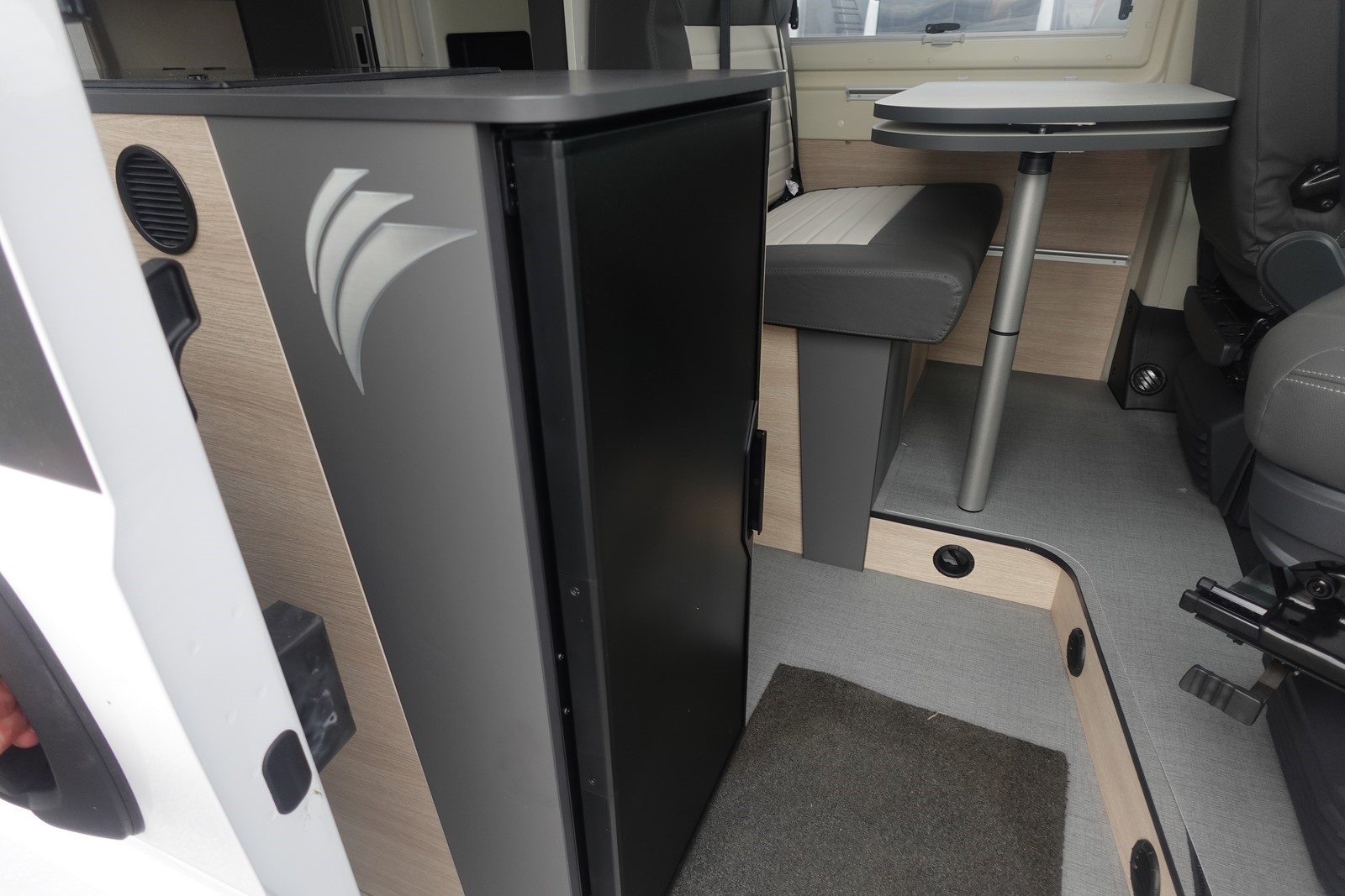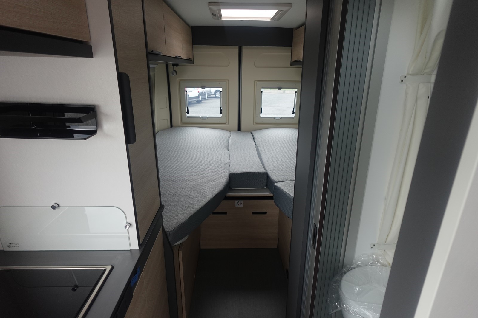 Fourgon aménagé comprenant un salon avant panoramique, un réfrigérateur, une salle d’eau avec douche et WC, une cuisine avec de nombreux rangements et des lits jumeaux.
