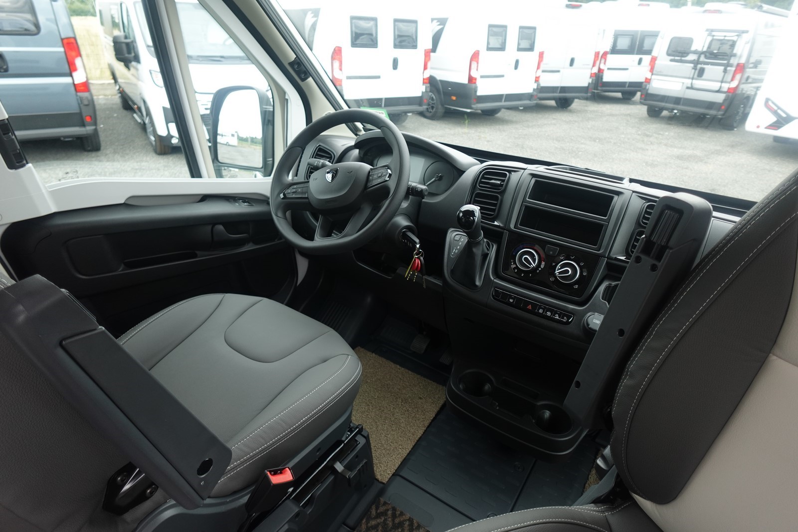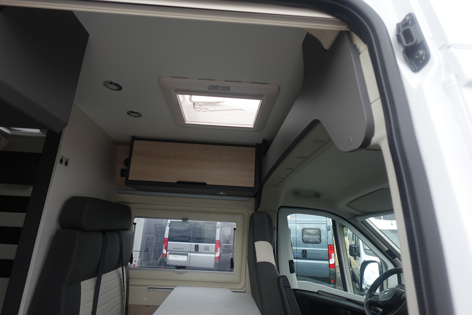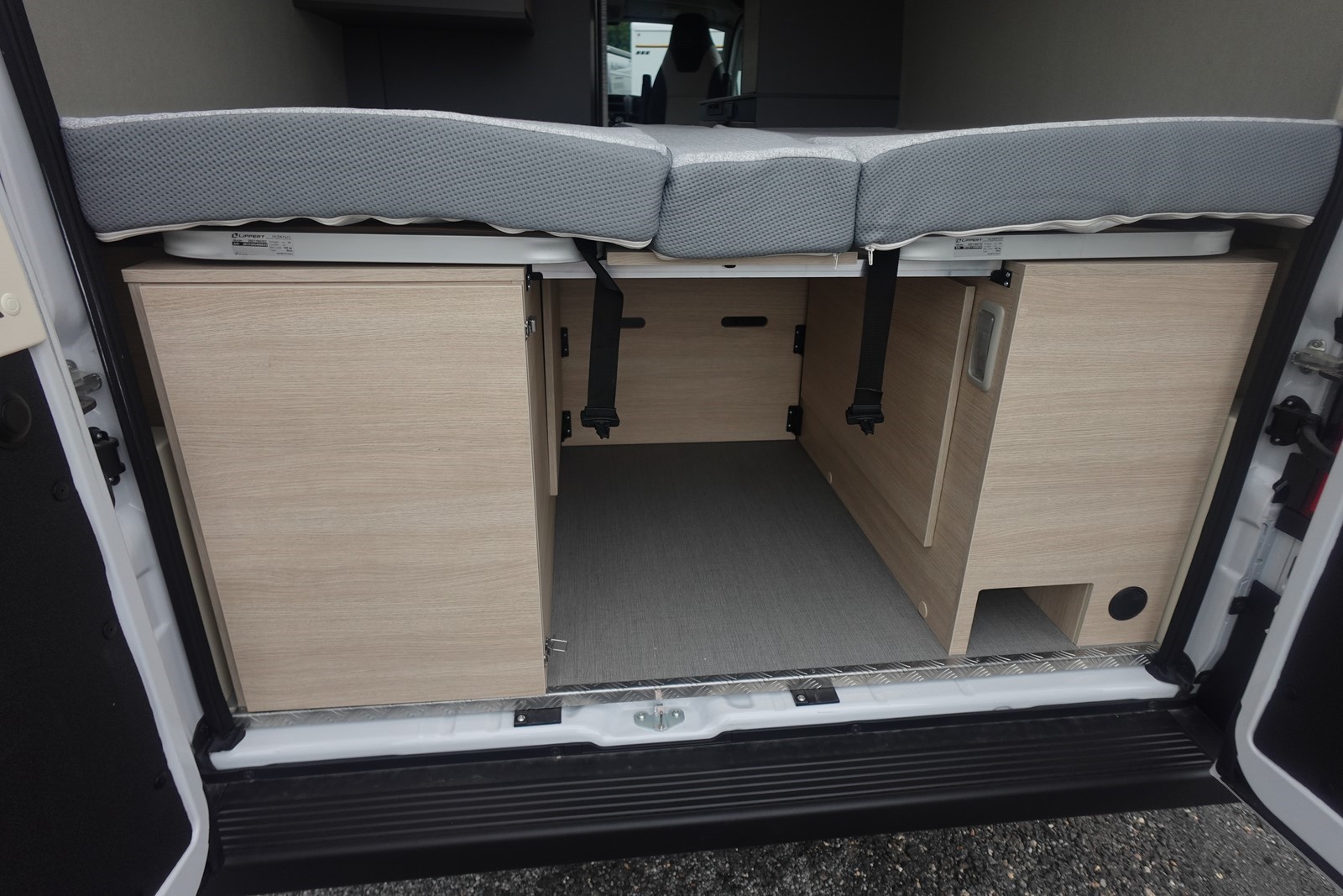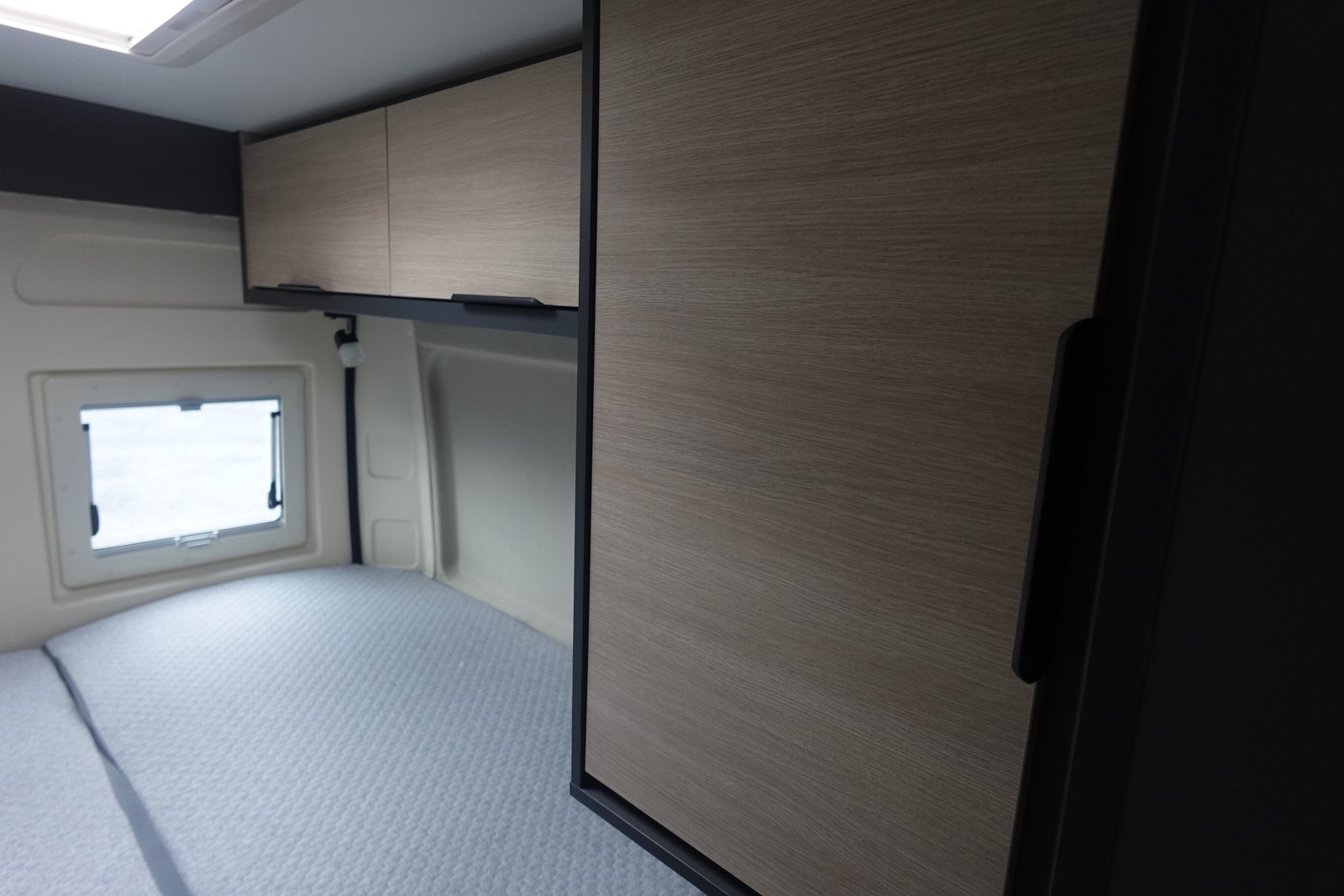 Fourgon aménagé comprenant un salon avant panoramique, un réfrigérateur, une salle d’eau avec douche et WC, une cuisine avec de nombreux rangements et des lits jumeaux.