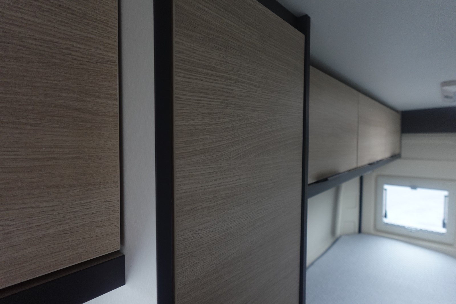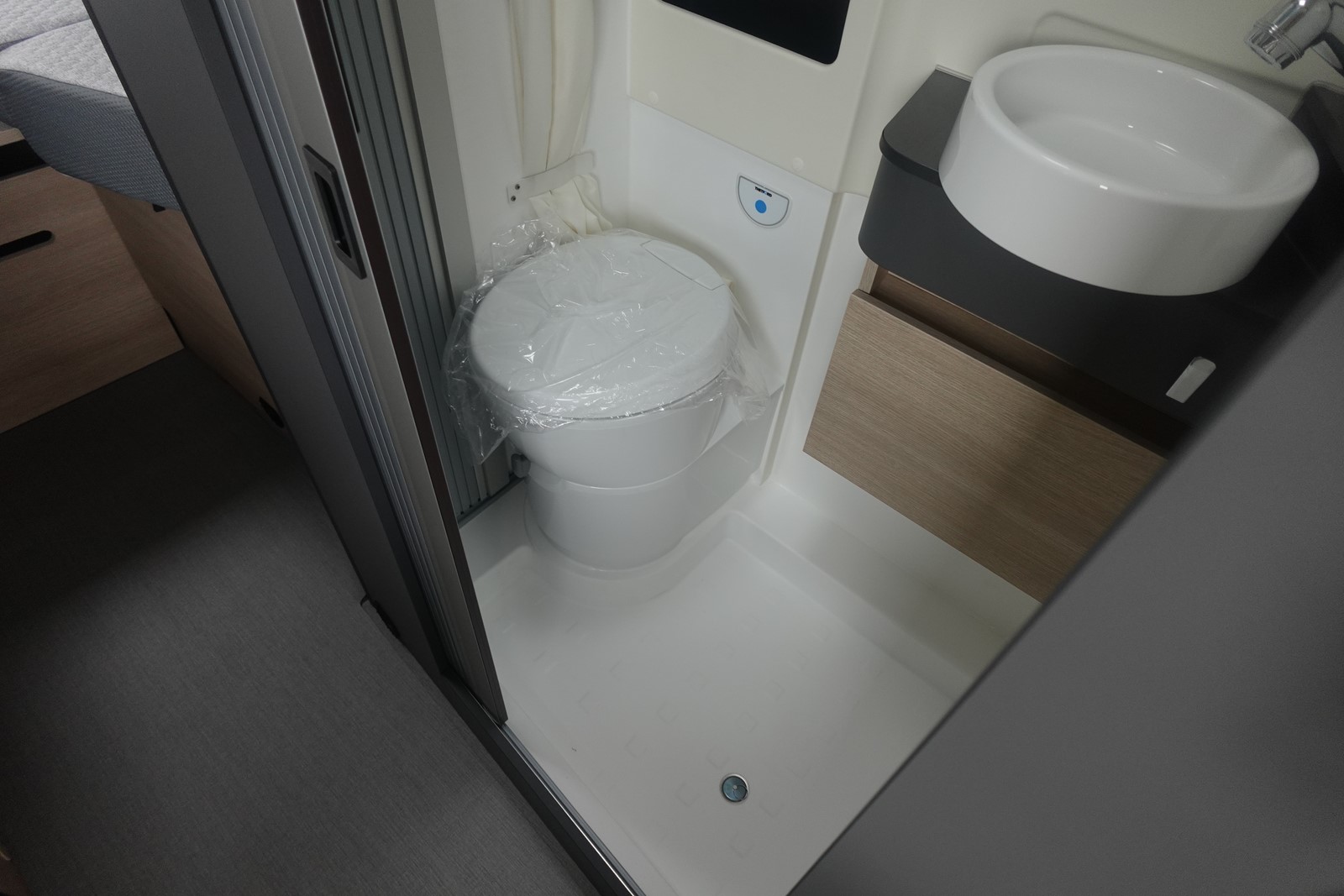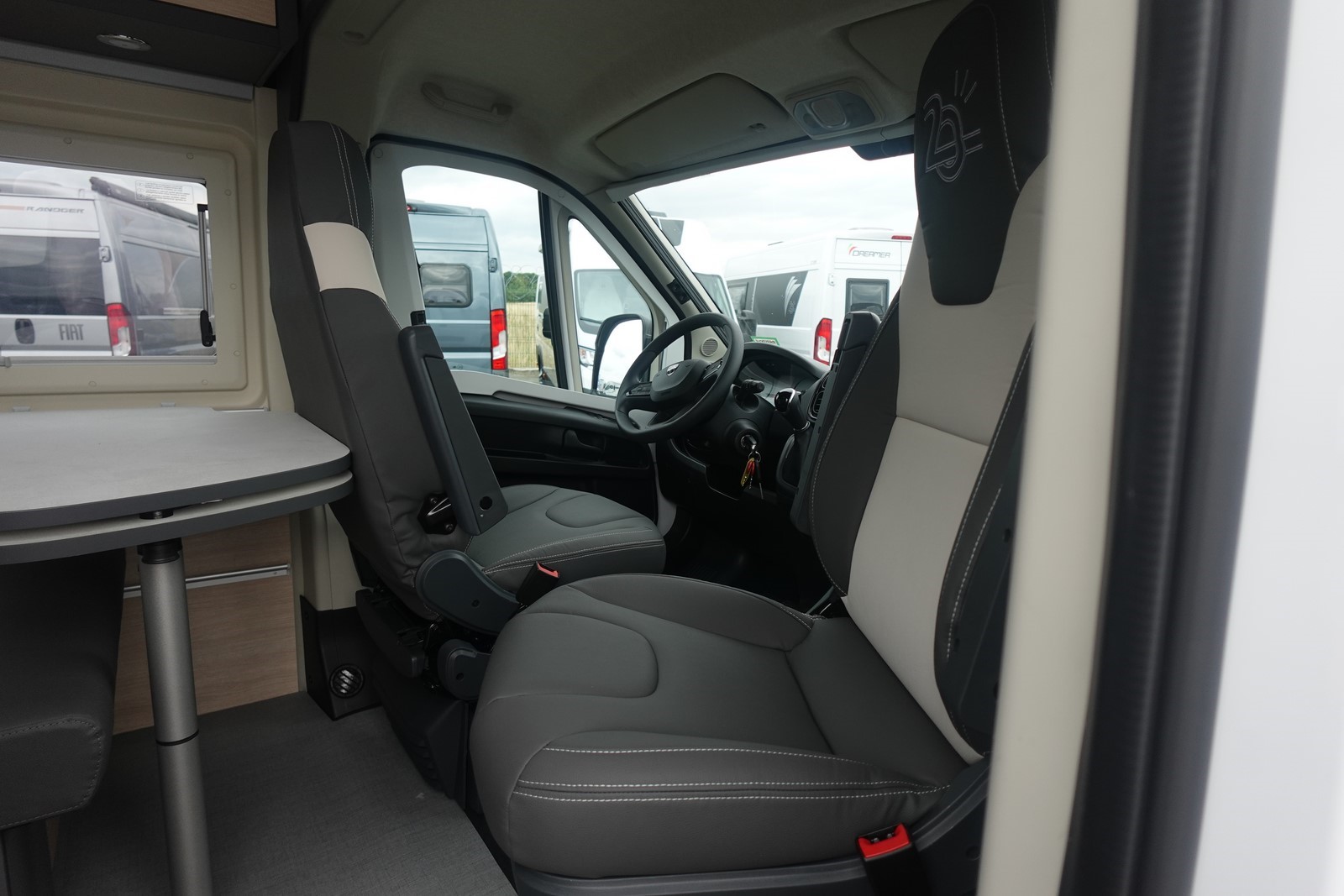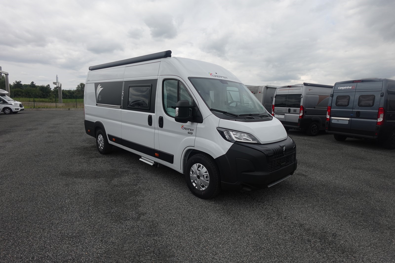 Fourgon aménagé comprenant un salon avant panoramique, un réfrigérateur, une salle d’eau avec douche et WC, une cuisine avec de nombreux rangements et des lits jumeaux.