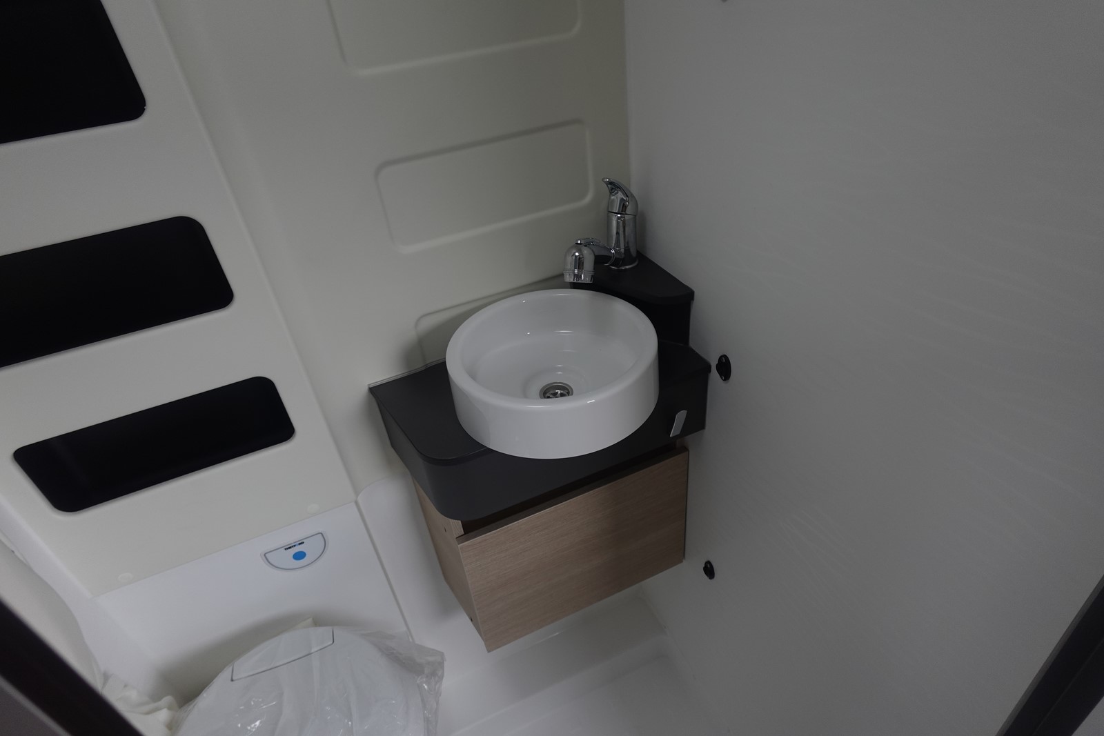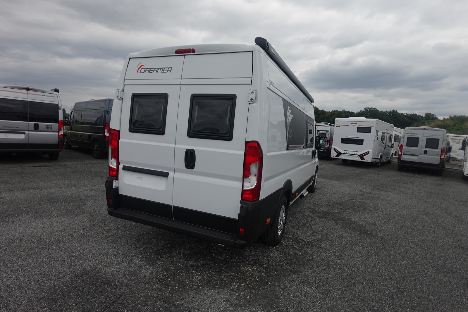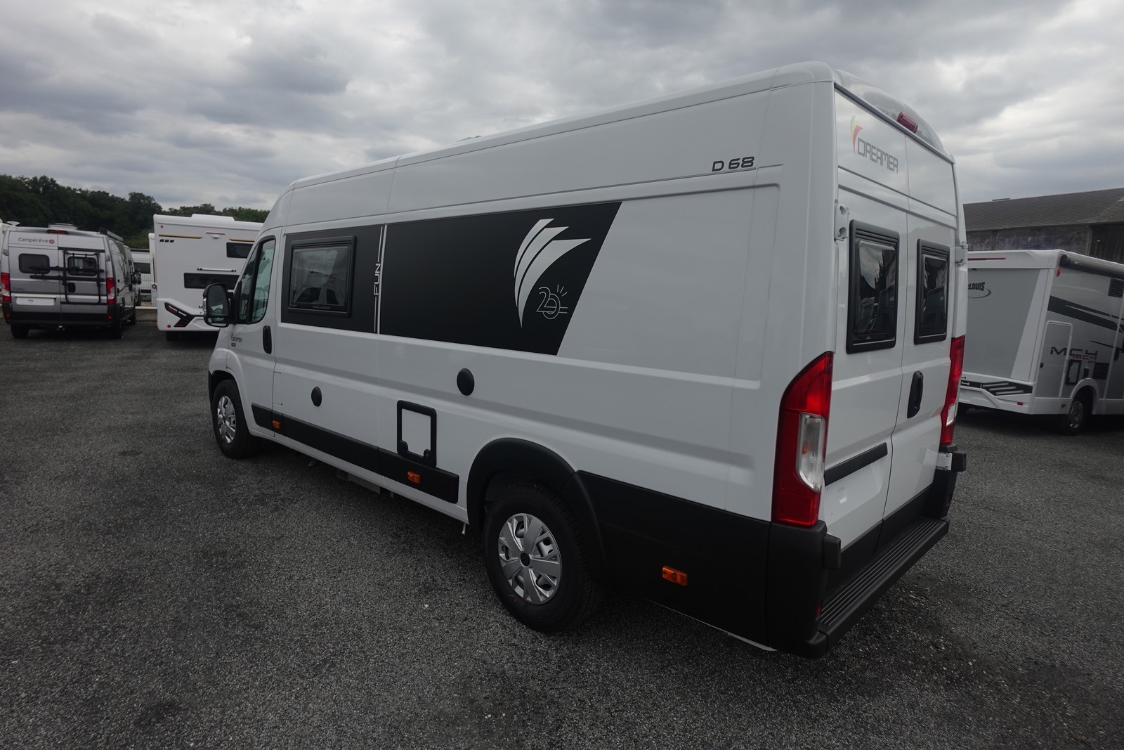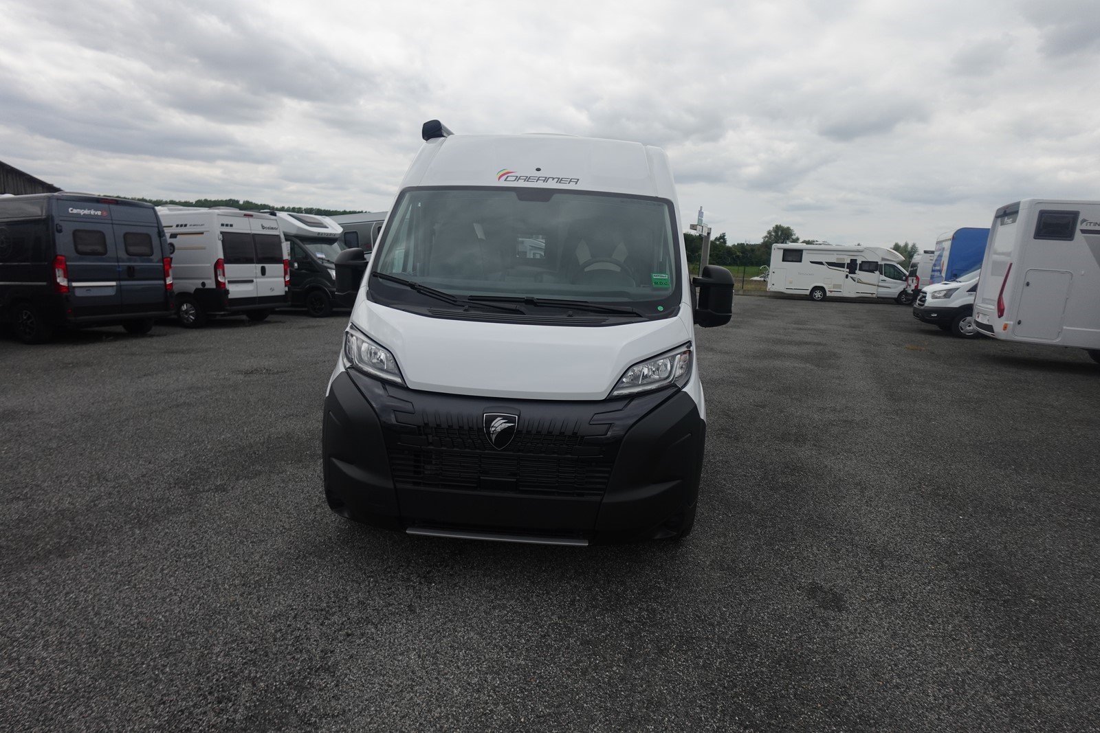 Fourgon aménagé comprenant un salon avant panoramique, un réfrigérateur, une salle d’eau avec douche et WC, une cuisine avec de nombreux rangements et des lits jumeaux.