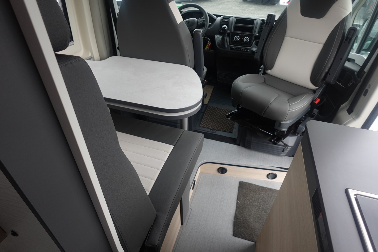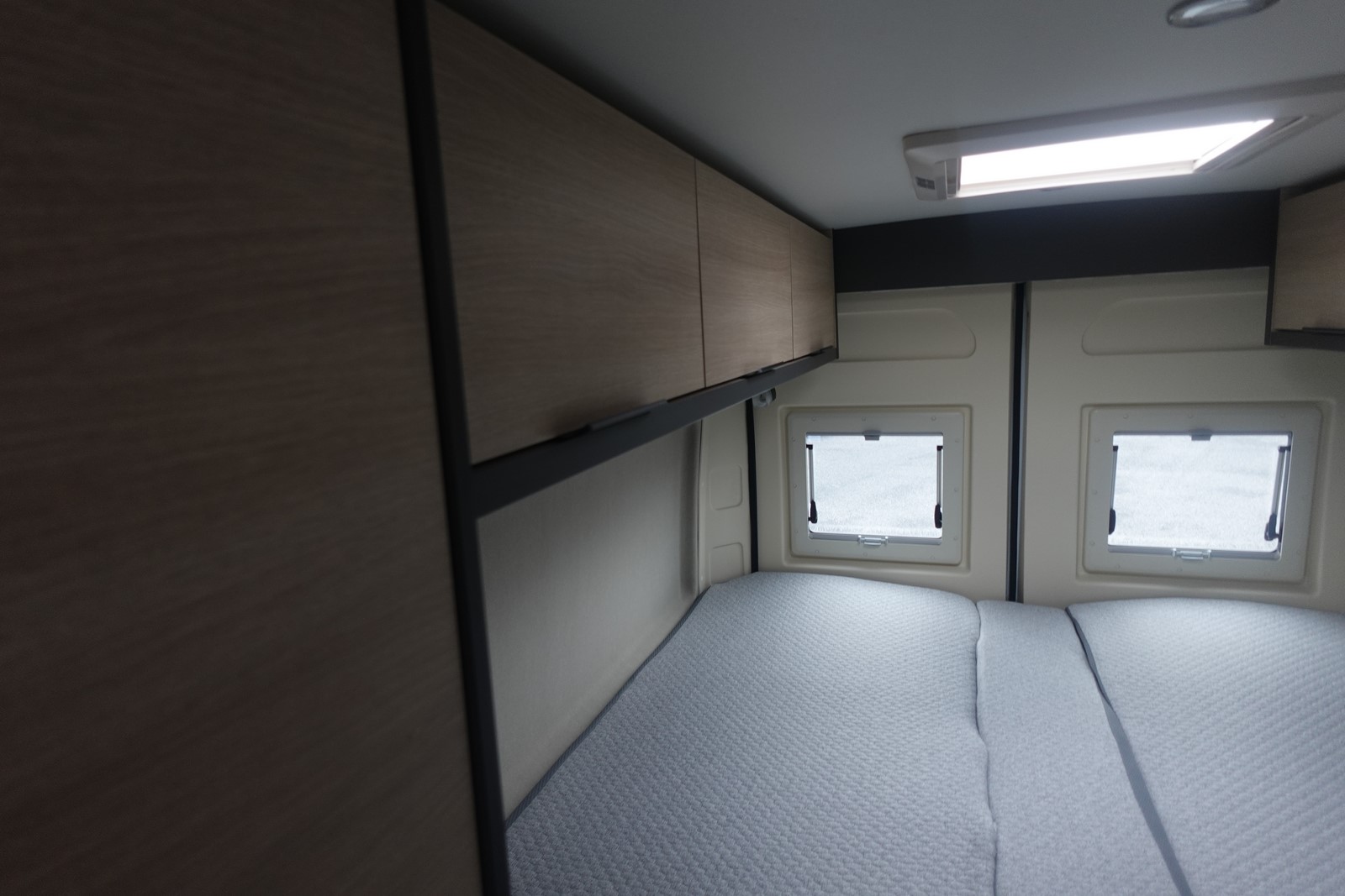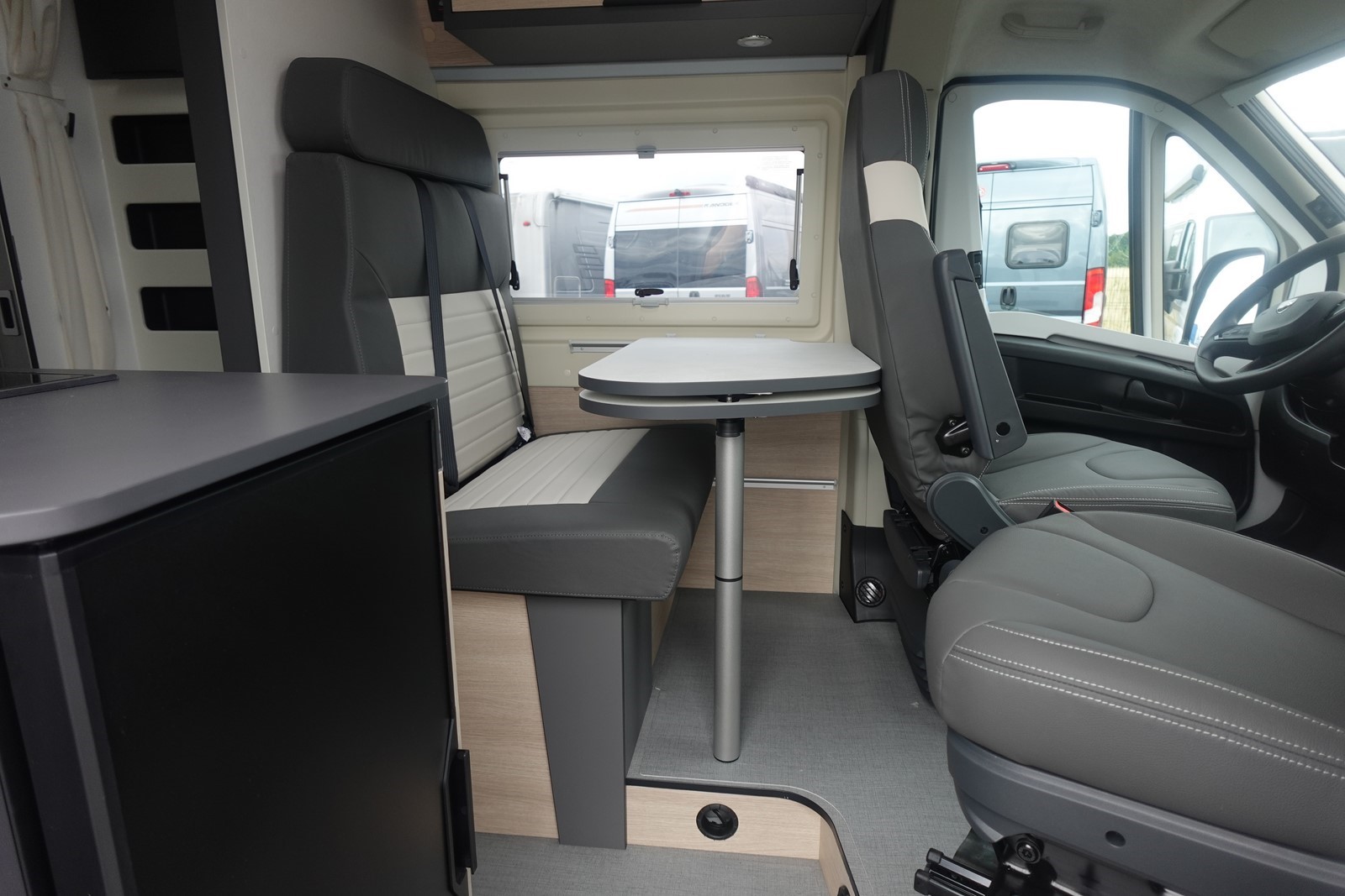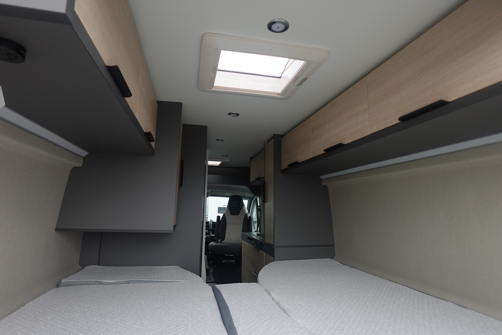 Fourgon aménagé comprenant un salon avant panoramique, un réfrigérateur, une salle d’eau avec douche et WC, une cuisine avec de nombreux rangements et des lits jumeaux.