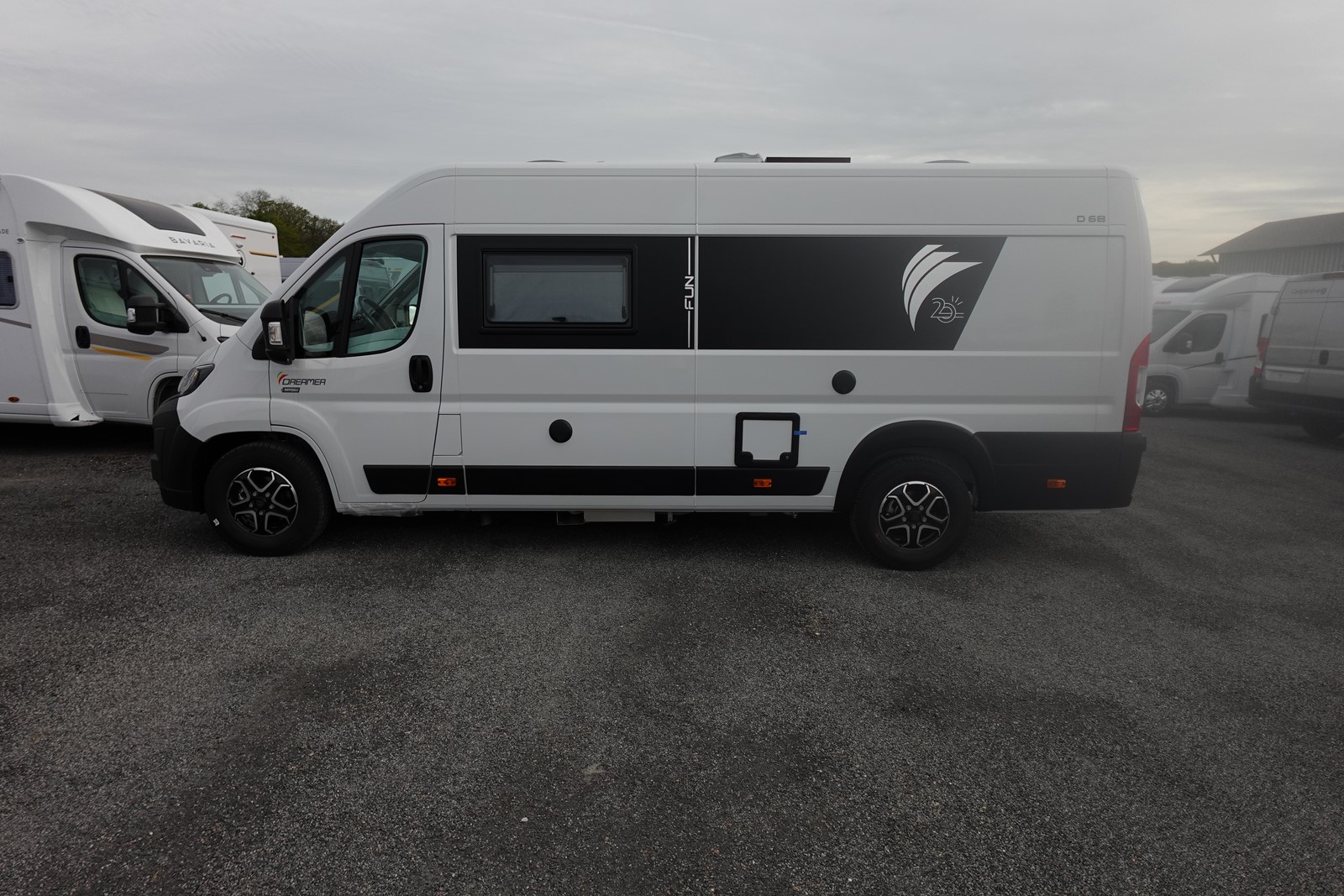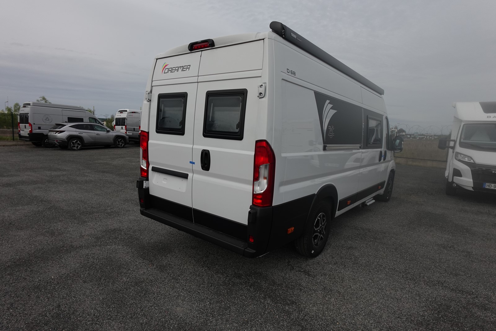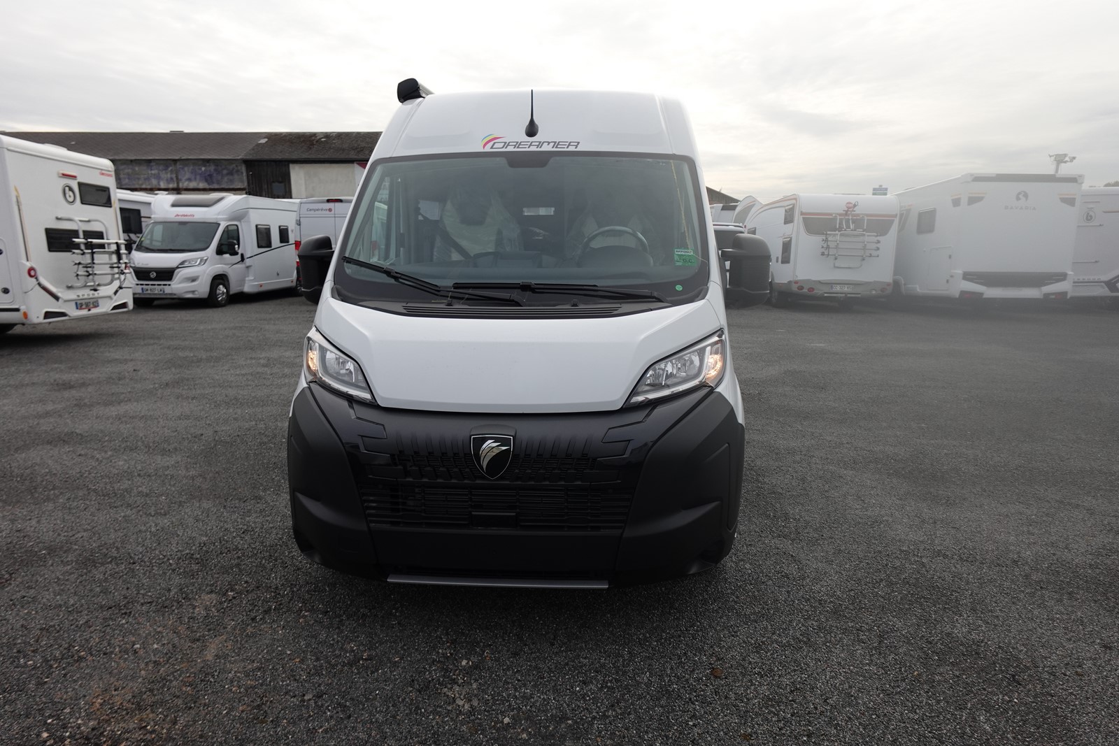 Fourgon aménagé comprenant un salon avant panoramique, un réfrigérateur, une salle d’eau avec douche et WC, une cuisine avec de nombreux rangements et des lits jumeaux.