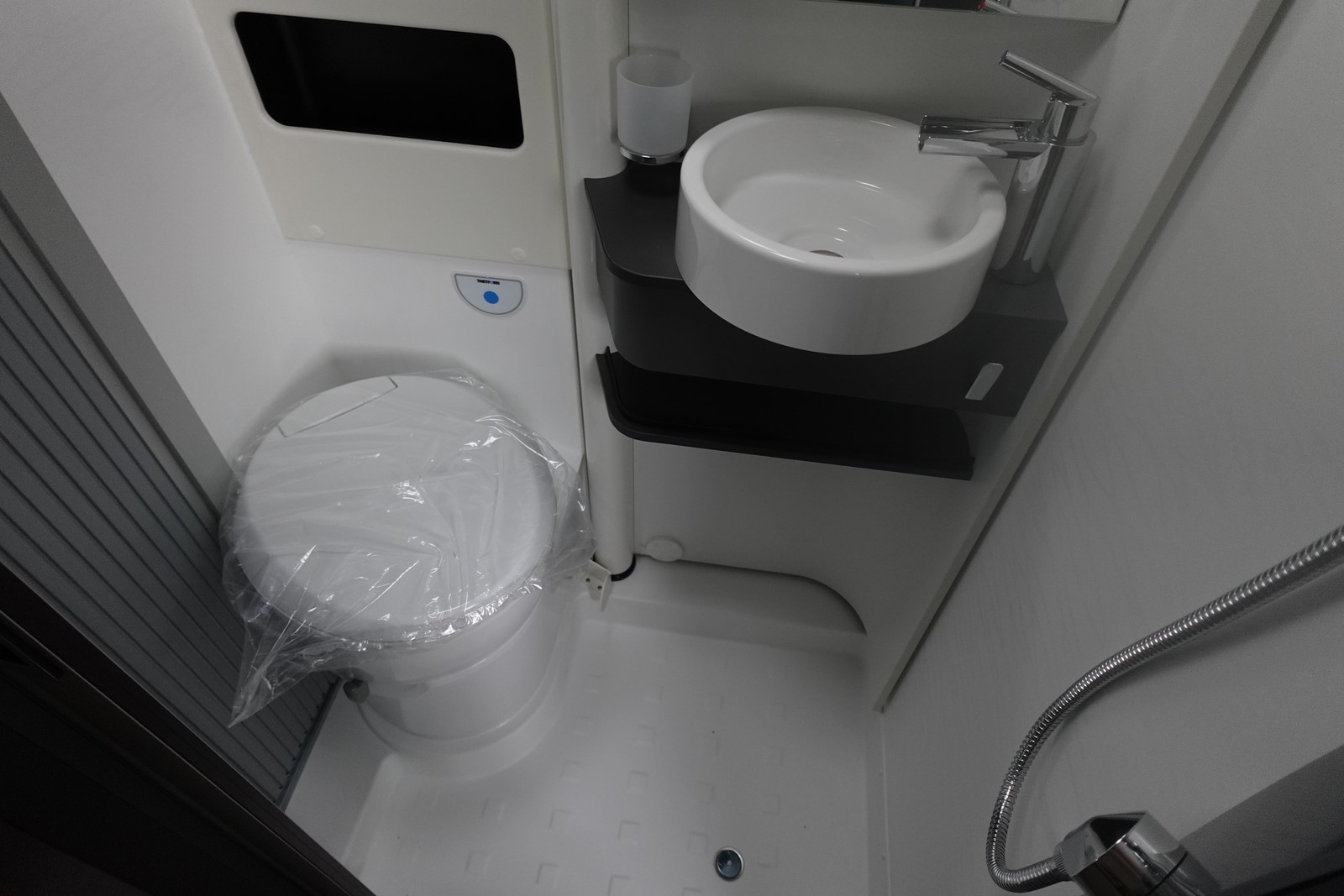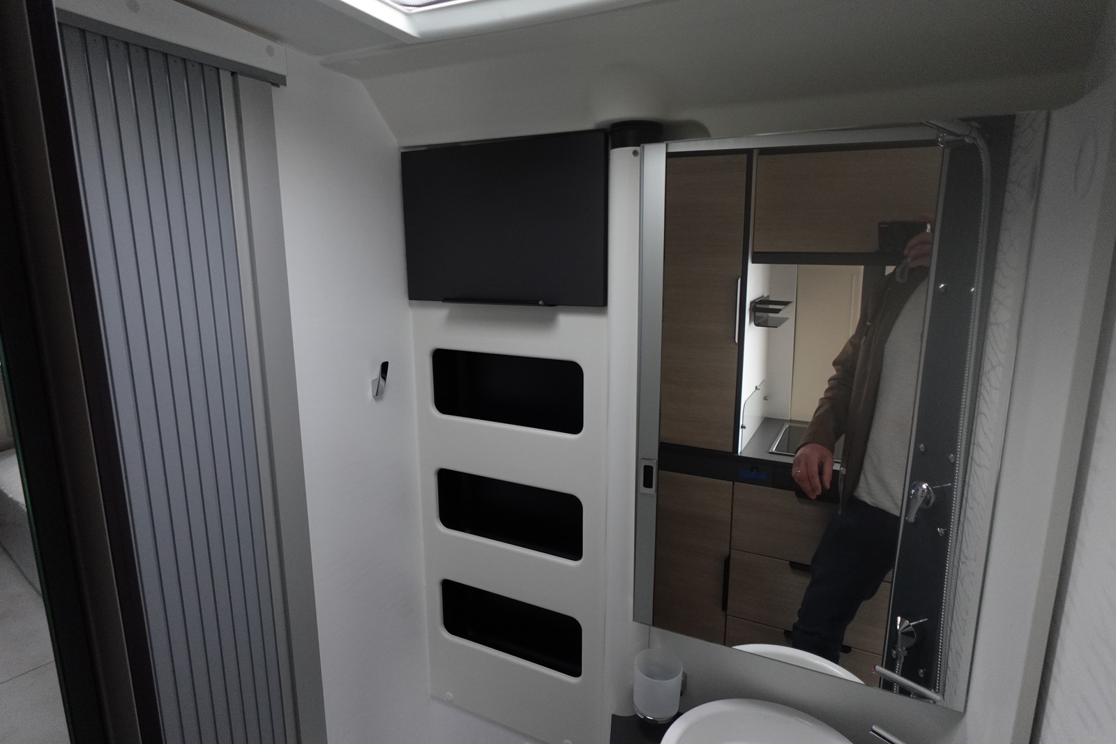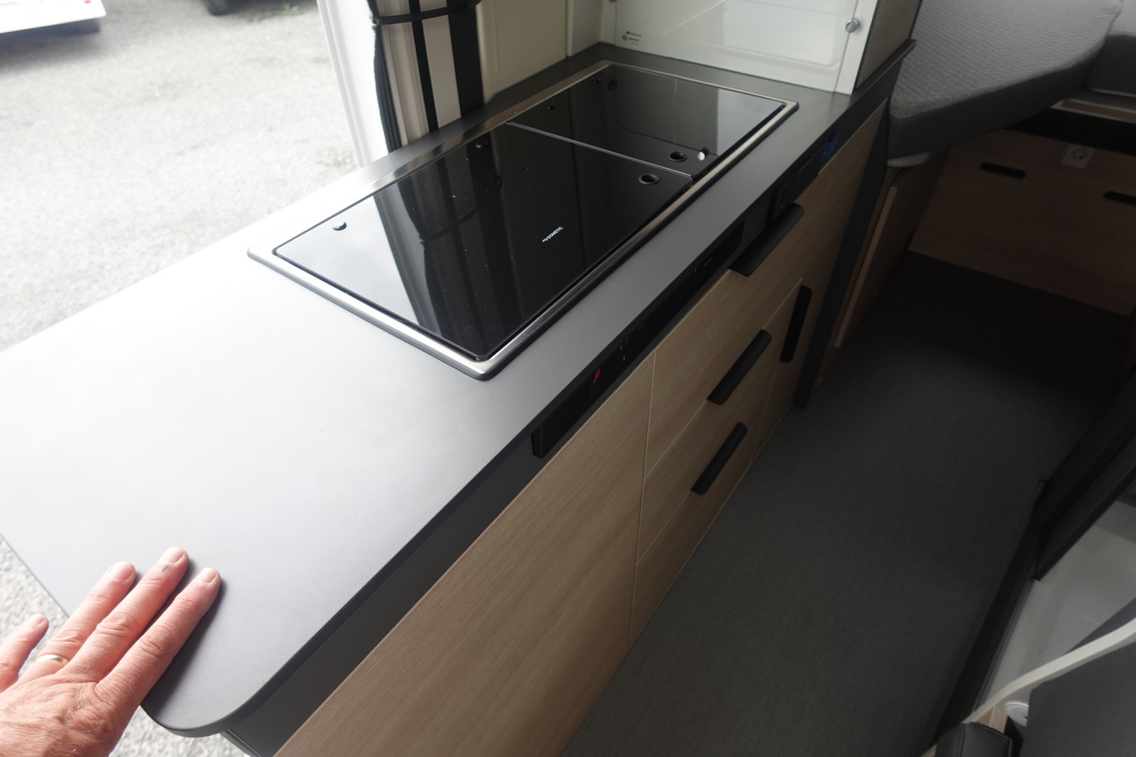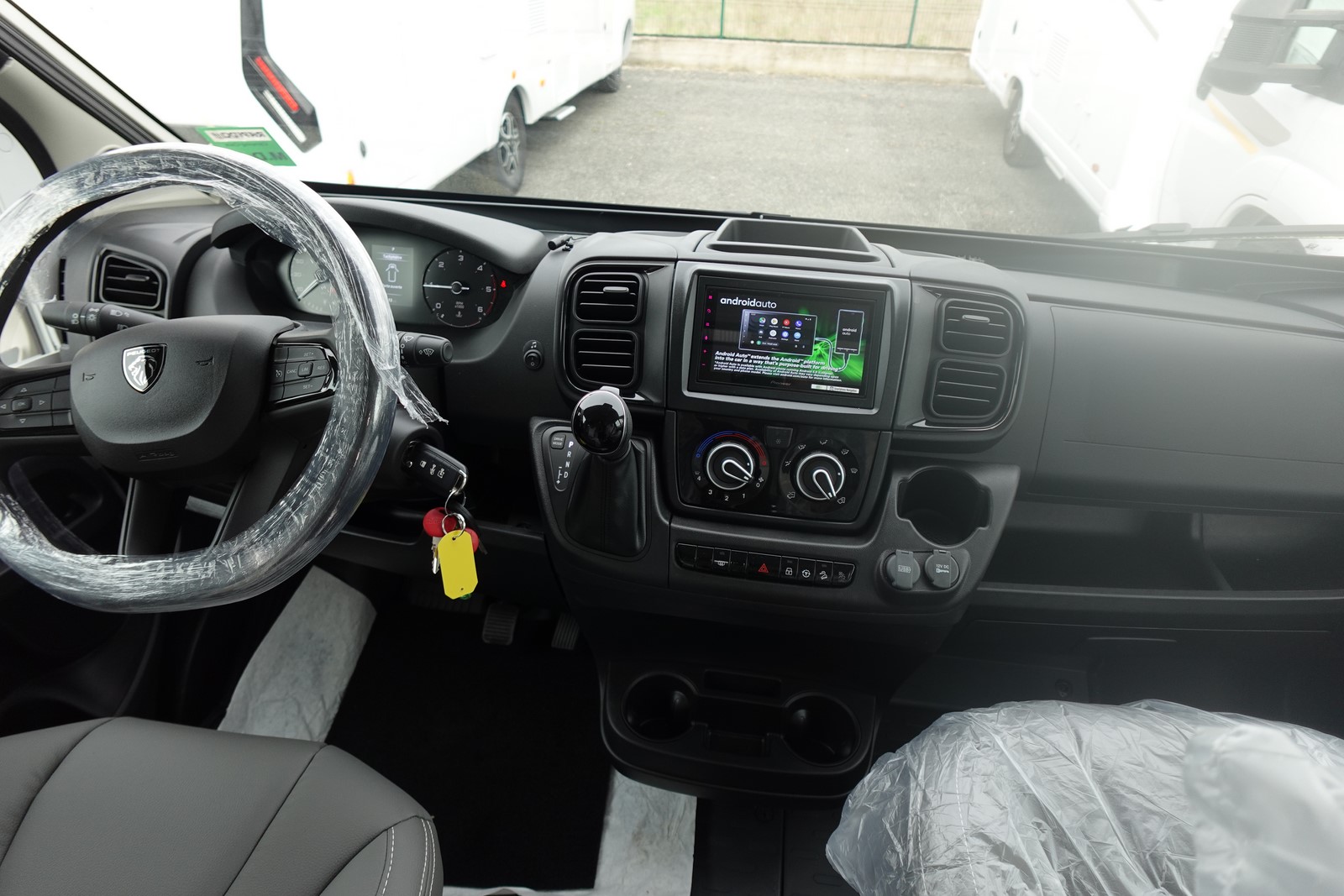 Fourgon aménagé comprenant un salon avant panoramique, un réfrigérateur, une salle d’eau avec douche et WC, une cuisine avec de nombreux rangements et des lits jumeaux.