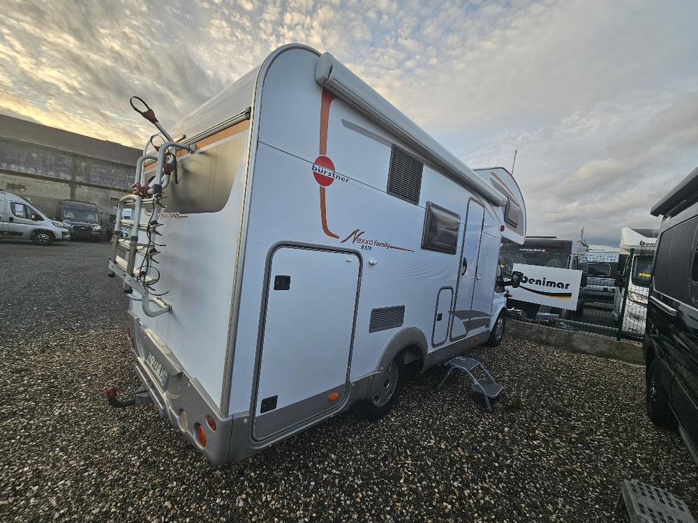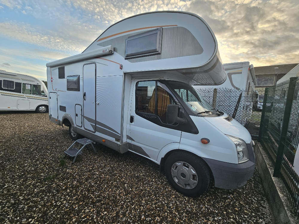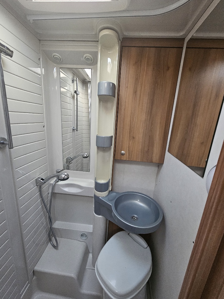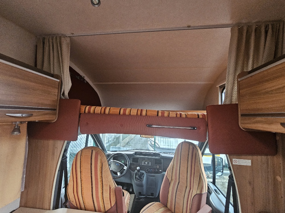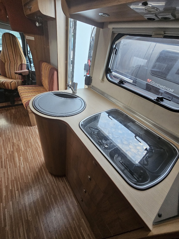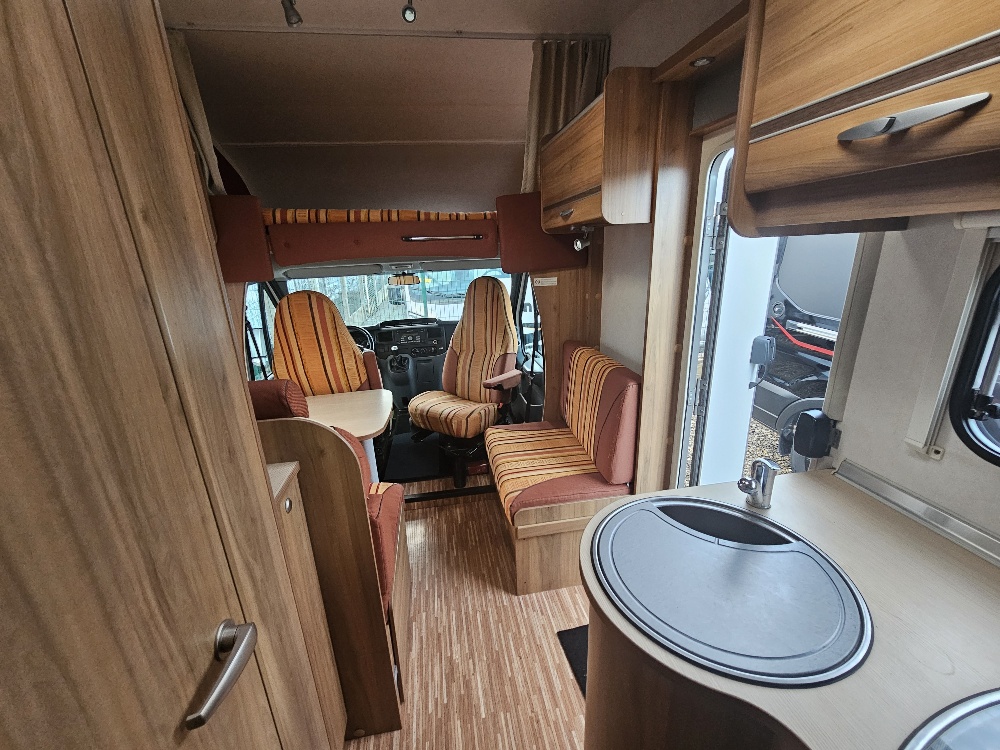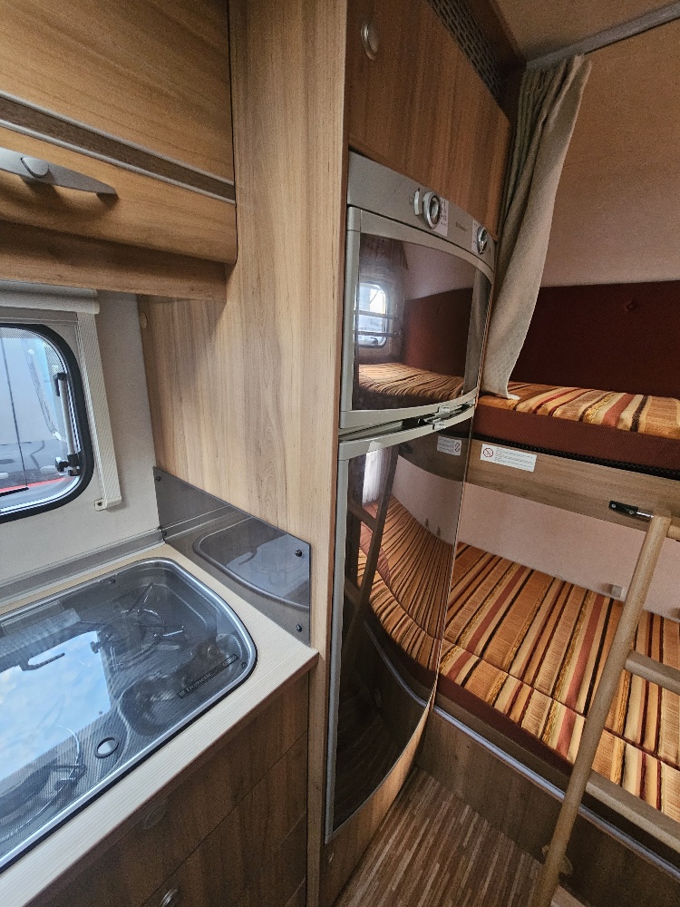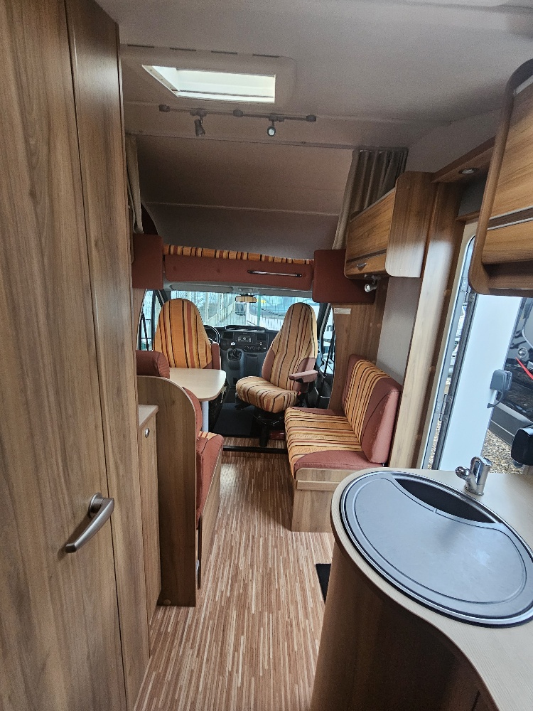 Capucine familiale comprenant des lits superposés à l’arrière, une salle d’eau avec douche et WC, une cuisine avec de nombreux rangements, un salon avant panoramique et un grand couchage 2 personnes au-dessus de la cabine.