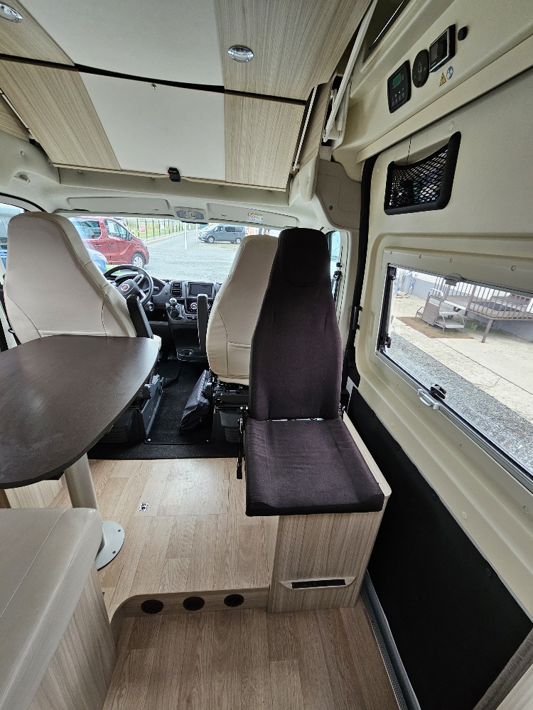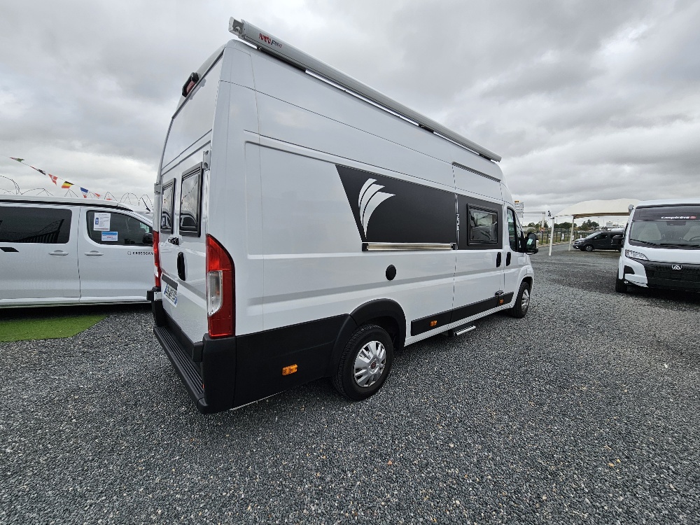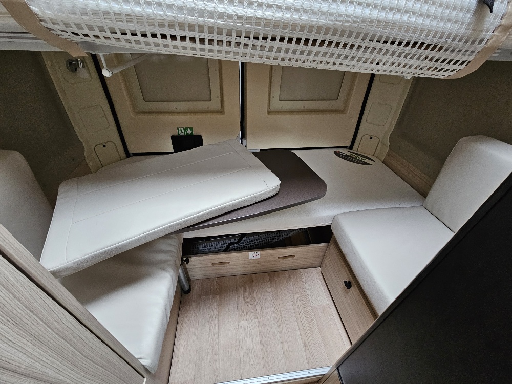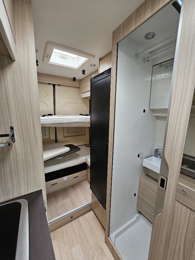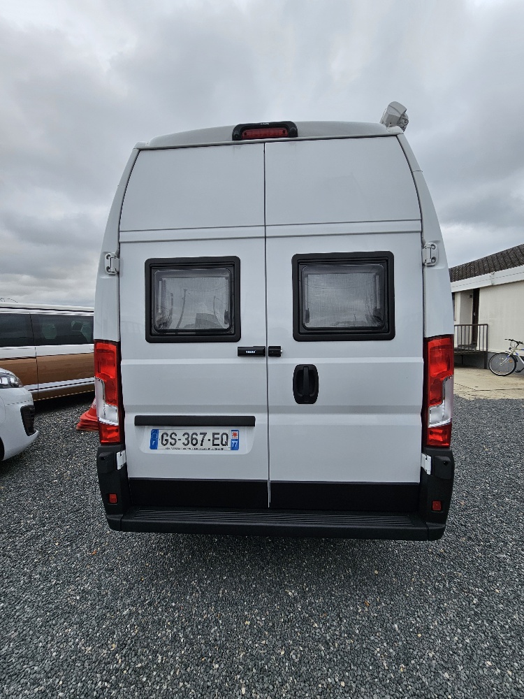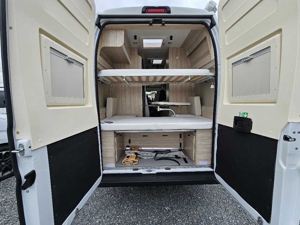 Fourgon aménagé familial comprenant un salon avant panoramique, une salle d’eau avec douche et WC, des lits superposés arrière avec salon enfant, une cuisine avec de nombreux rangements et un lit de pavillon 2 places. 5 places couchage et 5 places carte grise.