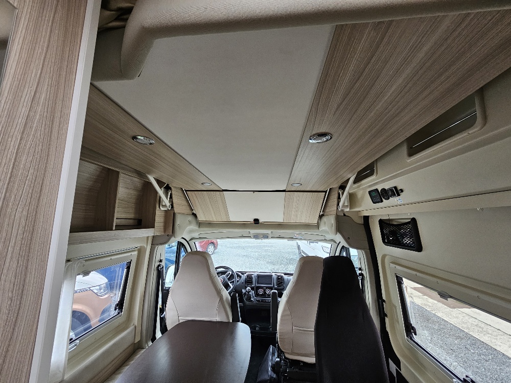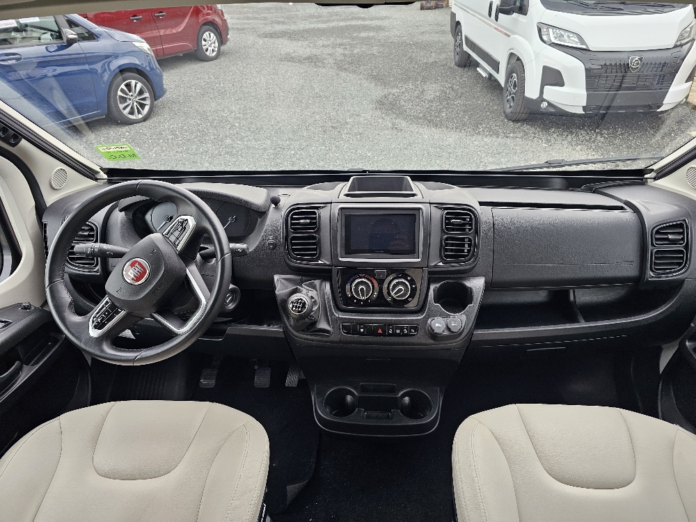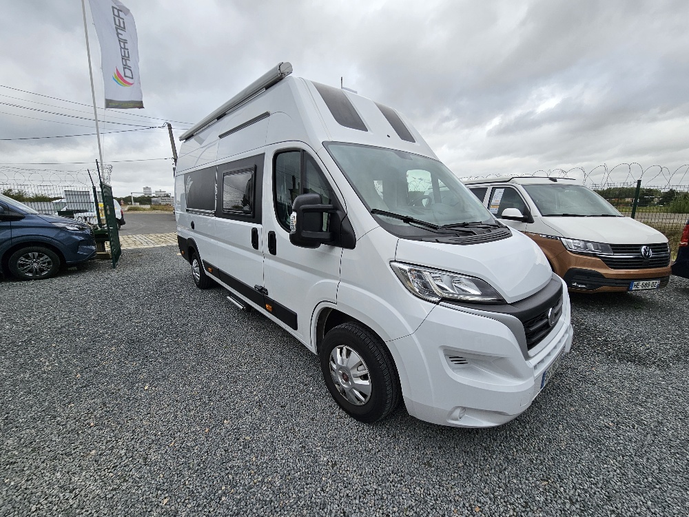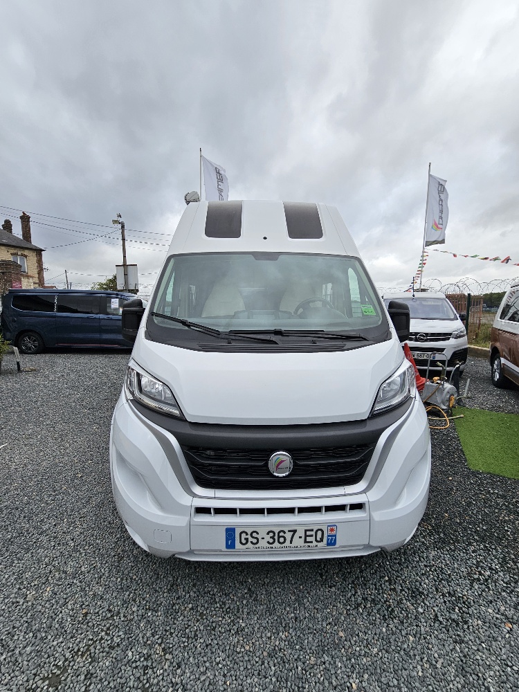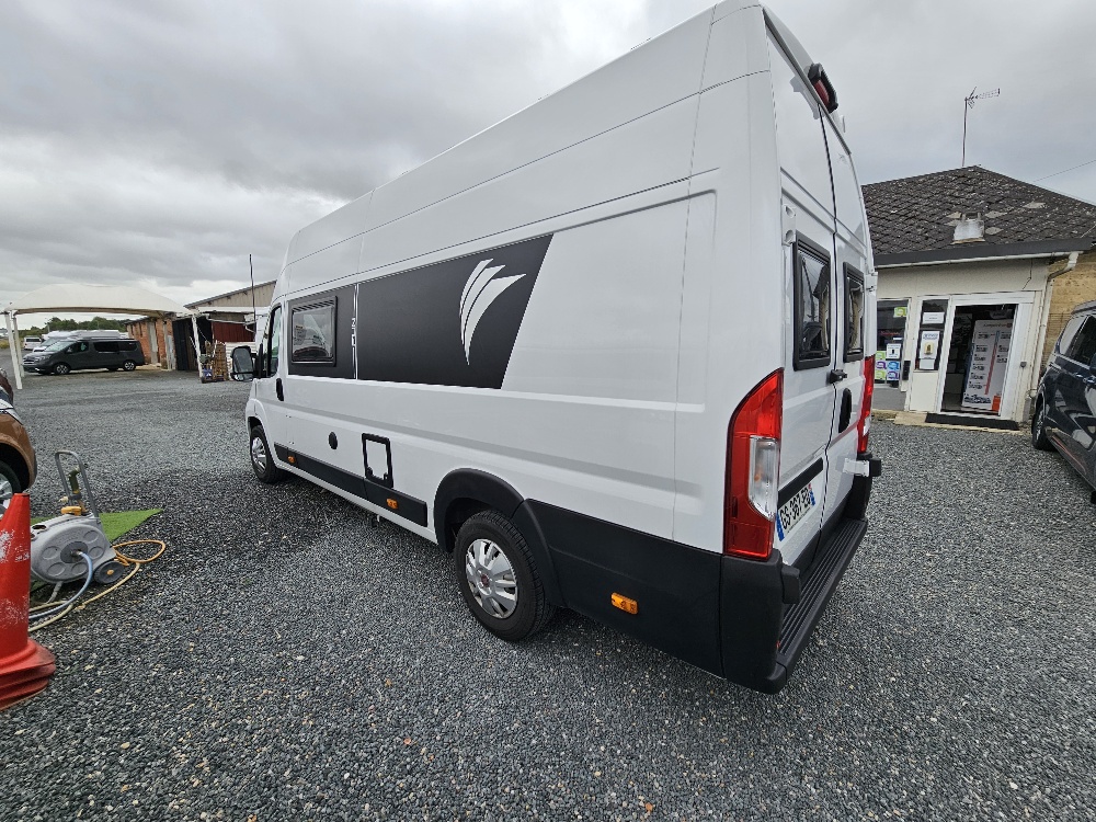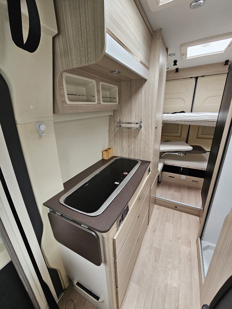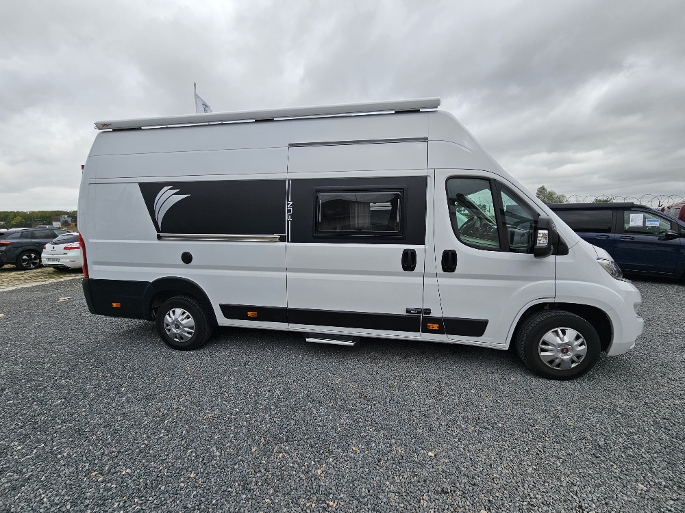 Fourgon aménagé familial comprenant un salon avant panoramique, une salle d’eau avec douche et WC, des lits superposés arrière avec salon enfant, une cuisine avec de nombreux rangements et un lit de pavillon 2 places. 5 places couchage et 5 places carte grise.